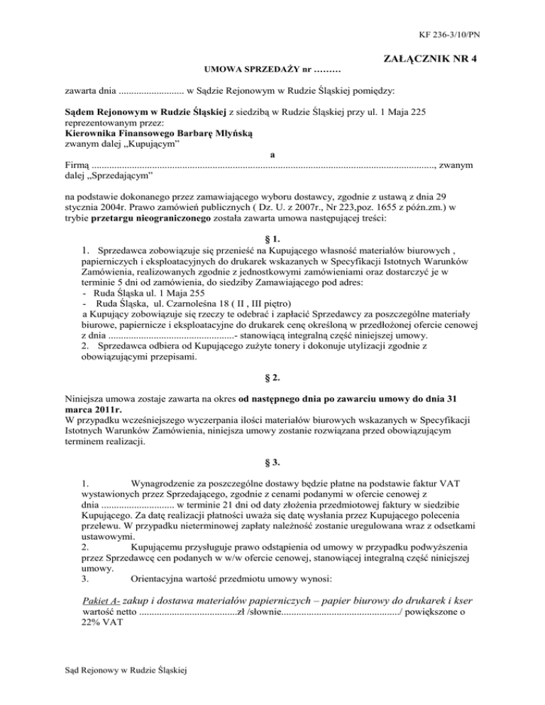 KF 236-3/10/PN ZAŁĄCZNIK NR 4 UMOWA SPRZEDAŻY nr ……… zawarta dnia .......................... w Sądzie Rejonowym w Rudzie Śląskiej pomiędzy: Sądem Rejonowym w Rudzie Śląskiej z siedzibą w Rudzie Śląskiej przy ul. 1 Maja 225 reprezentowanym przez: Kierownika Finansowego Barbarę Młyńską zwanym dalej „Kupującym” a Firmą ........................................................................................................................................, zwanym dalej „Sprzedającym” na podstawie dokonanego przez zamawiającego wyboru dostawcy, zgodnie z ustawą z dnia 29 stycznia 2004r. Prawo zamówień publicznych ( Dz. U. z 2007r., Nr 223,poz. 1655 z późn.zm.) w trybie przetargu nieograniczonego została zawarta umowa następującej treści: § 1. 1. Sprzedawca zobowiązuje się przenieść na Kupującego własność materiałów biurowych , papierniczych i eksploatacyjnych do drukarek wskazanych w Specyfikacji Istotnych Warunków Zamówienia, realizowanych zgodnie z jednostkowymi zamówieniami oraz dostarczyć je w terminie 5 dni od zamówienia, do siedziby Zamawiającego pod adres: - Ruda Śląska ul. 1 Maja 255 - Ruda Śląska, ul. Czarnoleśna 18 ( II , III piętro) a Kupujący zobowiązuje się rzeczy te odebrać i zapłacić Sprzedawcy za poszczególne materiały biurowe, papiernicze i eksploatacyjne do drukarek cenę określoną w przedłożonej ofercie cenowej z dnia ..................................................- stanowiącą integralną część niniejszej umowy. 2. Sprzedawca odbiera od Kupującego zużyte tonery i dokonuje utylizacji zgodnie z obowiązującymi przepisami. § 2. Niniejsza umowa zostaje zawarta na okres od następnego dnia po zawarciu umowy do dnia 31 marca 2011r. W przypadku wcześniejszego wyczerpania ilości materiałów biurowych wskazanych w Specyfikacji Istotnych Warunków Zamówienia, niniejsza umowy zostanie rozwiązana przed obowiązującym terminem realizacji. § 3. 1. Wynagrodzenie za poszczególne dostawy będzie płatne na podstawie faktur VAT wystawionych przez Sprzedającego, zgodnie z cenami podanymi w ofercie cenowej z dnia ............................. w terminie 21 dni od daty złożenia przedmiotowej faktury w siedzibie Kupującego. Za datę realizacji płatności uważa się datę wysłania przez Kupującego polecenia przelewu. W przypadku nieterminowej zapłaty należność zostanie uregulowana wraz z odsetkami ustawowymi. 2. Kupującemu przysługuje prawo odstąpienia od umowy w przypadku podwyższenia przez Sprzedawcę cen podanych w w/w ofercie cenowej, stanowiącej integralną część niniejszej umowy. 3. Orientacyjna wartość przedmiotu umowy wynosi: Pakiet A- zakup i dostawa materiałów papierniczych – papier biurowy do drukarek i kser wartość netto .......................................zł /słownie.............................................../ powiększone o 22% VAT Sąd Rejonowy w Rudzie Śląskiej KF 236-3/10/PN Pakiet B - zakup i dostawa materiałów papierniczych – koperty wartość netto .......................................zł /słownie.............................................../ powiększone o 22% VAT Pakiet C - zakup i dostawa materiałów biurowych – galanteria biurowa wartość netto .......................................zł /słownie.............................................../ powiększone o 22% VAT Pakiet D - zakup i dostawa materiałów eksploatacyjnych do drukarek wartość netto .......................................zł /słownie.............................................../ powiększone o 22% VAT 4. Rozliczenie umowy nastąpi na podstawie faktycznie wykonanych zamówień u Sprzedawcy. § 4. 1. W przypadku wystąpienia zwłoki w dostawach Kupujący może : - wyznaczyć Sprzedawcy dodatkowy termin wykonania zamówienia - odstąpić od umowy, gdy zwłoka przekroczy 10 dni . 2. W przypadku nieterminowej dostawy będą naliczane kary w wysokości 0,2% wartości tego zamówienia za każdy dzień zwłoki, 3. W przypadku zerwania umowy Sprzedawca zapłaci Kupującemu karę w wysokości 10% wartości umowy. § 5. Każda ze stron może rozwiązać niniejszą umowę w trybie natychmiastowym w formie pisemnej w przypadku rażącego naruszenia warunków umowy. § 6. Każda ze stron ma prawo wypowiedzenia umowy bez podania przyczyny z jednomiesięcznym okresem wypowiedzenia złożonym na piśmie. Termin wypowiedzenia biegnie od pierwszego dnia miesiąca następnego po doręczeniu drugiej stronie wypowiedzenia. § 7. Wszelkie zmiany niniejszej umowy wymagają formy pisemnej pod rygorem nieważności. § 8. W sprawach nieuregulowanych niniejsza umową zastosowanie mają przepisy Kodeksu Cywilnego oraz ustawy z dnia 29 stycznia 2004r. Prawo zamówień publicznych. § 9. Umowę sporządzono w dwóch jednobrzmiących egzemplarzach , po jednym dla każdej ze stron. Załącznik do umowy: 1. oferta cenowa z dn. ................................ 2. SIWZ KUPUJĄCY: Sąd Rejonowy w Rudzie Śląskiej SPRZEDAJĄCY: