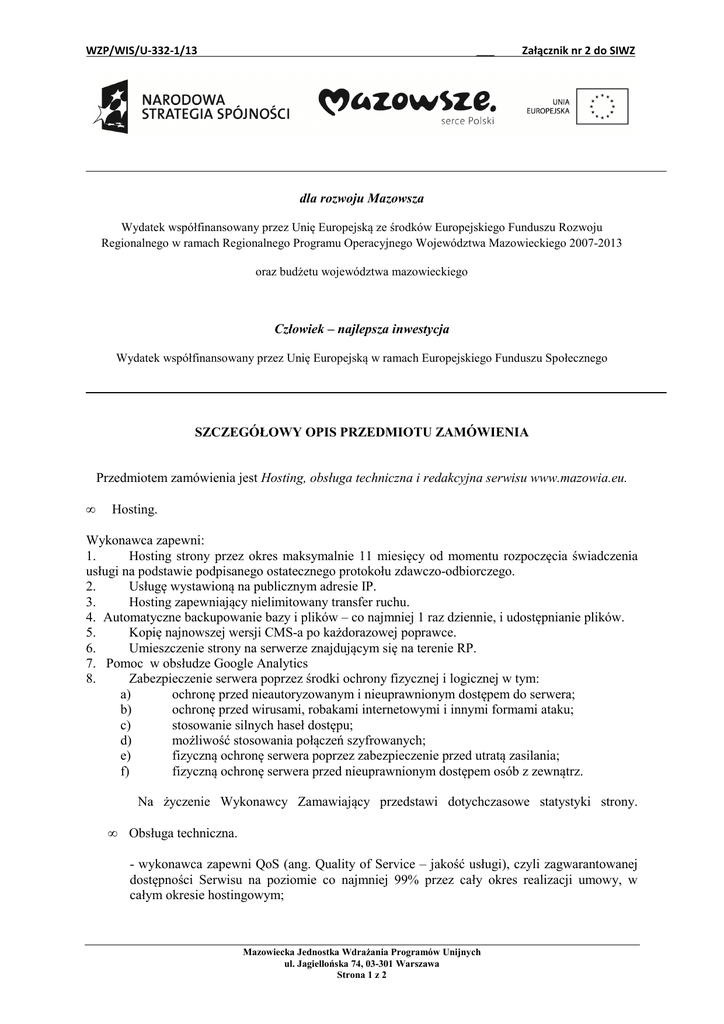 WZP/WIS/U-332-1/13 ___ Załącznik nr 2 do SIWZ dla rozwoju Mazowsza Wydatek współfinansowany przez Unię Europejską ze środków Europejskiego Funduszu Rozwoju Regionalnego w ramach Regionalnego Programu Operacyjnego Województwa Mazowieckiego 2007-2013 oraz budżetu województwa mazowieckiego Człowiek – najlepsza inwestycja Wydatek współfinansowany przez Unię Europejską w ramach Europejskiego Funduszu Społecznego SZCZEGÓŁOWY OPIS PRZEDMIOTU ZAMÓWIENIA Przedmiotem zamówienia jest Hosting, obsługa techniczna i redakcyjna serwisu www.mazowia.eu. • Hosting. Wykonawca zapewni: 1. Hosting strony przez okres maksymalnie 11 miesięcy od momentu rozpoczęcia świadczenia usługi na podstawie podpisanego ostatecznego protokołu zdawczo-odbiorczego. 2. Usługę wystawioną na publicznym adresie IP. 3. Hosting zapewniający nielimitowany transfer ruchu. 4. Automatyczne backupowanie bazy i plików – co najmniej 1 raz dziennie, i udostępnianie plików. 5. Kopię najnowszej wersji CMS-a po każdorazowej poprawce. 6. Umieszczenie strony na serwerze znajdującym się na terenie RP. 7. Pomoc w obsłudze Google Analytics 8. Zabezpieczenie serwera poprzez środki ochrony fizycznej i logicznej w tym: a) ochronę przed nieautoryzowanym i nieuprawnionym dostępem do serwera; b) ochronę przed wirusami, robakami internetowymi i innymi formami ataku; c) stosowanie silnych haseł dostępu; d) możliwość stosowania połączeń szyfrowanych; e) fizyczną ochronę serwera poprzez zabezpieczenie przed utratą zasilania; f) fizyczną ochronę serwera przed nieuprawnionym dostępem osób z zewnątrz. Na życzenie Wykonawcy Zamawiający przedstawi dotychczasowe statystyki strony. • Obsługa techniczna. - wykonawca zapewni QoS (ang. Quality of Service – jakość usługi), czyli zagwarantowanej dostępności Serwisu na poziomie co najmniej 99% przez cały okres realizacji umowy, w całym okresie hostingowym; Mazowiecka Jednostka Wdrażania Programów Unijnych ul. Jagiellońska 74, 03-301 Warszawa Strona 1 z 2 WZP/WIS/U-332-1/13 ___ Załącznik nr 2 do SIWZ - wykonawca zapewni średni czas wyświetlania na stronę nie będzie wyższy niż 2 sekundy, jednocześnie dla 60 wywołań jednorazowych; - wykonawca zapewni, że portal mazowia.eu będzie działał bez zarzutu min. dla 11 tys. użytkowników, 30 tys. odwiedzin w skali tygodnia; - wykonawca zapewni serwer dedykowany, - wykonawca zapewni redundantną infrastrukturę, - wykonawca, w przypadku problemów z funkcjonowaniem portalu, po zaaplikowaniu aktualizacji dostarczonych przez producenta systemu operacyjnego wykorzystywanego przez Zamawiającego w ramach gwarancji będzie dokonywał niezbędnych modyfikacji w oprogramowaniu Serwisu, wykonawca musi podjąć naprawę awarii uniemożliwiającą, prawidłowe działanie Serwisu (gdy portal nie publikuje prawidłowo umieszczanych treści, grafików, źle działają poszczególne elementy, aplety, zawiera wirusy spyware’y, trojany, zawiera inne błędy utrudniające odczytanie stron.) najpóźniej w godzinę w dniu roboczym i 6 godzin w dniu wolnym od pracy, od skutecznego poinformowania o awarii (faks, potwierdzenie otrzymania poczty elektronicznej, pisemnego zgłoszenia). Dla pozostałych awarii oraz wykrytych błędów oprogramowania czas usunięcia wynosi 72 godziny, przy czym Wykonawca opracuje w ciągu 24 godzin tymczasowe rozwiązanie zapewniające realizację danej funkcjonalności. - • Obsługa redakcyjna. W ramach obsługi redaktorskiej przewidujemy minimalnie: - - - - prace informatyczne 10 godzin w skali miesiąca, prace graficzne 5 godzin w skali miesiąca, redagowanie 20 godzin w skali miesiąca, wprowadzanie danych przesłanych przez MJWPU tego samego dnia roboczego w godzinach od 800 do 1600, aktualizację portalu internetowego polegającą na wprowadzaniu bieżących informacji w Serwisie w zakresie i na podstawie materiałów dostarczonych przez Zamawiającego w formie elektronicznej oraz zgodnie z ustaleniami poczynionymi z Zamawiającym, obsługę graficzną serwisu polegającą na wykonywaniu zmian w istniejącej szacie graficznej oraz poszczególnych elementach graficznych serwisu, a także na tworzeniu tematycznych elementów graficznych – zgodnie z zapotrzebowaniem zgłaszanym przez Zamawiającego, tworzenie grafik dedykowanych dla uroczystości państwowych, samorządowych, imprez okolicznościowych i innych zdarzeń istotnych dla budowy wizerunku Jednostki (np. banery, warstwy), opracowywanie mechanizmów, automatyzujących publikację danych na Portalu wprowadzenie zmian w kodzie źródłowym serwisu internetowego w obrębie istniejących modułów dla potrzeb zwiększenia funkcjonalności serwisu dla internautów (wartość przebudowy nie większa niż 10 % miesięcznej ceny obsługi). Mazowiecka Jednostka Wdrażania Programów Unijnych ul. Jagiellońska 74, 03-301 Warszawa Strona 2 z 2