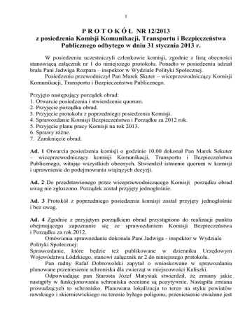 1 P R O T O K Ó Ł NR 12/2013 z posiedzenia Komisji Komunikacji, Transportu i Bezpieczeństwa Publicznego odbytego w dniu 31 stycznia 2013 r. W posiedzeniu uczestniczyli członkowie komisji, zgodnie z listą obecności stanowiącą załącznik nr 1 do niniejszego protokołu. Ponadto w posiedzeniu udział brała Pani Jadwiga Rozpara – inspektor w Wydziale Polityki Społecznej. Posiedzeniu przewodniczył Pan Marek Skuter – wiceprzewodniczący Komisji Komunikacji, Transportu i Bezpieczeństwa Publicznego. Przyjęto następujący porządek obrad: 1. Otwarcie posiedzenia i stwierdzenie quorum. 2. Przyjęcie porządku obrad. 3. Przyjęcie protokołu z poprzedniego posiedzenia Komisji. 4. Sprawozdanie Komisji Bezpieczeństwa i Porządku za 2012 rok. 5. Przyjęcie planu pracy Komisji na rok 2013. 6. Sprawy różne. 7. Zamknięcie obrad. Ad. 1 Otwarcia posiedzenia komisji o godzinie 10.00 dokonał Pan Marek Sekuter – wiceprzewodniczący komisji Komunikacji, Transportu i Bezpieczeństwa Publicznego, witając wszystkich obecnych. Stwierdził istnienie quorum w komisji i uprawnienie do podejmowania wiążących decyzji. Ad. 2 Do przedstawionego przez wiceprzewodniczącego Komisji porządku obrad uwag nie zgłoszono. Porządek został przyjęty jednogłośnie. Ad. 3 Protokół z poprzedniego posiedzenia komisji został przyjęty jednogłośnie i bez uwag. Ad. 4 Zgodnie z przyjętym porządkiem obrad przystąpiono do realizacji punktu obejmującego zapoznanie się ze sprawozdaniem Komisji Bezpieczeństwa i Porządku za rok 2012. Omówienia sprawozdania dokonała Pani Jadwiga - inspektor w Wydziale Polityki Społecznej: Sprawozdanie, które będzie też publikowane w dzienniku Urzędowym Województwa Łódzkiego, stanowi załącznik nr 2 do niniejszego protokołu. Pan radny Rafał Dobrowolski zapytał o wnioskowane w sprawozdaniu planowane przeniesienie schroniska dla zwierząt w miejscowości Kaliszki. Odpowiadając pan Starosta Józef Matysiak stwierdził, że zmiany jakie nastąpiły w funkcjonowaniu schroniska oceniane są pozytywnie. Nastąpiła zmiana prowadzących to schronisko. Planowana lokalizacja to teren na styku powiatów rawskiego i skierniewickiego na terenie byłego poligonu; przeniesienie uważane jest 2 przez Zarząd Powiatu Rawskiego za celowe. Jak zaznaczył Pan Starosta nie ma administracyjnej możliwości zamknięcia tego miejsca gdzie są przetrzymywane zwierzęta, gdyż według prawa nie jest ono schroniskiem bo poprzedniczka nie zgłaszała takiego typu działalności. Komisja Komunikacji, Transportu i Bezpieczeństwa Publicznego przyjęła i zaakceptowała Sprawozdanie Komisji Bezpieczeństwa i Porządku za 2012 rok. Ad. 5 Następny punkt porządku obrad obejmował przyjęcie planu pracy Komisji Komunikacji, Transportu i Bezpieczeństwa Publicznego. Przyjęto następujący plan pracy na 2013 r.: Lp. Wyszczególnienie Termin 1. Ocena stanu bezpieczeństwa publicznego na terenie Powiatu Rawskiego za rok 2012. Styczeń 2. Dokonanie przeglądu dróg powiatowych, mostów i wiaduktów. Wypracowanie planu robót na drogach powiatowych na rok 2013. Marzec/Kwiecień 3. Ocena prowadzonej akcji zimowej w sezonie 2012/2013 Kwiecień 4. Ocena wykonania budżetu za I półrocze 2013 roku. Sierpień 5. Zapoznanie się z przebiegiem prac modernizacyjnych i remontowych dróg powiatowych. Wrzesień 6. Analiza stanu bezpieczeństwa publicznego na terenie powiatu. Październik 7. Ocena wykonania modernizacji i remontów dróg powiatowych, ocena stanu gotowości do okresu zimowego. Informacja o funkcjonowaniu Rawsko-Rogowskiej Kolejki Wąskotorowej. 8. Wstępne przyjęcie planu modernizacji i remontów dróg powiatowych na rok 2014. Wypracowanie planu pracy Komisji na 2014 rok. Listopad Grudzień 3 Ad. 6 W sprawach różnych: Pan Starosta Józef Matysiak poinformował o podpisanym akcie notarialnym na przejęcie od PKP własności nieruchomości wchodzących w skład kolei wąskotorowej w ramach II etapu. Pozostał jeszcze ostatni III etap przejęcia obejmujący głównie Rogów. Pan Starosta Józef Matysiak poinformował o wspólnym stanowisku i wystąpieniu Zarządu Powiatu Rawskiego i Zarządu Powiatu Skierniewickiego przy współudziale Burmistrza Miasta Biała Rawska i Wójta Gminy Kowiesy do Zarządu Województwa Łódzkiego o zmianę kategorii drogi powiatowej Biała Rawska – Huta Zawadzka (przez Zakrzew) na drogę wojewódzką. Ad. 7 Wobec wyczerpania przyjętego porządku obrad, wiceprzewodniczący komisji - Pan Marek Sekuter o godz. 11.00 dokonał zamknięcia posiedzenia komisji. W załączeniu : - wszystkie załączniki wymienione w treści protokołu. Sporządził: Tomasz Góraj. Przewodniczący Komisji: