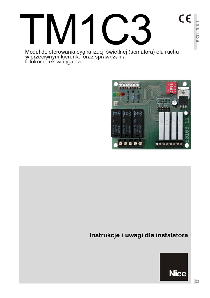POLSKI TM1C3 Moduł do sterowania sygnalizacji świetlnej (semafora) dla ruchu w przeciwnym kierunku oraz sprawdzania fotokomórek wciągania Instrukcje i uwagi dla instalatora 23 POLSKI MODUŁ DODATKOWY TM1C3 OPIS FUNKCJI W celu podłączenia lub odłączenia modułu dodatkowego należy odłączyć zasilanie elektryczne! 4 Funkcje mikroprzełączników Przełącznik 1 --> sprawdzenie bramki fotokomórki wciągania 1 (zewnętrznej) OFF = sprawdzenie WYŁĄCZONE ON = sprawdzenie WŁĄCZONE Przełącznik 2 --> sprawdzenie bramki fotokomórki wciągania 2 (wewnętrznej) OFF = sprawdzenie WYŁĄCZONE ON = sprawdzenie WŁĄCZONE Przełącznik 3 --> 3 sek. ostrzeżenie wstępne sygnalizacji świetlnej tak / nie OFF = ostrzeżenie wstępne WYŁĄCZONE ON = ostrzeżenie wstępne WŁĄCZONE Przełącznik 4 --> nawracanie lub ruch do góry bramy po włączeniu UK, OFF = ruch do góry WYŁĄCZONY ON= ruch do góry WŁĄCZONY 4 Funkcje przekaźników Przełącznik Przełącznik Przełącznik Przełącznik sygnalizacja świetlna wewnętrzna (czerwona/zielona) sygnalizacja świetlna włączona/wyłączona sygnalizacja świetlna zewnętrzna (czerwona/zielona) styk bezpotencjałowy 2 dolny (wskaźnik dolnego przełącznika krańcowego) Przełącznik 5 --> sprawdzenie bramki fotokomórki 2 Przełącznik 6 --> sprawdzenie bramki fotokomórki 1 Przełącznik 7 --> styk bezpotencjałowy 1 górny (wskaźnik górnego przełącznika krańcowego) 4 1 2 3 4 --> --> --> --> Wtyczka dla LED w pokrywie Do wtyczki J10 można podłączyć diodę LED umocowaną w pokrywie. W przypadku usterki jest tutaj podawany kod migowy. Funkcja diody LED w pokrywie jest taka sama jak czerwonej lampy sygnalizacyjnej. 4 Sprawdzenie linii fotokomórek Linie fotokomórek stosowane jako zabezpieczenie wciągania muszą spełniać obowiązujące normy zarówno w odniesieniu do nadajnika, jak i odbiornika. Przy tym nadajnik albo obydwa nadajniki - w wypadku użycia dwóch linii fotokomórek wciągania (wewnętrznej i zewnętrznej) - należy podłączyć do zacisków 10 i 11, lub 12 i 13 modułu dodatkowego TM1C3. Styk przekaźnika odbiornika wywiera tutaj bezpośredni wpływ na obwód zabezpieczający (kierunek DO GÓRY). Podłączenie następuje na płycie podstawowej TM1T na zacisku X4b/J26. 24 OPIS Wtyczka LED w pokrywie LED (zielona) napięcie sieci LED (żółta) linia fotokomórek - czuwanie LED (czerwona) sprawdzenie linii fotokomórek POLSKI MODUŁ DODATKOWY TM1C3 Bramka fotokomórkowa funkcyjna 1 2 DO GÓRY na zewnątrz 3 Połowa wysokości bramy z EES TAK / NIE 4 5 6 7 8 9 10 11 12 13 Mikroprzełącznik Podłączenie sygnalizacji świetlnej dla ruchu w przeciwnym kierunku R2 1 L1 czerwony zewnętrzny zielony 2 zielony wewnętrzny czerwony 4 R1 3 czerwony zewnętrzny zielony zewnętrzny R3 5 zielony wewnętrzny czerwony wewnętrzny N Sygnalizowanie położeń krańcowych DO GÓRY i NA DÓŁ Bezpotencjałowy 1 (położenie krańcowe górne) Bezpotencjałowy 2 (położenie krańcowe dolne) 6 R7 7 8 9 R4 25 POLSKI MODUŁ DODATKOWY TM1C3 Schemat ideowy testowania fotokomórek wciągania Zasilanie nadajnika fotokomórki 1 (zewnętrznej) R6 R5 Odbiornik fotokomórki 1 (zewnętrzny) 10 + 11 12 13 X4b 5 Nadajnik Odbiornik + +24V Moduł dodatkowy TM1C3 Zasilanie nadajnika fotokomórki 2 (wewnętrznej) Płyta główna TM1T 6 7 8 Nadajnik J25 J26 Odbiornik Odbiornik fotokomórki 2 (wewnętrzny) W przypadku zastosowania dwóch linii fotokomórek jako zabezpieczeń wciągania, styki przekaźnika ( rozwierne ) odbiornika muszą być podłączone szeregowo do zacisku J26 na płycie głównej TM1T. 26 Chroniona prawem autorskim. Przy wykonywaniu przedruku, także fragmentów, konieczne jest uzyskanie naszej zgody. Zastrzegamy sobie prawo do wprowadzenia zmian wynikających z postępu technicznego.
