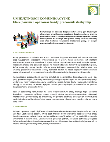 UMIEJĘTNOŚCI KOMUNIKACYJNE które powinien opanować każdy pracownik służby bhp Komunikacja w obszarze bezpieczeństwa pracy jest kluczowym elementem prawidłowego zarządzania bezpieczeństwem pracy w przedsiębiorstwie. 5 umiejętności przedstawionych poniżej to lista obowiązkowa dla każdego behapowca, który chce być słuchany oraz chce budować bezpieczne środowisko pracy, w którym pracownicy będą pracować bezpiecznie. 1. Ustalanie kontekstu Każdy pracownik przychodzi do pracy z własnym bagażem doświadczeń, wspomnieniami oraz wyuczonymi sposobami wykonywania są w pracy. Cześć zachowań jest efektem wychowania, cześć procesu edukacji, a jeszcze inne - są efektem obserwacji kolegów z pracy. Pracownik służby bhp powinien działać na rzecz budowania kultury bezpieczeństwa pracy, która stanie się kulturą bezpieczeństwa pracy każdego z pracowników. Ważne więc, aby wszyscy pracownicy rozumieli szerszy kontekst działań na rzecz poprawy bezpieczeństwa pracy inicjowanych przez pracownika służby bhp oraz funkcję, jaką sami w nich pełnią. Komunikacja z pracownikami powinna składać się z elementów deklaratywnych (opis - jak jest), proceduralnych (co należy zrobić) i wyjaśniających (dlaczego). Na bieżąco należy łączyć wydarzenia rozgrywające się na polu całej firmy z pracą danego działu i budować dzięki temu okazję do rozmowy na temat wpływu działań poszczególnych pracowników na poziom bezpieczeństwa pracy całej firmy. Jeśli w codziennej komunikacji na rzecz bezpieczeństwa pracy brakuje tego ustalania kontekstu i rysowania ogólnego obrazu sytuacji, istnieje zagrożenie rozwoju tzw. „silosowej mentalności”, powodującej, że pracownicy nie potrafią dostrzec, dlaczego ich indywidualne podejście do zasad bezpieczeństwa pracy ma znaczenie dla poziomu bezpieczeństwa pracy całej firmy. 2. Powtarzanie Jednym z powszechnych błędów w zakresie komunikowania tematyki bezpieczeństwa pracy jest tzw. „odhaczania zadań”. Wiele osób traktuje komunikowanie bezpieczeństwa pracy jako jednorazowe zadanie, które można szybko wykonać i „odhaczyć” na swojej liście prac do wykonania w danym dniu. Doświadczenie pokazuje jednak, że ludzie potrzebują usłyszeć informację wielokrotnie zanim ta rzeczywiście do nich dotrze. Komunikacja nie jest czymś, co można odhaczyć na swojej liście „rzeczy do zrobienia”. Budowanie zaufania i wiarygodności przez pracownika służby bhp jest długotrwałym procesem, który polega na konsekwentnym przykazywaniu informacji przez różne środki przekazu. Gdy pracownicy usłyszą komunikat wielokrotnie, istnieje większe prawdopodobieństwo, że go zauważą, uwierzą, i co najważniejsze, podejmą zgodne z nim działanie. 3. Tworzenie atmosfery dialogu i monitorowanie zrozumienia Każdy proces komunikowania obejmuje nie tylko przekazanie informacji, ale także sprawdzenie, czy odbiorcy (np. pracownicy) prawidłowo zrozumieli komunikat. W komunikowaniu tematyki bezpieczeństwa pracy należy się więc upewnić, że przekazana informacja rzeczywiście została wysłuchana i zrozumiana. Pracownik służby bhp powinien więc nauczyć się stwarzać okazje do prowadzenia rozmów, które zapewnią zrozumienie i pozwolą na prawidłową (dwukierunkową) wymianę informacji. Bardzo pomocne z prowadzeniu takich działań jest proszenie odbiorców, aby powtarzali treść komunikatu własnymi słowami. Aby dowiedzieć się, czy pracownik zrozumiał omówienie zasad bezpieczeństwa pracy na danym stanowisku pracy, można zapytać: „Co – Pana/Pani zdaniem – stanowi największe zagrożenie dla człowieka wykonującego pracę na tym właśnie stanowisku?”. Aby sprawdzić czy potrzebuje szerszego kontekstu bądź szczegółów, można zapytać: „Jakie wskazówki wynikają dla Pana/Pani z informacji, którą się z Panem/Panią właśnie podzieliłem?” Zadawanie pytań oraz prowadzenia dialogu pomaga monitorować w czasie rzeczywistym, w jakim stopniu pracownicy rozumieją przekazywane informacje. 4. Słuchanie Dla zwiększenia efektywności komunikacji, konieczne jest sprawdzanie co funkcjonuje dobrze, a co nie przynosi oczekiwanych rezultatów i, co najważniejsze, jak można to poprawić. Efekty te można osiągnąć dzięki uważnemu słuchaniu. Aby uzyskać rzeczowe i przydatne odpowiedzi należy zadawać szerokie, pogłębione, otwarte pytania, które pozwalają słuchaczowi poprowadzić rozmowę w wybranym przez siebie kierunku, np.: „Jak wyobrażasz sobie …” „Jakie alternatywne działania brałeś pod uwagę?” Należy także prosić pracowników o informację zwrotną i co najważniejsze – wdrażać ich pomysły i uwagi, aby wiedzieli, że ich głos ma znaczenie. Podejście do informacji otrzymywanych od pracowników ma ogromne znaczenie dla budowania szczerej i głębokiej komunikacji. Nawet jeżeli aktualna sytuacja w firmie uniemożliwia wykorzystanie informacji otrzymanych od pracowników, bardzo ważne jest poinformowanie ich o tym. Okazanie wdzięczności za uzyskane informacje sprawi, że pracownicy poczują się docenieni i zrozumieją, że ich głosy są ważne dla lepszego funkcjonowania przedsiębiorstwa. 5. Wzywanie do działania W trakcie procesu przekazywania informacji należy mieć na uwadze cel prowadzonych działań - komunikaty mają skłaniać odbiorców do działania. Należy więc pamiętać, że bez wezwania do działania komunikaty pozostaną wyłącznie suchymi informacjami. Informacje dotyczące zasad bezpiecznej pracy mają skłonić pracowników do wykonywania pracy w sposób bezpieczny. Planując proces komunikacji dotyczący bezpieczeństwa pracy zawsze należy określić sobie, jakie zmiany w sposobie zachowania się pracowników powinny nastąpić w wyniku prowadzonych działań. Pracownicy muszą więc zostać poinformowani w sposób konkretny i przejrzysty, czego dokładnie oczekuje się od nich. Dobrze też posługiwać s