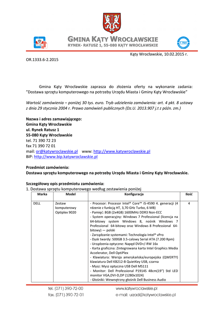 GMINA KĄTY WROCŁAWSKIE RYNEK- RATUSZ 1, 55-080 KĄTY WROCŁAWSKIE Kąty Wrocławskie, 10.02.2015 r. OR.1333.6-2.2015 Gmina Kąty Wrocławskie zaprasza do złożenia oferty na wykonanie zadania: ”Dostawa sprzętu komputerowego na potrzeby Urzędu Miasta i Gminy Kąty Wrocławskie” Wartość zamówienia – poniżej 30 tys. euro. Tryb udzielenia zamówienia: art. 4 pkt. 8 ustawy z dnia 29 stycznia 2004 r. Prawo zamówień publicznych (Dz.U. 2013.907 j.t z późn. zm.) Nazwa i adres zamawiającego: Gmina Kąty Wrocławskie ul. Rynek Ratusz 1 55-080 Kąty Wrocławskie tel. 71 390 72 23 fax 71 390 72 01 mail: [email protected] www: http://www.katywroclawskie.pl BIP: http://www.bip.katywroclawskie.pl Przedmiot zamówienia: Dostawa sprzętu komputerowego na potrzeby Urzędu Miasta i Gminy Kąty Wrocławskie. Szczegółowy opis przedmiotu zamówienia: 1. Dostawa sprzętu komputerowego według zestawienia poniżej Marka DELL Model Zestaw komputerowy Optiplex 9020 Konfiguracja Ilość - Procesor: Procesor Intel® Core™ i5-4590 4. generacji (4 rdzenie z funkcją HT, 3,70 GHz Turbo, 6 MB) - Pamięć: 8GB (2x4GB) 1600MHz DDR3 Non-ECC - System operacyjny: Windows 7 Professional (licencja na 64-bitowy system Windows 8, nośnik Windows 7 Professional 64-bitowy oraz Windows 8 Professional 64bitowy) — polski - Zarządzanie systemami: Technologia Intel® vPro - Dysk twardy: 500GB 3.5-calowy Serial ATA (7.200 Rpm) - Urządzenia optyczne: Napęd DVD+/-RW 16x - Karta graficzna: Zintegrowana karta Intel Graphics Media Accelerator, Dell OptiPlex - Klawiatura: Wersja amerykańska/europejska (QWERTY) klawiatura Dell KB212-B QuietKey USB, czarna - Mysz: Mysz optyczna USB Dell MS111 - Monitor: Dell Professional P1914S 48cm(19") Std LED monitor VGA,DVI-D,DP (1280x1024) - Głośniki: Wewnętrzny głośnik Dell Business Audio 4 GMINA KĄTY WROCŁAWSKIE RYNEK- RATUSZ 1, 55-080 KĄTY WROCŁAWSKIE HP CZ256A+U1U81E HP CF278A+U5Z49E HP CM752A+UG075E HP G1X85A+U6M54E FUJITSU MICROSOFT fi-7160 FQC-06939 - Głośniki: External Dell AX210CR Black USB - Kit - Rozszerzone pakiety usług: Pięcioletni pakiet ProSupport i program naprawy u klienta następnego dnia roboczego. - Usługa zachowania dysku twardego: Pięcioletnia ochrona danych - usługa "Zachowaj swój dysk twardy". Drukarka HP CLJ Ent M651dn (PN: CZ256A ) wraz z dodatkową polisą HP CarePack na okres 3 lat (PN: U1UJ8E) Drukarka HP LaserJet Pro 400 M401dn (PN: CF278A ) wraz z dodatkową polisą HP CarePack na 3 lata (w miejscu eksploatacji , następny dzień roboczy) (PN: U5Z49E) Drukarka HP OfficeJet Pro 8100 WiFi (PN: CM752A) wraz z dodatkową polisą HP CarePack na 3 lata (wymiana sprzętu w następny dniu roboczym) (PN: UG075E) Drukarka HP Officejet 7612 A3 WiFi MFP (PN: G1X85A) wraz z dodatkową polisą HP CarePack na 3 lata (wymiana sprzętu w następny dniu roboczym) (PN: U6M54E) Skaner szczelinowy Fujitsu fi-7160 Microsoft OEM Windows Pro 8.1 x64 Polish 1pk DVD 2 1 1 1 1 1 2. Dostarczone urządzenia muszą spełniać następujące wymagania techniczne: a) muszę być fabrycznie nowe, b) muszą być wolne od wad, c) muszą posiadać nienaruszone cechy pierwotnego opakowania, d) muszą być wyprodukowane w okresie 6 miesięcy od daty dostawy Nieprzekraczalny termin realizacji Zamówienia: - dla zestawów komputerowych DELL oraz systemu operacyjnego MS Windows 8.1 do dnia 23.02.2015 roku. - dla pozostałych urządzeń do dnia 15.03.2015 roku. Opis sposobu przygotowania oferty: 1. Każdy Wykonawca może złożyć tylko jedną ofertę. 2. Zamawiający nie dopuszcza składania ofert wariantowych. 3. Zamawiający nie dopuszcza składania ofert częściowych. 4. Strony oferty powinny być ponumerowane i parafowane. 5. Oferta powinna być sporządzona w języku polskim, w formie pisemnej, na formularzu stanowiącym załącznik nr 1. Zamawiający dopuszcza składanie ofert w formie elektronicznej. Opis sposobu obliczenia ceny oferty: 1. Cena brutto oferty, podana przez Wykonawcę powinna obejmować wszelkie koszty związane z prawidłowym wykonaniem zamówienia. 2. W formularzu ofertowym (Załącznik nr 1 do zapytania ofertowego) Wykonawca winien podać całkowitą cenę brutto zawierającą całkowite wynagrodzenie Wykonawcy związane z wykonaniem zamówienia. GMINA KĄTY WROCŁAWSKIE RYNEK- RATUSZ 1, 55-080 KĄTY WROCŁAWSKIE 3. Wszystkie wpisywane ceny i wartości powinny być wyliczone z dokładnością do 1 grosza, wszystkie obliczenia winny być dokonywane z dokładnością do dwóch miejsc po przecinku. 4. Cena oferty i składniki cenotwórcze podane przez Wykonawcę będą stałe przez okres realizacji umowy i nie będą mogły podlegać zmianie. 5. Wykonawca określi cenę oferty z VAT w złotych polskich 6. Zamawiający nie przewiduje możliwości rozliczeń w walutach obcych. Rozliczenia między Wykonawcą a Zamawiającym będą dokonywane w złotych polskich. 7. Zamawiający informuje, że nie przewiduje możliwości udzielenia wykonawcy zaliczek na poczet wykonania zamówienia. Kryteria wyboru oferty: 1. Zamawiający dokona oceny ofert, spośród ofert nie podlegających odrzuceniu, biorąc pod uwagę jako wyłączne kryterium - cenę oferty. 2. Oceniana oferta zawierająca najniższą cenę - uzyska 100 pkt., 3. Oceny pozostałych, nie odrzuconych ofert obliczone zostaną w następujący sposób: ilość punktów = (cena oferty najkorzystniejszej / cena oferty badanej) x 100 pkt 4. Zamawiający udzieli zamówienia Wykonawcy, którego oferta spełni wszystkie określone wymagania oraz uzyska największą liczbę punktów. Okres związania ofertą wynosi 30 dni od terminu składania ofert. Termin i miejsce składania ofert: 1. Oferty należy składać w siedzibie Zamawiającego w Biurze Obsługi Klienta – parter pokój 10, ul. Rynek Ratusz 1, 55-080 Kąty Wrocławskie lub na adres e-mail: [email protected]. Dla ofert przesłanych do Zamawiającego, liczy się data i godzina dostarczenia oferty do siedziby Zamawiającego, w przypadku poczty elekt