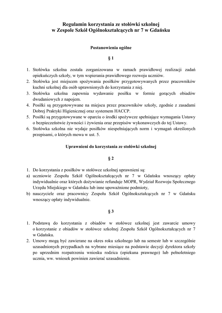 Regulamin korzystania ze stołówki szkolnej w Zespole Szkół Ogólnokształcących nr 7 w Gdańsku Postanowienia ogólne §1 1. Stołówka szkolna została zorganizowana w ramach prawidłowej realizacji zadań opiekuńczych szkoły, w tym wspierania prawidłowego rozwoju uczniów. 2. Stołówka jest miejscem spożywania posiłków przygotowywanych przez pracowników kuchni szkolnej dla osób uprawnionych do korzystania z niej. 3. Stołówka szkolna zapewnia wydawanie posiłku w formie gorących obiadów dwudaniowych z napojem. 4. Posiłki są przygotowywane na miejscu przez pracowników szkoły, zgodnie z zasadami Dobrej Praktyki Higienicznej oraz systemem HACCP. 5. Posiłki są przygotowywane w oparciu o środki spożywcze spełniające wymagania Ustawy o bezpieczeństwie żywności i żywienia oraz przepisów wykonawczych do tej Ustawy. 6. Stołówka szkolna nie wydaje posiłków niespełniających norm i wymagań określonych przepisami, o których mowa w ust. 5. Uprawnieni do korzystania ze stołówki szkolnej §2 1. Do korzystania z posiłków w stołówce szkolnej uprawnieni są: a) uczniowie Zespołu Szkół Ogólnokształcących nr 7 w Gdańsku wnoszący opłaty indywidualnie oraz których dożywianie refunduje MOPR, Wydział Rozwoju Społecznego Urzędu Miejskiego w Gdańsku lub inne upoważnione podmioty, b) nauczyciele oraz pracownicy Zespołu Szkół Ogólnokształcących nr 7 w Gdańsku wnoszący opłaty indywidualnie. §3 1. Podstawą do korzystania z obiadów w stołówce szkolnej jest zawarcie umowy o korzystanie z obiadów w stołówce szkolnej Zespołu Szkół Ogólnokształcących nr 7 w Gdańsku. 2. Umowy mogą być zawierane na okres roku szkolnego lub na semestr lub w szczególnie uzasadnionych przypadkach na wybrane miesiące na podstawie decyzji dyrektora szkoły po uprzednim rozpatrzeniu wniosku rodzica (opiekuna prawnego) lub pełnoletniego ucznia, ww. wniosek powinien zawierać uzasadnienie. Wydawanie posiłków §4 1. Za wydawanie posiłków odpowiadają pracownicy stołówki szkolnej. 2. Posiłki wydawane są w dniach realizacji zajęć dydaktyczno-wychowawczych zgodnie z harmonogramem ustalonym przez dyrektora szkoły. 3. Posiłki wydawane są w godzinach otwarcia stołówki, tj. w godz. 10.35 – 13.45 w trakcie przerw pomiędzy zajęciami lekcyjnymi. 4. W przypadku skróconych lekcji godziny wydawania obiadów ulegają zmianie. 5. Uczniowie będący przed zajęciami lub po ich zakończeniu mogą korzystać z obiadów poza przerwami, jednakże wyłącznie w godzinach pracy stołówki. 6. Jadłospis na dany tydzień jest wywieszany na tablicy informacyjnej przy stołówce szkolnej oraz publikowany na stronie internetowej szkoły www.zso7gda.pl. 7. Stołówka szkolna jest jedynym miejscem przeznaczonym do spożywania posiłków przygotowanych przez pracowników kuchni. §5 1. Do korzystania z obiadów upoważnia karta elektroniczna, która wskazuje dni spożywania posiłków. 2. Elektroniczna karta obiadowa jest wydawana uczniom, nauczycielom i pracownikom szkoły odpłatnie. 3. W przypadku zgubienia lub zniszczenia karty należy ją zablokować i wykupić nową. Opłatę uiszcza się przelewem na konto szkoły. Odpłatność za obiady §6 1. Stołówka szkolna przygotowuje obiady dwudaniowe z napojem – nie ma możliwości kupowania tylko jednego z dań. 2. Opłata za korzystanie z posiłku wydawanego w stołówce szkolnej przez uczniów kalkulowana jest wyłącznie w oparciu o koszt żywności użytej do przygotowania posiłku. 3. Opłata za korzystanie z posiłku wydawanego w stołówce szkolnej przez pracowników administracji i obsługi kalkulowana jest w oparciu o koszt żywności użytej do przygotowania posiłku oraz opodatkowana podatkiem VAT. 4. Opłata za korzystanie z posiłku wydawanego w stołówce szkolnej przez nauczycieli kalkulowana jest w oparciu o rzeczywisty koszt przygotowania posiłku, uwzględniający również koszt wynagrodzenia pracowników stołówki i koszt utrzymania stołówki. 5. Opłaty za korzystanie z posiłku są uaktualniane na początku każdego roku szkolnego. §7 1. Opłat za obiady można dokonywać wyłącznie na wydzielony rachunek bankowy szkoły (w tytule przelewu należy podać imię i nazwisko ucznia, klasę, numer karty obiadowej oraz miesiąc, którego dotyczy wpłata). 2. Informacje dotyczące numeru konta rachunku bankowego, na który należy wpłacać opłaty za obiady oraz określające terminy, wysokość i tytuł wpłat na każdy miesiąc są umieszczane na tablicy informacyjnej przy stołówce szkolnej oraz na stronie internetowej szkoły www.zso7gda.pl 3. Termin płatności za obiady to przedostatni dzień roboczy poprzedzającego miesiąca za miesiąc następny. Wyjątek będą stanowić płatności za wrzesień i styczeń. W tym przypadku termin będzie podawany na stronie internetowej szkoły. 4. Za termin płatności uznaje się datę wpływu środków pieniężnych na rachunek bankowy szkoły. 5. Rodzic odpowiada za prawidłową kwotę i prawidłowy opis przelewu. Jeżeli wpłata bankowa będzie za niska na pokrycie całego abonamentu, albo będą odliczenia za nieobecności na obiadach, które nie zostały zgłoszone, wówczas powstanie niedopłata, od której zostaną naliczone odsetki ustawowe za opóźnienie. 6. Dokonując wpłat, nie pomniejszamy ich o nieobecności, które dopiero mają nastąpić. Odwołania obiadów §8 1. Rezygnacje z posiłku można zgłaszać do godz. 9.00 danego dnia roboczego, osobiście lub telefonicznie pod nr (58) 302-85-20 wewn. 123 lub 114 lub e-mailem na adres [email protected]. Przy zgłaszaniu rezygnacji należy podać imię i nazwisko ucznia, numer karty obiadowej i datę nieobecności. 2. W przypadku planowanego wyjścia, wycieczki klasy w porze wydawania obiadów, rezygnację z obiadu zgłasza rodzic lub uczeń. 3. Należność za odwołane obiady zostaje zarachowana na poczet wpłat za następny miesiąc. Należność tę należy rozliczyć przy najbliż