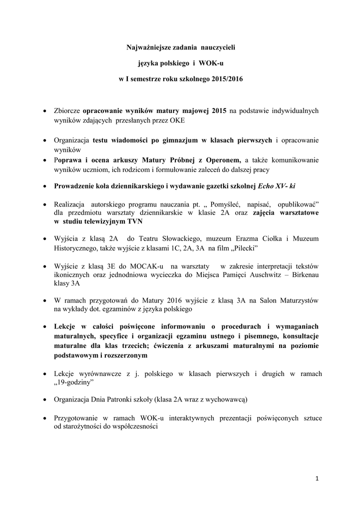 Najważniejsze zadania nauczycieli języka polskiego i WOK-u w I semestrze roku szkolnego 2015/2016 Zbiorcze opracowanie wyników matury majowej 2015 na podstawie indywidualnych wyników zdających przesłanych przez OKE Organizacja testu wiadomości po gimnazjum w klasach pierwszych i opracowanie wyników Poprawa i ocena arkuszy Matury Próbnej z Operonem, a także komunikowanie wyników uczniom, ich rodzicom i formułowanie zaleceń do dalszej pracy Prowadzenie koła dziennikarskiego i wydawanie gazetki szkolnej Echo XV- ki Realizacja autorskiego programu nauczania pt. „ Pomyśleć, napisać, opublikować” dla przedmiotu warsztaty dziennikarskie w klasie 2A oraz zajęcia warsztatowe w studiu telewizyjnym TVN Wyjścia z klasą 2A do Teatru Słowackiego, muzeum Erazma Ciołka i Muzeum Historycznego, także wyjście z klasami 1C, 2A, 3A na film „Pilecki” Wyjście z klasą 3E do MOCAK-u na warsztaty w zakresie interpretacji tekstów ikonicznych oraz jednodniowa wycieczka do Miejsca Pamięci Auschwitz – Birkenau klasy 3A W ramach przygotowań do Matury 2016 wyjście z klasą 3A na Salon Maturzystów na wykłady dot. egzaminów z języka polskiego Lekcje w całości poświęcone informowaniu o procedurach i wymaganiach maturalnych, specyfice i organizacji egzaminu ustnego i pisemnego, konsultacje maturalne dla klas trzecich; ćwiczenia z arkuszami maturalnymi na poziomie podstawowym i rozszerzonym Lekcje wyrównawcze z j. polskiego w klasach pierwszych i drugich w ramach „19-godziny” Organizacja Dnia Patronki szkoły (klasa 2A wraz z wychowawcą) Przygotowanie w ramach WOK-u interaktywnych prezentacji poświęconych sztuce od starożytności do współczesności 1