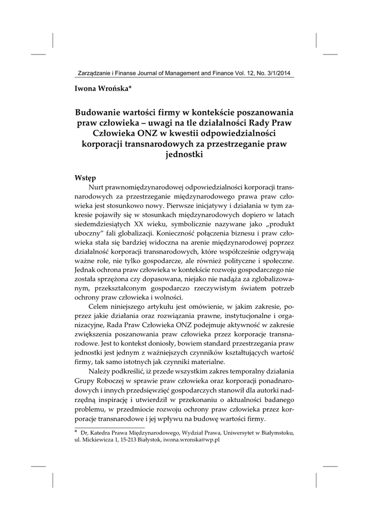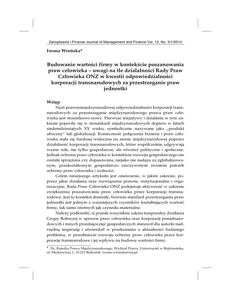 Zarz¹dzanie i Finanse Journal of Management and Finance Vol. 12, No. 3/1/2014 Iwona Wroñska* Iwona Wroñska Budowanie wartoœci firmy w kontekœcie poszanowania praw cz³owieka – uwagi na tle dzia³alnoœci Rady Praw Cz³owieka ONZ w kwestii odpowiedzialnoœci korporacji transnarodowych za przestrzeganie praw jednostki Budowanie wartoœci firmy w kontekœcie poszanowania praw cz³owieka... Wstêp Nurt prawnomiêdzynarodowej odpowiedzialnoœci korporacji transnarodowych za przestrzeganie miêdzynarodowego prawa praw cz³owieka jest stosunkowo nowy. Pierwsze inicjatywy i dzia³ania w tym zakresie pojawi³y siê w stosunkach miêdzynarodowych dopiero w latach siedemdziesi¹tych XX wieku, symbolicznie nazywane jako „produkt uboczny” fali globalizacji. Koniecznoœæ po³¹czenia biznesu i praw cz³owieka sta³a siê bardziej widoczna na arenie miêdzynarodowej poprzez dzia³alnoœæ korporacji transnarodowych, które wspó³czeœnie odgrywaj¹ wa¿ne role, nie tylko gospodarcze, ale równie¿ polityczne i spo³eczne. Jednak ochrona praw cz³owieka w kontekœcie rozwoju gospodarczego nie zosta³a sprzê¿ona czy dopasowana, niejako nie nad¹¿a za zglobalizowanym, przekszta³conym gospodarczo rzeczywistym œwiatem potrzeb ochrony praw cz³owieka i wolnoœci. Celem niniejszego artyku³u jest omówienie, w jakim zakresie, poprzez jakie dzia³ania oraz rozwi¹zania prawne, instytucjonalne i organizacyjne, Rada Praw Cz³owieka ONZ podejmuje aktywnoœæ w zakresie zwiêkszenia poszanowania praw cz³owieka przez korporacje transnarodowe. Jest to kontekst donios³y, bowiem standard przestrzegania praw jednostki jest jednym z wa¿niejszych czynników kszta³tuj¹cych wartoœæ firmy, tak samo istotnych jak czynniki materialne. Nale¿y podkreœliæ, i¿ przede wszystkim zakres temporalny dzia³ania Grupy Roboczej w sprawie praw cz³owieka oraz korporacji ponadnarodowych i innych przedsiêwziêæ gospodarczych stanowi³ dla autorki nadrzêdn¹ inspiracjê i utwierdzi³ w przekonaniu o aktualnoœci badanego problemu, w przedmiocie rozwoju ochrony praw cz³owieka przez korporacje transnarodowe i jej wp³ywu na budowê wartoœci firmy. * Dr, Katedra Prawa Miêdzynarodowego, Wydzia³ Prawa, Uniwersytet w Bia³ymstoku, ul. Mickiewicza 1, 15-213 Bia³ystok, [email protected] 146 Iwona Wroñska Na pocz¹tku omówiona zostanie pokrótce rola czynnika ludzkiego w dzia³alnoœci gospodarczej. Nastêpnie poczyniono uwagi wprowadzaj¹ce w zakresie genezy kszta³towania siê prac w ramach ONZ dotycz¹cych odpowiedzialnoœci korporacji transnarodowych za przestrzeganie praw cz³owieka. W kolejnej czêœci autorka przedstawia zagadnienie odpowiedzialnoœci korporacji transnarodowych za naruszenia praw cz³owieka w pracach Rady Praw Cz³owieka. Omówione s¹ w tej czêœci przyjête akty prawne oraz podejmowane dzia³ania przez specjalne struktury organizacyjne. Artyku³ koñczy próba oceny znaczenia zarówno praktyki, jak i dorobku Rady Praw Cz³owieka w obszarze odpowiedzialnoœci korporacji transnarodowych w prawie miêdzynarodowym za ochronê praw cz³owieka1. W badaniach pos³u¿ono siê przede wszystkim metod¹ analizy dokumentów: krajowych i miêdzynarodowych, g³ównie Rady Praw Cz³owieka ONZ oraz analiz¹ literatury polsko- i anglojêzycznej. Pomocniczo zastosowano równie¿ metodê analizy statystycznej. 1. Czynnik ludzki jako wartoœæ przedsiêbiorstwa Wiele przeprowadzonych badañ wyraŸnie wskazuje, ¿e ocena wartoœci podmiotu gospodarczego to nie tylko analiza czynników ekonomicznych. To równie¿ wa¿na ocena przestrzegania praw jednostki, traktowania jej w dzia³alnoœci gospodarczej zgodnie z powszechnymi standardami praw cz³owieka. Przegl¹d adekwatnego piœmiennictwa pozwala stwierdziæ, i¿ w zale¿noœci od traktowania i dzia³añ/czynnoœci dotycz¹cych ludzi w przedsiêbiorstwie osoby pracuj¹ce na rzecz podmiotu najczêœciej s¹ okreœlane mianem: zasobu ludzkiego, kapita³u ludzkiego lub potencja³u ludzkiego [szerzej: Jamka, 2011, s. 84–280]. Analiza ró¿nic we wskazanych pojêciach zosta³a pominiêta, stanowi bowiem szeroki i odrêbny temat merytorycznego definiowania, niemieszcz¹cy siê w ramach omawianego zagadnienia. Autorka na potrzeby niniejszych rozwa¿añ nadaje wszystkim pojêciom jedn¹ wspóln¹ nazwê – czynnik ludzki. 1 W rozwa¿aniach autorka zdecydowa³a siê na u¿ywanie terminu „korporacje transnarodowe”, choæ w literaturze spotkaæ siê mo¿na z doœæ zró¿nicowanym nazewnictwem w zakresie okreœlania miêdzynarodowego charakteru dzia³alnoœci tych podmiotów, np.: korporacje miêdzynarodowe, wielonarodowe czy ponadnarodowe. Przyjêcie terminu „korporacje transnarodowe” na potrzeby opracowania wynika z faktu, i¿ przymiotnik transnarodowy (transnational) jest u¿ywany i wykorzystywany w dokumentach i praktyce ONZ. Budowanie wartoœci firmy w kontekœcie poszanowania praw cz³owieka... 147 Z badañ i stanowisk wynikaj¹cych z doktryny, dzia³alnoœci podmiotów krajowych, organizacji oraz struktur miêdzynarodowych, które zajmuj¹ siê ocen¹ relacji przestrzegania praw cz³owieka w kontekœcie dzia³alnoœci gospodarczej, wynika, ¿e zagro¿enie naruszenia praw cz³owieka powinno byæ traktowane jako: po pierwsze, aspekt oceny wartoœci przedsiêbiorstwa; po drugie, tak¿e jako jeden z wa¿nych elementów ryzyka biznesowego, tak samo istotny jak inne warunki ryzyka typu np. ekonomicznego. Na ³¹czn¹ wartoœæ firmy sk³adaj¹ siê wartoœci materialne oraz niematerialne. Wartoœci materialne to rzeczowe i finansowe aktywa ewidencjonowane w bilansach, pomniejszone o zobowi¹zania, natomiast niematerialne stanowi¹ nadwy¿kê wartoœci rynkowej sk³adników firmy, wynikaj¹c¹ z jej funkcjonowania w sposób dot¹d zorganizowany [Kisiel, 2011, s. 443]. Do wartoœci niematerialnych zalicza siê równie¿ reputacjê firmy, kszta³towan¹ g³ównie przez wysokie kwalifikacje kadry, strukturê zatrudnienia, a tak¿e odpowiednie traktowanie spraw