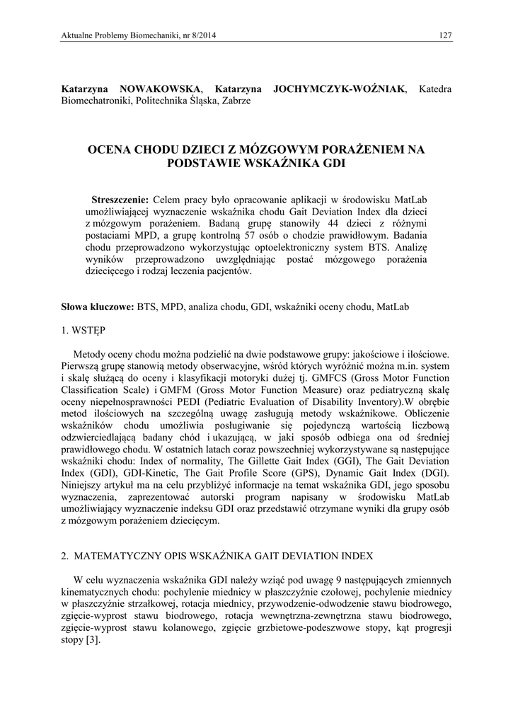 Aktualne Problemy Biomechaniki, nr 8/2014 Katarzyna NOWAKOWSKA, Katarzyna Biomechatroniki, Politechnika Śląska, Zabrze 127 JOCHYMCZYK-WOŹNIAK, Katedra OCENA CHODU DZIECI Z MÓZGOWYM PORAŻENIEM NA PODSTAWIE WSKAŹNIKA GDI Streszczenie: Celem pracy było opracowanie aplikacji w środowisku MatLab umożliwiającej wyznaczenie wskaźnika chodu Gait Deviation Index dla dzieci z mózgowym porażeniem. Badaną grupę stanowiły 44 dzieci z różnymi postaciami MPD, a grupę kontrolną 57 osób o chodzie prawidłowym. Badania chodu przeprowadzono wykorzystując optoelektroniczny system BTS. Analizę wyników przeprowadzono uwzględniając postać mózgowego porażenia dziecięcego i rodzaj leczenia pacjentów. Słowa kluczowe: BTS, MPD, analiza chodu, GDI, wskaźniki oceny chodu, MatLab 1. WSTĘP Metody oceny chodu można podzielić na dwie podstawowe grupy: jakościowe i ilościowe. Pierwszą grupę stanowią metody obserwacyjne, wśród których wyróżnić można m.in. system i skalę służącą do oceny i klasyfikacji motoryki dużej tj. GMFCS (Gross Motor Function Classification Scale) i GMFM (Gross Motor Function Measure) oraz pediatryczną skalę oceny niepełnosprawności PEDI (Pediatric Evaluation of Disability Inventory).W obrębie metod ilościowych na szczególną uwagę zasługują metody wskaźnikowe. Obliczenie wskaźników chodu umożliwia posługiwanie się pojedynczą wartością liczbową odzwierciedlającą badany chód i ukazującą, w jaki sposób odbiega ona od średniej prawidłowego chodu. W ostatnich latach coraz powszechniej wykorzystywane są następujące wskaźniki chodu: Index of normality, The Gillette Gait Index (GGI), The Gait Deviation Index (GDI), GDI-Kinetic, The Gait Profile Score (GPS), Dynamic Gait Index (DGI). Niniejszy artykuł ma na celu przybliżyć informacje na temat wskaźnika GDI, jego sposobu wyznaczenia, zaprezentować autorski program napisany w środowisku MatLab umożliwiający wyznaczenie indeksu GDI oraz przedstawić otrzymane wyniki dla grupy osób z mózgowym porażeniem dziecięcym. 2. MATEMATYCZNY OPIS WSKAŹNIKA GAIT DEVIATION INDEX W celu wyznaczenia wskaźnika GDI należy wziąć pod uwagę 9 następujących zmiennych kinematycznych chodu: pochylenie miednicy w płaszczyźnie czołowej, pochylenie miednicy w płaszczyźnie strzałkowej, rotacja miednicy, przywodzenie-odwodzenie stawu biodrowego, zgięcie-wyprost stawu biodrowego, rotacja wewnętrzna-zewnętrzna stawu biodrowego, zgięcie-wyprost stawu kolanowego, zgięcie grzbietowe-podeszwowe stopy, kąt progresji stopy [3]. 128 K. Nowakowska, K. Jochymczyk-Woźniak Parametry kątowe wyznaczane są co 2% całkowitego przyrostu cyklu chodu (9 kątów x 51 razy = 459 danych), a następnie umieszczane w wektorze chodu g o rozmiarach 459 x 1. ,* ,* +* +* + * + * +* ++- (1) Wektory g uzyskiwane są dla każdego analizowanego cyklu chodu (N - liczba analizowanych cyklów chodu), a następnie łączone w celu utworzenia macierzy chodu G o rozmiarach: 459 x N. (2) [ ] W kolejnym kroku dokonuje się rozkładu SVD macierzy G. Następnie należy wyznaczyć: ̂ ), odległość elementy składowe wektora chodu rzutowanego na k kierunkach ( α,TD Euklidesową d pomiędzy wektorami badanej osoby α, średnią parametrów chodu z grupy || oraz tzw. „surowy” wskaźnik kontrolnej TD o chodzie prawidłowym: || ( ). W celu uzyskania najlepszej jakości wskaźnika należy GDI dla osoby α: obliczyć: dla każdej osoby z grupy kontrolnej, średni wzorzec i odchylenie standardowe oraz zGDI w stosunku do grupy kontrolnej TD dla danej osoby α. ( ( ) ) (3) Otrzymany wynik należy pomnożyć przez 10, a otrzymaną wartość odjąć od 100. Uzyskamy wówczas wskaźnik GDI dla danej osoby α: (4) Gdy GDI ≥ 100, chód badanej osoby jest zbliżony do chodu grupy kontrolnej TD. Każde zmniejszenie wskaźnika GDI o 10 poniżej 100, oznacza jedno odchylenie standardowe od średniej TD. Wskaźnik GDI rozpatrywany jest niezależnie dla każdej kończyny dolnej [3]. 3. MATERIAŁ I METODA 3.1. Charakterystyka badanej grupy Badana grupa składała się z 44 dzieci, w tym 15 dziewczynek i 29 chłopców. Wiek przebadanych dzieci mieścił się w zakresie od 2 do 17 lat. W grupie znajdowali się pacjenci z różnymi postaciami mózgowego porażenia dziecięcego tj. z niedowładem połowicznym lewo- lub prawostronnym, z niedowładem kończyn dolnych oraz z niedowładem czterokończynowym. Dzieci poddane były indywidualnie dobranej rehabilitacji, a część z nich, w celu poprawy funkcji ruchowych, miała przeprowadzane zabiegi ostrzykiwania odpowiednich grup mięśniowych botuliną typu A. Poniższy wykres 1 przedstawia charakterystykę badanej grupy. 47% pacjentów stanowiły dzieci z niedowładem kończyn dolnych, 38% - z niedowładem połowiczym, a 15% - z niedowładem czterokończynowym. Ocena chodu dzieci z mózgowym porażeniem na podstawie wskaźnika GDI 129 7 6 liczba osób 5 4 dziewczęta 3 chłopcy 2 1 0 2 3 4 5 6 7 8 9 10 11 12 13 14 15 16 17 wiek [w latach] Rys. 1. Struktura wieku i płci badanej grupy Natomiast grupa kontrolna („norma”) składała się 57 osób o chodzie prawidłowym, w tym 29 dziewczynek i 28 chłopców. Wiek przebadanych dzieci mieścił się w zakresie od 7 do 17 lat. 3.2. Optoelektroniczny system BTS W celu wyznaczenia parametrów chodu badanej grupy wykorzystany został system BTS Smart-D. System ten pozwala w bardzo dokładny (ilościowy) i obiektywny sposób ocenić czynności układu ruchu. Głównymi elementami składowymi systemu BTS są: 6 kamer na podczerwień (rejestrujących zmiany położenia markerów umieszczonych na ciele pacjenta w przestrzeni), 2 kamery wideo, 2 platformy Kistlera (umożliwiające wyznaczenie 3 składowych reakcji podłoża) oraz komputer z oprogramowaniem. Przy wykorzystaniu tego systemu każda osoba z badanej grupy (w kolejnych badaniach) poddana była pomiarowi statycznemu i indywidualnie dobranej ilości pomiarów dynamicznych, polegający