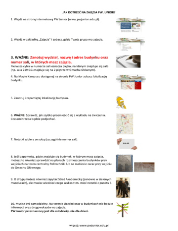JAK DOTRZEĆ NA ZAJĘCIA PW JUNIOR? 1. Wejdź na stronę internetową PW Junior (www.pwjunior.edu.pl). 2. Wejdź w zakładkę „Zajęcia” i zobacz, gdzie Twoja grupa ma zajęcia. 3. WAŻNE: Zanotuj wydział, nazwę i adres budynku oraz numer sali, w których masz zajęcia. Pierwsza cyfra w numerze sali oznacza piętro, na którym znajduje się sala (np. sala 219 GG znajduje się na 2 piętrze w Gmachu Głównym). 4. Na Mapie Kampusu dostępnej na stronie PW Junior zobacz lokalizację budynku. 5. Zanotuj i zapamiętaj lokalizację budynku. 6. WAŻNE: Sprawdź, jak szybko przemieścić się z wykładu na ćwiczenia. Czasami trzeba będzie podjechać. 7. Notatki zabierz ze sobą (szczególnie numer sali). 8. Jeśli zapomnisz, gdzie znajduje się budynek, w którym masz zajęcia, możesz to również sprawdzić na planach rozmieszczenia budynków przy wejściach na teren centralny Politechniki lub na makiecie zaraz przy wejściu do Gmachu Głównego. 9. O drogę możesz również zapytać Straż Akademicką (panowie w zielonych mundurach), ale musisz wiedzieć czego szukasz tzn. mieć notatki z punktu 3. 10. Musisz być samodzielny. Na terenie Uczelni oraz w budynkach nie będzie informacji oraz drogowskazów na zajęcia. PW Junior przeznaczony jest dla młodzieży, nie dla dzieci. więcej: www.pwjunior.edu.pl OBSZAR CENTRALNY POLITECHNIKI WARSZAWSKIEJ Gmach Główny (GG) Gmach Technologii Chemicznej Wydział Transportu Gmach Instytutu Techniki Cieplnej JAK NAJSZYBCIEJ DOTRZEĆ Z GMACHU GŁÓWNEGO NA WYDZIAŁY OBSZARU POŁUDNIOWEGO PW 1. 2. 3. 4. 5. Na przystanku Pl. Politechniki wsiądź w dowolny tramwaj jadący w kierunku Al. Niepodległości. Godziny odjazdów w soboty (aktualne w dniu 11.10.2014r.): 10: 24, 31, 35, 39, 46, 50, 54 11: 01, 05, 09, 16, 20, 24, 31, 35, 39, 46, 50, 54 12: 01, 05, 09, 16, 20, 24 W przypadku długiego czasu oczekiwania na tramwaj radzimy spacer do przystanku Nowowiejska 03 (wg. Google Maps 5min.). Wysiądź na najbliższym przystanku – Nowowiejska. Przejdź na przystanek Nowowiejska 03. Wsiądź do tramwaju nr 17, 33, 41 (kierunek Rakowiecka) Wysiądź na przystanku Kielecka lub Kulskiego. więcej: www.pwjunior.edu.pl parkingi bezpłatne dla Uczestników PW Junior (po okazaniu identyfikatora) parking bezpłatny najszybsza trasa przejazdu między i (wg. Google Maps 5min.) przystanek tramwajowy PL. POLITECHNIKI przystanek tramwajowy NOWOWIEJSKA przystanek tramwajowy KIELECKA przystanek tramwajowy KULSKIEGO więcej: www.pwjunior.edu.pl