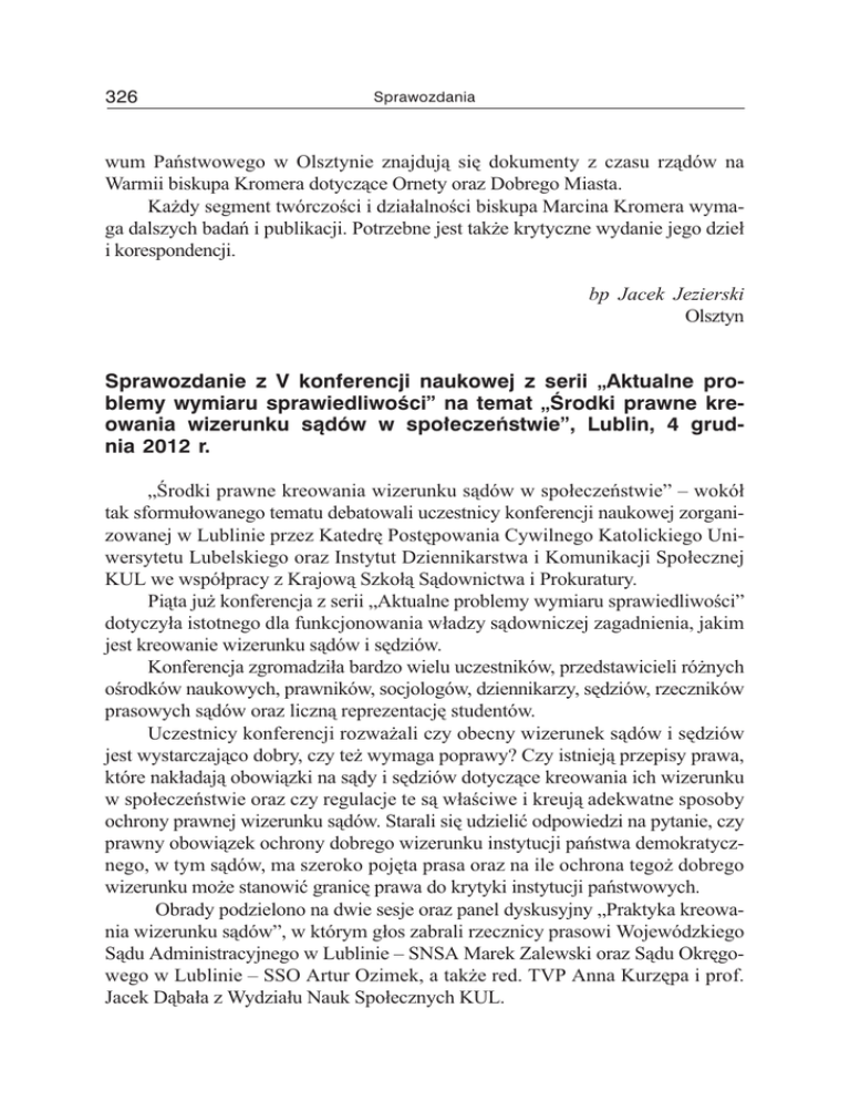 326 Sprawozdania wum Pañstwowego w Olsztynie znajduj¹ siê dokumenty z czasu rz¹dów na Warmii biskupa Kromera dotycz¹ce Ornety oraz Dobrego Miasta. Ka¿dy segment twórczoci i dzia³alnoci biskupa Marcina Kromera wymaga dalszych badañ i publikacji. Potrzebne jest tak¿e krytyczne wydanie jego dzie³ i korespondencji. bp Jacek Jezierski Olsztyn Sprawozdanie z V konferencji naukowej z serii „Aktualne problemy wymiaru sprawiedliwości” na temat „Środki prawne kreowania wizerunku sądów w społeczeństwie”, Lublin, 4 grudnia 2012 r. rodki prawne kreowania wizerunku s¹dów w spo³eczeñstwie wokó³ tak sformu³owanego tematu debatowali uczestnicy konferencji naukowej zorganizowanej w Lublinie przez Katedrê Postêpowania Cywilnego Katolickiego Uniwersytetu Lubelskiego oraz Instytut Dziennikarstwa i Komunikacji Spo³ecznej KUL we wspó³pracy z Krajow¹ Szko³¹ S¹downictwa i Prokuratury. Pi¹ta ju¿ konferencja z serii Aktualne problemy wymiaru sprawiedliwoci dotyczy³a istotnego dla funkcjonowania w³adzy s¹downiczej zagadnienia, jakim jest kreowanie wizerunku s¹dów i sêdziów. Konferencja zgromadzi³a bardzo wielu uczestników, przedstawicieli ró¿nych orodków naukowych, prawników, socjologów, dziennikarzy, sêdziów, rzeczników prasowych s¹dów oraz liczn¹ reprezentacjê studentów. Uczestnicy konferencji rozwa¿ali czy obecny wizerunek s¹dów i sêdziów jest wystarczaj¹co dobry, czy te¿ wymaga poprawy? Czy istniej¹ przepisy prawa, które nak³adaj¹ obowi¹zki na s¹dy i sêdziów dotycz¹ce kreowania ich wizerunku w spo³eczeñstwie oraz czy regulacje te s¹ w³aciwe i kreuj¹ adekwatne sposoby ochrony prawnej wizerunku s¹dów. Starali siê udzieliæ odpowiedzi na pytanie, czy prawny obowi¹zek ochrony dobrego wizerunku instytucji pañstwa demokratycznego, w tym s¹dów, ma szeroko pojêta prasa oraz na ile ochrona tego¿ dobrego wizerunku mo¿e stanowiæ granicê prawa do krytyki instytucji pañstwowych. Obrady podzielono na dwie sesje oraz panel dyskusyjny Praktyka kreowania wizerunku s¹dów, w którym g³os zabrali rzecznicy prasowi Wojewódzkiego S¹du Administracyjnego w Lublinie SNSA Marek Zalewski oraz S¹du Okrêgowego w Lublinie SSO Artur Ozimek, a tak¿e red. TVP Anna Kurzêpa i prof. Jacek D¹ba³a z Wydzia³u Nauk Spo³ecznych KUL. Sprawozdania 327 Refleksj¹ na temat aktualnego wizerunku s¹dów w spo³eczeñstwie w kontekcie medialnych raportów i sonda¿y by³y referaty dr Moniki Torczyñskiej Iustitia civitatis fundamentum spo³eczne obrazy wymiaru sprawiedliwoci oraz mgr Marii Ko³tunowskiej Obraz wymiaru sprawiedliwoci w telewizyjnym serwisie informacyjnym TVP1 Wiadomoci w latach 20082012. Niezwykle wymowna w swej treci by³a równie¿ prezentacja przygotowana przez doktorantów dr hab. Joanny Misztal-Koneckiej. Prezentacja ukazywa³a obraz w³adzy s¹downiczej obecny w mediach w ostatnim roku, a w szczególnoci po wydarzeniach zwi¹zanych z Amber Gold. Z przedstawionych referatów, jak i prezentacji wy³ania³ siê nie najlepszy wizerunek s¹dów i sêdziów, pokazywanych zasadniczo w kontekcie afer czy te¿ wpadek, których sprawcami, b¹d g³ównymi aktorami, mieli byæ w³anie sêdziowie. Niezwykle ciekawe by³y rozwa¿ania dotycz¹ce obowi¹zku poszanowania w³adzy s¹downiczej. Dr hab. Joanna Misztal-Konecka w referacie Szacunek dla s¹dów nale¿ny czy zas³u¿ony? Rozwa¿ania nad obowi¹zkiem poszanowania w³adzy s¹downiczej w dwóch orzeczeniach Europejskiego Trybuna³u Praw Cz³owieka w sprawach polskich, s³usznie uzna³a w konkluzji wyst¹pienia, ¿e autorytet wymiaru sprawiedliwoci mo¿e byæ chroniony sankcjami karnymi i cywilnymi, a szacunek dla s¹dów jest nale¿ny. Kolejni prelegenci rozwa¿ali kwestiê etosu w retoryce (dr Maria J. Gondek Etos w retoryce a problem kreowania wizerunku), przymiotu nieskazitelnoci sêdziego (dr Joanna Bodio Nieskazitelnoæ charakteru jako kwalifikacja zawodowa sêdziego) oraz istnienia normatywnie sformu³owanego obowi¹zku sêdziów w postaci kreowania swojego wizerunku (dr Anna Korzeniewska-Lasota Kreowanie swojego wizerunku prawo czy obowi¹zek sêdziego?). Godne uwagi by³y te¿ spostrze¿enia referentów dotycz¹ce niektórych przes³anek kszta³towania wizerunku sêdziów i s¹dów w spo³eczeñstwie. Wp³ywowi szeroko pojêtej procedury postêpowania na postrzeganie s¹dów powiêcone by³y wyst¹pienia prof. Krzysztofa Knoppka Kreowanie pozytywnego wizerunku s¹dów w oparciu o przepisy postêpowania cywilnego oraz mgr. Macieja Andrzejewskiego Obywatel w kolejce po sprawiedliwoæ oczekiwania pod adresem nowelizacji postêpowania karnego. Podczas konferencji rozwa¿ano te¿ wp³yw na postrzeganie s¹dów takich przes³anek, jak informatyzacja (dr Edyta Gapska Upowszechnienie elektronicznej informacji o dzia³alnoci s¹dów a spo³eczny obraz wymiaru sprawiedliwoci, dr Piotr Telusiewicz Orzeczenia i pisma procesowe dorêczane pozwanemu w EPU jako element kreowania wizerunku s¹dów w spo³eczeñstwie), realizacja prawa do s¹du (mgr Katarzyna Grzelak-Bach S¹downictwo admini- 328 Sprawozdania stracyjne odbiór spo³eczny realizacji prawa do s¹du), rozpoznanie sprawy w rozs¹dnym terminie (dr Jaros³aw Szczechowicz Wp³yw skargi na naruszenie prawa strony do rozpoznania sprawy cywilnej w rozs¹dnym terminie na wizerunek s¹du) oraz jawnoæ rozprawy s¹dowej (dr Krystyna Szczechowicz, dr Robert Dziembowski Prawne gwarancje dostêpu mediów do rozprawy s¹dowej a sprawozdawczoæ prasowa). Wyst¹pienia prelegentów, jak i informacje przekazane przez rzeczników prasowych s¹dów, sta³y siê asumptem do o¿ywionej dyskusji, w której podkrelono wagê dba³oci, przez s¹dy i ka¿dego sêdziego z osobna, o pozytywny wizerunek w³adzy s¹downiczej. Konferencja by³a niezwykle wa¿nym g³osem w toczonej coraz czêciej dyskusji nad szeroko pojêtym statusem w³adzy s¹downiczej, a zwieñczeniem tego¿ cennego spotkania naukowego bêdzie publikacja pokonferencyjna. Anna Korzeniewska-Las