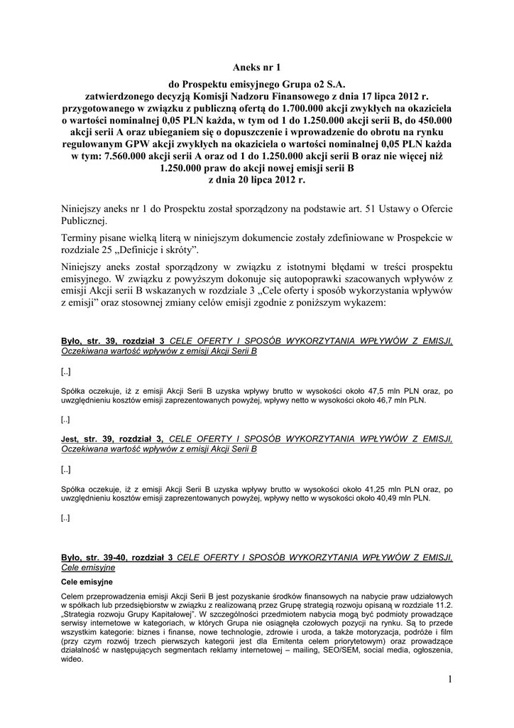 Aneks nr 1 do Prospektu emisyjnego Grupa o2 S.A. zatwierdzonego decyzją Komisji Nadzoru Finansowego z dnia 17 lipca 2012 r. przygotowanego w związku z publiczną ofertą do 1.700.000 akcji zwykłych na okaziciela o wartości nominalnej 0,05 PLN kaŜda, w tym od 1 do 1.250.000 akcji serii B, do 450.000 akcji serii A oraz ubieganiem się o dopuszczenie i wprowadzenie do obrotu na rynku regulowanym GPW akcji zwykłych na okaziciela o wartości nominalnej 0,05 PLN kaŜda w tym: 7.560.000 akcji serii A oraz od 1 do 1.250.000 akcji serii B oraz nie więcej niŜ 1.250.000 praw do akcji nowej emisji serii B z dnia 20 lipca 2012 r. Niniejszy aneks nr 1 do Prospektu został sporządzony na podstawie art. 51 Ustawy o Ofercie Publicznej. Terminy pisane wielką literą w niniejszym dokumencie zostały zdefiniowane w Prospekcie w rozdziale 25 „Definicje i skróty”. Niniejszy aneks został sporządzony w związku z istotnymi błędami w treści prospektu emisyjnego. W związku z powyŜszym dokonuje się autopoprawki szacowanych wpływów z emisji Akcji serii B wskazanych w rozdziale 3 „Cele oferty i sposób wykorzystania wpływów z emisji” oraz stosownej zmiany celów emisji zgodnie z poniŜszym wykazem: Było, str. 39, rozdział 3 CELE OFERTY I SPOSÓB WYKORZYTANIA WPŁYWÓW Z EMISJI, Oczekiwana wartość wpływów z emisji Akcji Serii B [..] Spółka oczekuje, iŜ z emisji Akcji Serii B uzyska wpływy brutto w wysokości około 47,5 mln PLN oraz, po uwzględnieniu kosztów emisji zaprezentowanych powyŜej, wpływy netto w wysokości około 46,7 mln PLN. [..] Jest, str. 39, rozdział 3, CELE OFERTY I SPOSÓB WYKORZYTANIA WPŁYWÓW Z EMISJI, Oczekiwana wartość wpływów z emisji Akcji Serii B [..] Spółka oczekuje, iŜ z emisji Akcji Serii B uzyska wpływy brutto w wysokości około 41,25 mln PLN oraz, po uwzględnieniu kosztów emisji zaprezentowanych powyŜej, wpływy netto w wysokości około 40,49 mln PLN. [..] Było, str. 39-40, rozdział 3 CELE OFERTY I SPOSÓB WYKORZYTANIA WPŁYWÓW Z EMISJI, Cele emisyjne Cele emisyjne Celem przeprowadzenia emisji Akcji Serii B jest pozyskanie środków finansowych na nabycie praw udziałowych w spółkach lub przedsiębiorstw w związku z realizowaną przez Grupę strategią rozwoju opisaną w rozdziale 11.2. „Strategia rozwoju Grupy Kapitałowej”. W szczególności przedmiotem nabycia mogą być podmioty prowadzące serwisy internetowe w kategoriach, w których Grupa nie osiągnęła czołowych pozycji na rynku. Są to przede wszystkim kategorie: biznes i finanse, nowe technologie, zdrowie i uroda, a takŜe motoryzacja, podróŜe i film (przy czym rozwój trzech pierwszych kategorii jest dla Emitenta celem priorytetowym) oraz prowadzące działalność w następujących segmentach reklamy internetowej – mailing, SEO/SEM, social media, ogłoszenia, wideo. 1 W związku z charakterem inwestycji tj. uczestnictwem w negocjacjach na róŜnych etapach i w róŜnym czasie, z róŜnymi potencjalnymi zbywcami bez gwarancji dokonania zakupu, Spółka na Datę Prospektu nie jest w stanie wskazać szczegółów planowanych zakupów, poza poniŜszymi: 1) nabycie jednego podmiotu – szacowana kwota inwestycji ok. 30 mln PLN. Na datę prospektu Grupa o2 prowadzi zaawansowane negocjacje oraz badanie spółki (proces due diligence), 2) nabycie 4 podmiotów - szacowana łączna kwota inwestycji ok. 15 mln PLN. Na datę prospektu Grupa o2 prowadzi negocjacje z 4 podmiotami w róŜnej fazie, 3) nabycie jednego lub kilku podmiotów za ok. 1,7 mln PLN. Na datę prospektu Grupa o2 znajduje się we wstępnej fazie zainteresowania i rozpoznawania efektywności inwestycji. W Ŝadnym z w/w procesów nie zostały w Dacie Prospektu podpisane wiąŜące umowy inwestycyjne lub inne zobowiązania Grupy. Do dnia sporządzenia Prospektu Emitent nie zawarł Ŝadnych umów przedwstępnych ani ostatecznych dotyczących przejęć ani nie rozpoczął procedury zakładania nowych podmiotów. Intencją Spółki jest wykorzystanie środków z Oferty przeznaczonych na cele nr 1 i 2 w roku 2012 a cele nr 3 najpóźniej w 2013 r. [..] Jest, str. 39-40, rozdział 3, CELE OFERTY I SPOSÓB WYKORZYTANIA WPŁYWÓW Z EMISJI, Cele emisyjne Cele emisyjne Celem przeprowadzenia emisji Akcji Serii B jest pozyskanie środków finansowych na nabycie praw udziałowych w spółkach lub przedsiębiorstw w związku z realizowaną przez Grupę strategią rozwoju opisaną w rozdziale 11.2. „Strategia rozwoju Grupy Kapitałowej”. W szczególności przedmiotem nabycia mogą być podmioty prowadzące serwisy internetowe w kategoriach, w których Grupa nie osiągnęła czołowych pozycji na rynku. Są to przede wszystkim kategorie: biznes i finanse, nowe technologie, zdrowie i uroda, a takŜe motoryzacja, podróŜe i film (przy czym rozwój trzech pierwszych kategorii jest dla Emitenta celem priorytetowym) oraz prowadzące działalność w następujących segmentach reklamy internetowej – mailing, SEO/SEM, social media, wideo. W związku z charakterem inwestycji tj. uczestnictwem w negocjacjach na róŜnych etapach i w róŜnym czasie, z róŜnymi potencjalnymi zbywcami bez gwarancji dokonania zakupu, Spółka na Datę Prospektu nie jest w stanie wskazać szczegółów planowanych zakupów, poza poniŜszymi: 1) nabycie jednego podmiotu – szacowana kwota inwestycji ok. 30 mln PLN. Na datę prospektu Grupa o2 prowadzi zaawansowane negocjacje oraz badanie spółki (proces due diligence), 2) nabycie 3 podmiotów - szacowana łączna kwota inwestycji ok. 10,49 mln PLN. Na datę prospektu Grupa o2 prowadzi negocjacje z 3 podmiotami w róŜnej fazie, W Ŝadnym z w/w procesów nie zostały w Dacie Prospektu podpisane wiąŜące umowy inwestycyjne lub inne zobowiązania Grupy. Do dnia sporządzenia Prospektu Emitent nie zawarł Ŝadnych umów przedwstępnych ani ostatecznych dotyczących przejęć ani nie rozpoczął procedury zakładania nowych podmiotów. Intencją Spółki jest wykorzystanie środków z 
