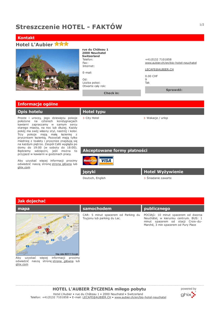 1/2 Streszczenie HOTEL - FAKTÓW Kontakt Hotel L'Aubier rue du Château 1 2000 Neuchatel Switzerland Telefon: Fax: Internet: +41(0)32 7101858 www.aubier.ch/en/bio-hotel-neuchatel [email protected] E-mail: Od: Liczba pokoi: Otwarte cały rok: 0.00 CHF 9 Tak Sprawdź: Check in: Informacje ogólne Opis hotelu Hotel typu Proste i uroczy, jego dziewięciu pokoje położone na czterech kondygnacjach kawiarni zapraszamy w samym sercu starego miasta, na noc lub dłużej. Każdy pokój ma swój własny styl, nastrój i kolor. Trzy pokoje mają małą łazienkę z prysznicem łazienką. Pozostali mają tylko miednicę z toalety i prysznice znajdują się na każdym piętrze. Zespół Café wygląda po domu do 19:00 (w soboty do 18:00). Będziemy wdzięczni, jeśli można to przyjazd w kawiarni w godzinach pracy. City Hotel Wakacje / urlop Akceptowane formy płatności Aby uzyskać więcej informacji prosimy odwiedzić naszą stronę strona główna lub ghix.com języki Hotel Wyżywienie Deutsch, English Śniadanie zawarte Jak dojechać mapa samochodem publicznego CAR: 5 minut spacerem od Parking du Tsyjonu lub parking du Lac. POCIĄG: 10 minut spacerem od dworca Neuchâtel, w kierunku centrum. BUS: 1 minut spacerem od stacji Croix-duMarché, 3 min spacerem od Pury Place Aby uzyskać więcej informacji prosimy odwiedzić naszą stronę strona główna lub ghix.com HOTEL L'AUBIER ŻYCZENIA miłego pobytu Hotel L'Aubier • rue du Château 1 • 2000 Neuchatel • Switzerland Telefon: +41(0)32 7101858 • E-mail: [email protected] • www.aubier.ch/en/bio-hotel-neuchatel 2/2 Hotel L'Aubier Usługi Usługi Hotelowe Kawiarnia / bistro Restauracja Wyposażenie Pokoju Kawiarnia / Kawiarnia Balkon / taras Budzenie Dostęp do internetu No Smoking Telewizja kablowa satelitarna Wanna lub prysznic Windows, aby otworzyć / Bezpieczne Budzik Kąpiel Suszarka do włosów Telewizor Toaleta WiFi Żelazko Odległości i udogodnienia Lokalizacja hotelu autostrady Cable car dzielnica miasta Ścieżka rowerowa stacja kolejowa transportu publicznego Zaplecze rekreacyjne lotnisko Piesze wycieczki Sightseeing tours Komentarze Aby uzyskać więcej informacji prosimy odwiedzić naszą stronę strona główna lub ghix.com HOTEL L'AUBIER ŻYCZENIA miłego pobytu Hotel L'Aubier • rue du Château 1 • 2000 Neuchatel • Switzerland Telefon: +41(0)32 7101858 • E-mail: [email protected] • www.aubier.ch/en/bio-hotel-neuchatel
