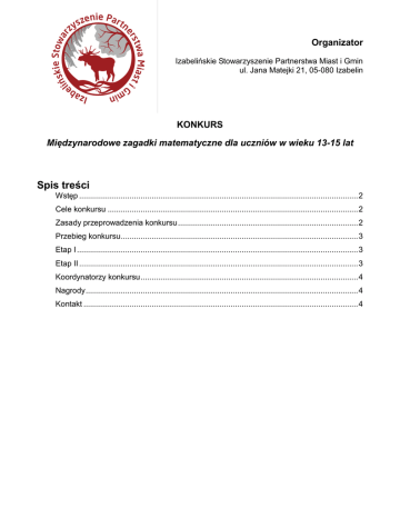 Organizator Izabelińskie Stowarzyszenie Partnerstwa Miast i Gmin ul. Jana Matejki 21, 05-080 Izabelin KONKURS Międzynarodowe zagadki matematyczne dla uczniów w wieku 13-15 lat Spis treści Wstęp ............................................................................................................................... 2 Cele konkursu .................................................................................................................. 2 Zasady przeprowadzenia konkursu .................................................................................. 2 Przebieg konkursu ............................................................................................................ 3 Etap I ................................................................................................................................ 3 Etap II ............................................................................................................................... 3 Koordynatorzy konkursu ................................................................................................... 4 Nagrody ............................................................................................................................ 4 Kontakt ............................................................................................................................. 4 Wstęp Matematyka jest przedmiotem, który nie ma wysokich notowań wśród uczniów. Dla wielu osób w wieku szkolnym jest przyczyną sennych koszmarów i wielu stresów. Nie jest to tylko polska przypadłość, w innych krajach tendencje są podobne. Dlaczego więc nie przestajemy o niej mówić jako o Królowej Nauk ? Konkurs, który chcemy wypromować ma na celu zmianę tej sytuacji i uświadomienie młodzieży jak wiele można zyskać, posiadając umiejętność posługiwania się tą wspaniałą nauką. Sam konkurs również nieprzypadkowo jest skierowany do osób w przedziale wiekowym 1315 lat. To właśnie w tym wieku podejmowane są decyzje o kierunkach kształcenia oraz precyzują się dalsze plany życiowe. Jak zauważył urodzony w Budapeszcie John von Neumann „Jeżeli ludzie nie wierzą, że matematyka jest prosta, to dzieje się tak tylko dlatego, że nie wiedzą, jak skomplikowane jest życie.” Jesteśmy przekonani, że nasza inicjatywa pozwoli młodzieży lepiej rozwiązywać zarówno problemy matematyczne jak i stawiać czoła wyzwaniom życiowym w przyszłości. Cele konkursu • poszerzenie wiedzy z historii matematyki, • kształcenie umiejętności logicznego myślenia, • kształcenie umiejętności czytania poleceń ze zrozumieniem, • kształtowanie wśród młodzieży postawy uczciwej rywalizacji, • próba wdrożenia młodzieży do wspólnej pracy naukowej w zespołach w tym zespołach międzynarodowych, • popularyzacja matematyki wśród młodzieży. Zasady przeprowadzenia konkursu Konkurs skierowany jest do uczniów gimnazjów w wieku od 13 do 15 lat z terenu gmin partnerskich z gminą Izabelin oraz gmin z powiatu warszawskiego-zachodniego. Regulamin Konkursu Matematycznego Strona 2 z 5 Konkurs odbywa się w dwóch etapach : I. Etap pierwszy – polega na rozwiązaniu 10 zadań w czasie 60 minut, w tym samym czasie dla wszystkich uczestników konkursu. II. Etap drugi – polega na przygotowaniu prezentacji multimedialnej związanej z życiem i działalnością wybranego na dany rok matematyka, przez zespoły składające się z nie więcej niż 5 uczestników konkursu. Czas prezentacji nie powinien przekroczyć 3 stron tekstu i 10 slajdów. W III edycji konkursu wybranym matematykiem jest Rene Descartes (Kartezjusz). Przebieg konkursu Do 6 lutego 2015 roku koordynatorzy konkursu powinni przesłać listę uczestników do Organizatora oraz pulę 20 zagadek matematycznych wraz z odpowiedziami. Koordynator szkolny ustala składy zespołów, podając skład drużyny oraz ilość uczestników. Przesłane przez poszczególnych koordynatorów zadania stanowią bazę, z której zostaną utworzone materiały przygotowujące do konkursu i drogą elektroniczną będą dostarczone przez Organizatora do poszczególnych koordynatorów do końca 20 lutego 2015 roku. Etap I Etap I w drugiej edycji konkursu odbędzie się 28.03.15. Szkolny koordynator konkursu w danym miejscu otrzymuje zestaw 10 zadań konkursowych pocztą elektroniczną 1 dzień przed wyznaczonym terminem i zobowiązany jest do przeprowadzenia I-go etapu w warunkach kontrolowanej samodzielności. Dzień po zakończeniu I etapu konkursu koordynator otrzymuje zestaw poprawnych odpowiedzi oraz punktację i dokonuje sprawdzenia prac. Sporządza szkolny protokół według określonego wzoru i przesyła wyniki do organizatora przez 5 dni od daty zakończenia I-go etapu konkursu, ale nie później niż do 10.04.15 r. Etap II W II etapie konkursu biorą udział wszyscy uczestnicy etapu I podzieleni przez koordynatora na drużyny (nie większe niż 5 osób). Zadaniem drużyn konkursowych jest wykonanie prezentacji multimedialnej na temat życia i działalności Kartezjusza, ze szczególnym uwzględnieniem osiągnięć matematycznych. Regulamin Konkursu Matematycznego Strona 3 z 5 Gotowe prezentacje zespół wysyła na adres mailowy koordynatorowi szkolnemu do 12 maja 2015 r. Ten zaś po dokonaniu selekcji wybiera 3 najlepsze prezentacje multimedialne, przesyła prezentacje wraz z informacją o składzie zespołów do organizatora nie później niż do 15 maja 2015 r. Przesłane prace ocenia Komisja powołana przez Organizatora, złożona z 5 osób, podczas video konferencji, przyznając najwięcej 6 pkt. za merytoryczność i 4 pkt. za pokaz. Merytoryczność z uwzględnieniem: a) dyscyplin naukowych, którymi zajmował się uczony (2 pkt.) b) ważnych faktów z biografii (2pkt.) c) teorii naukowych autorstwa danego uczonego z którymi spotykamy się w szkolnej edukacji (2 pkt.) Pokaz prezentacji: a) wystąpienie publiczne (2pkt.) b) walory graficzno-plastyc