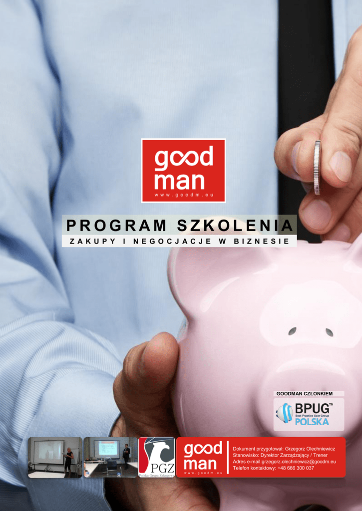 PROGRAM SZKOLENIA Z AK U P Y I N E G O C J AC J E W B I Z N E S I E GOODMAN CZŁONKIEM Dokument przygotował: Grzegorz Olechniewicz Stanowisko: Dyrektor Zarządzający / Trener Adres e-mail:[email protected] Telefon kontaktowy: +48 666 300 037 PROGRAM WARSZATY SZKOLENIOWE ZAKUPY I NEGOCJACJE W BIZNESIE PROGRAM SZKOLENIA WARSZAWA KATOWICE WROCŁAW SOPOT 12-13.09.2013 25-26-09-2013 10-11.10.2013 24-25.10.2013 1. Omówienie procesu zakupowego – omówimy różne procesy zakupowe w uzależnieniu od kategorii oraz postaramy się zwrócić uwagę na mocne oraz słabe strony poszczególnych etapów. 2. Metody analizy zakupów – analiza ABC oraz XYZ. 3. Profil kupca – przedstawimy pożądany profil kupca oraz zbadamy nasze postawy. 4. Sourcing (przegląd rynku dostawców) – przedstawimy możliwe modele oraz podejścia do tematu 5. 6. 7. sorcingu, omówimy z uczestnikami jego wagę w procesie zakupowym oraz w jaki sposób metodycznie powiększać swoją bazę dostawców za pomocą firm które z nami współpracują. Zapytanie ofertowe/zaproszenie do przetargu. - pokażemy jak zbudować zapytanie aby było ono atrakcyjne dla dostawcy. Przedstawiamy również kilka tricków, które mogą oszczędzić nam czas niezbędny na późniejsze negocjacje. Cele sprzedawcy i kupującego. – uświadomimy uczestnikom szklenia jakie są cele dostawy oraz jakimi wartościami powinien kierować się kupiec w trakcie wyboru potencjalnego dostawcy. Fazy negocjacji - postaramy się dokładnie omówić poszczególne fazy negocjacji oraz ich znaczenie, zadamy sobie pytanie czy są one tak samo postrzegane przez obie strony. 8. Przygotowanie do negocjacji. Wybór odpowiedniego sposobu działania: > > > przetarg elektroniczny; przetarg klasyczny; negocjacje telefoniczne; > > spotkania z dostawcami; „chowanie się” na urlopie. 9. Zacznij od NIE! – znaczenie tego słowa w negocjacjach dostawcą oraz komunikacji międzyludzkiej. 10. Manipulacja w negocjacjach. Omówienie prawie 30 taktyk i tricków negocjacyjnych, którymi może się posłużyć kupiec w trakcie rozmowy z dostawą. (omówienie kotwic, metaprogramów, oraz zasad konstrukcji zdań z wykorzystaniem perswazji). Ćwiczenia z wykorzystaniem nagrań wideo. 11. Negocjujemy z monopolistą. 12. Negocjacje a ograniczenia czasowe. 13. Metoda skracania czasu negocjacji. 14. Konflikt. Przedstawienie zalet i wad konfliktu w jaki sposób kupiec może nim zarządzić. 15. Dostawca na etacie -jak przekonać dostawce aby pracował dla nas za nas. 16. Zabezpieczenie interesu przedsiębiorstwa dzięki Umowie – przedstawimy najważniejsze aspekty umów handlowych oraz gotowe propozycje zapisów które możemy wykorzystać w naszej pracy. FORMULARZ ZGŁOSZENIOWY: http://www.goodm.eu/pliki/formularz_zgloszenia_uczestnika_szkolenie_zakupy_i_negocjacje_09_10_2 013.doc GOODMAN ul. Karola Libelta 3/6 61-706 Poznań [email protected] www.goodm.eu www.go-ctr.com Tel: +48 666 300 037 +48 666 300 038 +48 666 300 039 PRACUJEMY DLA CIEBIE PROGRAM WARSZATY SZKOLENIOWE Korzyści dla kupców: > uczestnicy dowiedzą się jak wykorzystać pozycję kupca w kryzysie > dzięki uczestnictwu w oferowanym przez GOODMAN szkoleniu nabędą lub pogłębią Państwo kompetencje lub umiejętności niezbędne w codziennej pracy kupca: > szybsze pozyskiwanie optymalnych rozwiązań w negocjacjach z dostawcami; > czynienie aktualnych dostawców, jak i pretendentów swoimi sojusznikami; > minimalizowanie zagrożeń płynących z niewykonania umowy przez dostawcę; > skuteczne prowadzenie trudnych rozmów bez konieczności rozstrzygania konfliktu w Sądzie; > efektywniejsze zarządzanie swoją pracą dzięki wykorzystaniu z zaproponowanych rozwiązań organizacyjnych i administracyjnych; Korzyści dla handlowców: > Zrozumienie procesu zakupowego oraz taktyk negocjacyjnych jakimi kierują się kupcy w swojej codziennej pracy. TRENER I OPIEKUN PROJEKTU: Grzegorz Olechniewicz - Współtworzył strategie zakupowe oraz realizował zakupy między innymi dla takich firm jak Alma S.A., Ariba Inc., Aliente Ltd., Lucent Technologies, Klienci Carrywater Group SA, TP SA, Klienci 4Results Sp. z o.o., itd. Były Procurement Manager w firmie Ariba Inc. Od 2004 roku prowadzi szkolenia oraz projekty doradcze w obszarze optymalizacji i zarządzania zakupami, negocjacji, zarządzania projektami oraz zarządzania zespołem. Od 2010 do 2012 roku Senior Konsultant w 4 Results Sp. z o.o. Od 2004 do 2012 roku Konsultant Zarządzający oraz Trener w GOCTR Consulting, Od 2012 roku Dyrektor Zarządzający oraz główny ekspert w obszarze zakupów i negocjacji w firmie GOODMAN. Prowadził wykłady w ramach Studiów Podyplomowych Zakupy w Biznesie organizowanych przez WSB we Wrocławiu. Współzałożyciel oraz członek Stowarzyszenia Managerów i Specjalistów ds. Zakupów, oraz Stowarzyszenia Profesji Zakupowej. Grzegorz Olechniewicz Dyrektor Zarządzający / Trener +48 666 300 037 [email protected] GOODMAN ul. Karola Libelta 3/6 61-706 Poznań [email protected] www.goodm.eu www.go-ctr.com Tel: +48 666 300 037 +48 666 300 038 +48 666 300 039 PRACUJEMY DLA CIEBIE PROGRAM WARSZATY SZKOLENIOWE WARTOŚĆ SZKOLENIA ORAZ WARUNKI PROMOCJI: DOKAŁDNE INFORMACJE NA TEMAT WARTOŚCI SZKOLENIA PUBLIKUJEMY NA STRONACH WYDARZENIA Warszawa: http://goodm.eu/zakupy-i-negocjacje-w-biznesie-warszawa-09-2013 Katowice: http://goodm.eu/zakupy-i-negocjacje-w-biznesie-katowice-09-2013 Wrocław: http://goodm.eu/zakupy-i-negocjacje-w-biznesie-wroclaw-10-2013 Sopot: http://goodm.eu/zakupy-i-negocjacje-w-biznesie-sopot-10-2013 WARTOŚĆ SZKOLENIA ZAWIERA: Materiały szkoleniowe, wykłady oraz ćwiczenia 8h dziennie (1h-45min) oddzielone przerwami, napoje, poczęstunek, obiady, certyfikaty potwierdzające uczestnictwo w szkoleniu.. INFORACJE DODATKOWE: 1. Organizator zastrzega możliwość odwołania szkolenia do siedmiu dni przed jego rozpoczęciem w przypadku nie zebrania wystarczającej ilości uczestników (3) oraz przedstawienia propozycji kol
