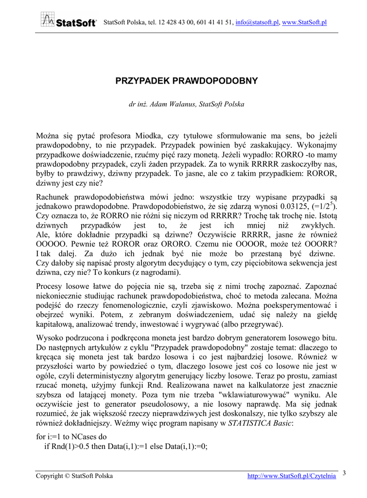 StatSoft Polska, tel. 12 428 43 00, 601 41 41 51, [email protected], www.StatSoft.pl PRZYPADEK PRAWDOPODOBNY dr inż. Adam Walanus, StatSoft Polska Można się pytać profesora Miodka, czy tytułowe sformułowanie ma sens, bo jeżeli prawdopodobny, to nie przypadek. Przypadek powinien być zaskakujący. Wykonajmy przypadkowe doświadczenie, rzućmy pięć razy monetą. Jeżeli wypadło: RORRO -to mamy prawdopodobny przypadek, czyli żaden przypadek. Za to wynik RRRRR zaskoczyłby nas, byłby to prawdziwy, dziwny przypadek. To jasne, ale co z takim przypadkiem: ROROR, dziwny jest czy nie? Rachunek prawdopodobieństwa mówi jedno: wszystkie trzy wypisane przypadki są jednakowo prawdopodobne. Prawdopodobieństwo, że się zdarzą wynosi 0.03125, (=1/25). Czy oznacza to, że RORRO nie różni się niczym od RRRRR? Trochę tak trochę nie. Istotą dziwnych przypadków jest to, że jest ich mniej niż zwykłych. Ale, które dokładnie przypadki są dziwne? Oczywiście RRRRR, jasne że również OOOOO. Pewnie też ROROR oraz ORORO. Czemu nie OOOOR, może też OOORR? I tak dalej. Za dużo ich jednak być nie może bo przestaną być dziwne. Czy dałoby się napisać prosty algorytm decydujący o tym, czy pięciobitowa sekwencja jest dziwna, czy nie? To konkurs (z nagrodami). Procesy losowe łatwe do pojęcia nie są, trzeba się z nimi trochę zapoznać. Zapoznać niekoniecznie studiując rachunek prawdopodobieństwa, choć to metoda zalecana. Można podejść do rzeczy fenomenologicznie, czyli zjawiskowo. Można poeksperymentować i obejrzeć wyniki. Potem, z zebranym doświadczeniem, udać się należy na giełdę kapitałową, analizować trendy, inwestować i wygrywać (albo przegrywać). Wysoko podrzucona i podkręcona moneta jest bardzo dobrym generatorem losowego bitu. Do następnych artykułów z cyklu "Przypadek prawdopodobny" zostaje temat: dlaczego to kręcąca się moneta jest tak bardzo losowa i co jest najbardziej losowe. Również w przyszłości warto by powiedzieć o tym, dlaczego losowe jest coś co losowe nie jest w ogóle, czyli deterministyczny algorytm generujący liczby losowe. Teraz po prostu, zamiast rzucać monetą, użyjmy funkcji Rnd. Realizowana nawet na kalkulatorze jest znacznie szybsza od latającej monety. Poza tym nie trzeba "wklawiaturowywać" wyniku. Ale oczywiście jest to generator pseudolosowy, a nie losowy naprawdę. Ma się jednak rozumieć, że jak większość rzeczy nieprawdziwych jest doskonalszy, nie tylko szybszy ale również dokładniejszy. Weźmy więc program napisany w STATISTICA Basic: for i:=1 to NCases do if Rnd(1)>0.5 then Data(i,1):=1 else Data(i,1):=0; Copyright © StatSoft Polska http://www.StatSoft.pl/Czytelnia 3 StatSoft Polska, tel. 12 428 43 00, 601 41 41 51, [email protected], www.StatSoft.pl Produkuje on, czyli wytwarza albo generuje, trochę (NCases) liczb udających wyniki rzutu monetą i wpisuje je do pierwszej kolumny jakiegoś arkusza.STATISTICA może oczywiście ładnie nam je pokazać na wykresie (rys.1). Rys.1. Wyniki wirtualnego rzucania monetą czyli generowania pseudolosowej cyfry 0/1. Czy początek tego ciągu (od 1 do 14) wygląda dziwnie czy nie? Wykres ten, jak i pozostałe wykonano w programie STATISTICA. Żeby przybliżyć sens Rnd zróbmy logiczne błędne koło: skutkiem powyższego algorytmu, który używa Rnd jest ciąg znaków 0011010100. Postawmy przed ciągiem zerojedynkowym jeszcze jedno zero i kropkę. Otrzymamy: 0.0011010100; normalną liczbę dwójkową, nie mniejszą od zera a mniejszą od jeden. To własnie jest Rnd (w STATISTICA Basic konkretnie Rnd(1) ). Ciąg 0011... można by otrzymać "porządnie" rzucając monetą, otrzymując prawdziwą liczbę losową, a nie tylko "pseudo". Ponieważ otrzymanie liczby 0.11101 jest tak samo prawdopodobne jak liczby 0.00011 i jak wszystkich innych, mówimy, że rozkład prawdopodobieństwa jest tu równomierny. Dlatego warunek Rnd(1)>0.5 spełniany jest z takim samym prawdopodobieństwem jak spadanie monety orłem do góry. Po konwersji liczb dwójkowych do "ludzkiej postaci" mamy: 0.90625 i 0.09375. Wygenerujmy więcej takich liczb. for i:=1 to NCases do Data(i,1):=Rnd (1); Na wykresie (rys.2) liczby te są przedstawione jako punkty. Nie są one połączone ze sobą linią. Tak być powinno, ponieważ nic ich nie łączy. Tak jak kolejne rzuty monetą są zupełnie niezależne od siebie. To brzmi niewiarygodnie, ale po sekwencji RRRRRRRRRRRRR w dalszym ciągu reszka jest tak samo prawdopodobna jak orzeł. Inną rzeczą jest, że zaczynamy podejrzewać, czy ta moneta w ogóle ma orła. 4 www.StatSoft.pl Copyright © StatSoft Polska StatSoft Polska, tel. 12 428 43 00, 601 41 41 51, [email protected], www.StatSoft.pl Rys.2. Liczby pseudolosowe o równomiernym rozkładzie prawdopodobieństwa. Krzyżyków powinno być tyle samo (mniej więcej) na każdej wysokości. Żadnych podejrzanych struktur, w rodzaju ciągów z odcinka między 15 a 30 losowaniem nie powinno być. Ładniejszy wykres liczb losowych otrzymamy inaczej. Ładniejszy, to znaczy bardziej rzeczywisty, czyli symulujący coś bardziej realnego niż proste rzuty monetą. Na przykład temperatura powietrza nie zmienia się z dnia na dzień zupełnie. Jeśli wczoraj było zimno, to dziś też raczej będzie co najmniej dość chłodno. Uzależnienie od "wczoraj" robimy tak: c:=0.8; Data(1,1):=Rnd (1); for i:=2 to NCases do Data(i,1):=c*Data(i-1,1)+(1-c)*Rnd (1); Nazwa zmiennej c ma się kojarzyć z część. Otóż bierzemy 80% (c=0.8) poprzedniej, wczorajszej wartości a 20% nowej, zupełnie losowej. W ten sposób otrzymujemy liczbę trochę losową a trochę wczorajszą, czyli już znaną, a więc nie losową. To się nazywa autokorelacja, gdyż ciąg liczb jest sam ze sobą skorelowany. Teraz ma sens łączenie punktów linią (rys.3), wykres jest dość gładki, coś przedstawia. Może grań jakiegoś pasma górskiego. Czy to będą Tatry, czy Góry Świętokrzyskie zależy od c. Rys.3. Liczby podobne 