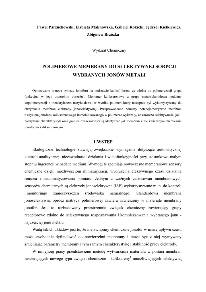 Paweł Parzuchowski, Elżbieta Malinowska, Gabriel Rokicki, Jędrzej Kiełkiewicz, Zbigniew Brzózka Wydział Chemiczny POLIMEROWE MEMBRANY DO SELEKTYWNEJ SORPCJI WYBRANYCH JONÓW METALI Opracowano metodę syntezy jonoforu na podstawie kaliks[4]arenu ze zdolną do polimeryzacji grupą funkcyjną w jego „szerokim obrzeżu”. Monomer kaliksarenowy z grupą metakrylamidową poddany kopolimeryzacji z metakrylanem metylu dawał w wyniku polimer, który następnie był wykorzystywany do otrzymania membran elektrody jonoselektywnej. Przeprowadzone pomiary potencjometryczne membran z użyciem jonoforu kaliksarenowego immobilizowanego w polimerze wykazały, że zarówno selektywność, jak i nachylenia charakterystyk oraz granice oznaczalności są identyczne jak membran z nie związanym chemicznie jonoforem kaliksarenowym. 1.WSTĘP Ekologiczne technologie stawiają zwiększone wymagania dotyczące automatycznej kontroli analitycznej, niezawodności działania i wielofunkcyjności przy stosunkowo małym stopniu ingerencji w badane medium. Wymogi te spełniają nowoczesne membranowe sensory chemiczne dzięki możliwościom miniaturyzacji, wydłużenia efektywnego czasu działania sensora i zautomatyzowania pomiaru. Jednym z ważnych zastosowań membranowych sensorów chemicznych są elektrody jonoselektywne (ISE) wykorzystywane m.in. do kontroli i monitoringu zanieczyszczeń środowiska naturalnego. Standardowa membrana jonoselektywna oprócz matrycy polimerowej zawiera zawieszony w materiale membrany jonofor. Jest to rozbudowany przestrzennie związek chemiczny zawierający grupy receptorowe zdolne do selektywnego rozpoznawania i kompleksowania wybranego jonu najczęściej jonu metalu. Wadą takich układów jest to, że nie związany chemicznie jonofor w miarę upływu czasu może swobodnie dyfundować do powierzchni membrany i może być z niej wymywany zmieniając parametry membrany i tym samym charakterystykę i stabilność pracy elektrody. W niniejszej pracy przedstawiono metodę wytwarzania materiału w postaci membran zawierających nowego typu związki chemiczne - kaliksareny1 umożliwiających selektywną sorpcję wybranych jonów metali. Zaplanowano i przeprowadzono syntezę selektywnego jonoforu zawierającego reaktywną grupę umożliwiającą jego wbudowanie w łańcuch polimerowy. Otrzymany tą drogą monomer-receptor poddawano następnie kopolimeryzacji z typowym monomerem akrylowym. Zakładano, że układ zawierający związany kowalencyjnie jonofor pozwoli na stabilną pracę membrany. Zaproponowane do budowy jonoforów kaliksareny są to związki makrocykliczne o budowie kielichowej, zawierające cztery lub więcej jednostek fenolowych połączonych mostkami metylenowymi w położeniu orto względem grupy hydroksylowej (Rys. 1). Swoją dużą popularność, zwłaszcza w ostatnim dziesięcioleciu, zawdzięczają możliwości różnorodnej modyfikacji, poprzez wprowadzenie grup funkcyjnych z wykorzystaniem zarówno grupy OH „wąskiego obrzeża", jak i pozycji para pierścieni aromatycznych „szerokiego obrzeża" kaliksarenu2. Wysoka selektywność związków tego typu w kompleksowaniu jonów metali umożliwiła ich zastosowanie do celów analitycznych, m.in. do budowy elektrod jonoselektywnych (ISE)3. „szerokie obrzeże” R R R HO HO R OH OH „wąskie obrzeże” Rys. 1. Budowa przestrzenna kaliks[4]arenu Z literatury chemicznej znane są próby4 wbudowania jonoforów kaliksarenowych do łańcuchów polimerowych z wykorzystaniem fenolowej grupy OH „wąskiego obrzeża”. Jednakże ten sposób postępowania uniemożliwia otrzymanie symetrycznej, cyklicznej struktury receptora, gdyż najczęściej jedna z czterech grup OH zamiast być wykorzystana do wprowadzenia grupy receptorowej służy jako łącznik z cząsteczką polimeru. Obniża to wyraźnie zdolności kompleksotwórcze receptora.4 Zaproponowana przez nas metoda pozwala na zachowanie symetrycznej struktury grup receptorowych „wąskiego obrzeża”, gdyż do połączenia z łańcuchem polimerowym służy grupa funkcyjna wprowadzona do nie biorącego udziału w kompleksowaniu „szerokiego obrzeża” kaliksarenu (Schemat 1). 2 O OH O O O O O BrCH2COOC2H5 4 O O O HNO3 K2CO3 4 + O N 3 O K2 K1 H2 Raney Ni O O O O O CH2=C(CH3)COCl O O O O O O O Et3N O NH2 3 NH 3 K3 K4 Schemat 1. Synteza monomeru kaliksarenowego K4 Jako modelowy układ receptorowy wybrano eterową pochodną kaliks[4]arenu zawierającą cztery grupy etyloksykarbonylometylowe w cząsteczce (K1). Tego typu pochodna jest jednym z najlepszych znanych jonoforów czułych na jony sodowe 5,6 i jest stosunkowo łatwa do otrzymania 7. W niniejszej pracy przedstawiono ocenę przydatności i efektywności działania otrzymanych materiałów jako membran w elektrodach jonoselektywnych. Po stwierdzeniu czy obecność podstawnika w jednym z czterech pierścieni fenolowych kaliks[4]arenu nie zakłóci symetrii i nie zmieni w sposób istotny selektywności receptora, następnym etapem pracy będzie użycie kaliksarenu z grupami receptorowymi selektywnymi w stosunku do jonów metali toksycznych takich jak Cd2+ czy Pb2+. 2. CZĘŚĆ EKSPERYMENTALNA Synteza kaliks[4]arenu z grupami funkcyjnymi zdolnymi do selektywnego kompleksowania jonów Na+ (K1). Do energicznie mieszanej zawiesiny p-tert-butylokaliks[4]arenu (27 mmol, 20 g) 8 otrzymanego wg. znanej procedury i bezwodnego węglanu potasu (162 mmol, 22,4 g) w suchym acetonie (500 cm3) dodano bromooctanu etylu (216 mmol, 36 g, 24 cm3) i zawartość ogrzewano do wrzenia pod chłodnicą zwrotną przez 5 dni. Mieszaninę reakcyjną ochłodzono, węglan odsączono pod zmniejszonym ciśnieniem i usunięto aceton na wyparce obrotowej. 3 Surowy produkt krystalizowano z mieszaniny CH2Cl2/metanol. Otrzymano 24 g produktu z wydajnością 90 %. Wprowadzenie reaktywnej grupy funkcyjnej do kaliksarenu w celu chemicznej immobilizacji na nośniku polimerowym Synteza mononitro-kaliksarenu K2 Energicznie mieszany roztwór kaliksarenu K