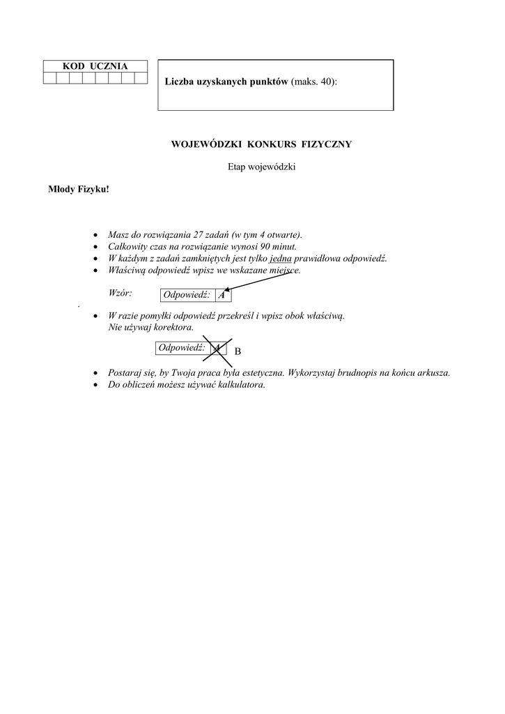 KOD UCZNIA Liczba uzyskanych punktów (maks. 40): WOJEWÓDZKI KONKURS FIZYCZNY Etap wojewódzki Młody Fizyku! Masz do rozwiązania 27 zadań (w tym 4 otwarte). Całkowity czas na rozwiązanie wynosi 90 minut. W każdym z zadań zamkniętych jest tylko jedna prawidłowa odpowiedź. Właściwą odpowiedź wpisz we wskazane miejsce. Wzór: . Odpowiedź: A W razie pomyłki odpowiedź przekreśl i wpisz obok właściwą. Nie używaj korektora. Odpowiedź: A B Postaraj się, by Twoja praca była estetyczna. Wykorzystaj brudnopis na końcu arkusza. Do obliczeń możesz używać kalkulatora. WOJEWÓDZKI KONKURS FIZYCZNY 2010/2011 Etap wojewódzki ZADANIA ZAMKNIĘTE (jedna odpowiedź prawidłowa) W zadaniach przyjmij wartość przyśpieszenia ziemskiego 1. Stefan podnosi do góry książkę o masie 1kg ruchem jednostajnym prostoliniowym. Ciężar książki wynosi A) B) C) D) 1kg 1N 10kg 10N Odpowiedź: 2. Na stole leży nieruchomo klocek (rysunek). Na klocek działa siła sprężystości stołu, a na stół siła nacisku klocka. Siły te: A) B) C) D) równoważą się, bo mają takie same kierunki, przeciwne zwroty i te same wartości nie równoważą się, bo mają takie same kierunki, przeciwne zwroty i różne wartości nie równoważą się, bo są przyłożone do dwóch różnych ciał równoważą się, bo klocek jest w spoczynku FS stół FN Wykres poniżej dotyczy zadań 3 - 5 3. Wykres przedstawia zależność prędkości od czasu dla dwóch pojazdów A i B . Drogi przebyte przez te pojazdy to SA i SB. Z wykresu wynika, że: Odpowiedź: v[m/s] 20 A A) SA=SB 10 B) SA<SB B C) SA=3SB 0 D) SA=0,5SB 5 10 t[s] Odpowiedź: 4. Przyspieszenie pojazdu A wynosi ….. A) zero B) 2 C) 4 D) 10 Odpowiedź: 5. Pojazd B porusza się: A) B) C) D) ruchem jednostajnym prostoliniowym ruchem jednostajnie przyspieszonym prostoliniowym ruchem jednostajnie opóźnionym prostoliniowym ruchem jednostajnym po okręgu Odpowiedź: 2 WOJEWÓDZKI KONKURS FIZYCZNY 2010/2011 Etap wojewódzki 6. Zimą na szybach pojawiają się czasami lodowe kwiaty. Powstają one w wyniku zjawiska: A) parowania B) skraplania C) resublimacji D) wrzenia Odpowiedź: 7. Gdy lód topnieje, to: A) pobiera energię i jego temperatura rośnie B) pobiera energię przy stałej temperaturze C) oddaje energię i temperatura lodu maleje D) oddaje energię przy stałej temperaturze Odpowiedź: 8. Umyte włosy po wyschnięciu trudno jest ułożyć za pomocą plastikowego grzebienia, ponieważ: A) włosy przez tarcie elektryzują się różnoimiennie i przylegają ściśle do głowy B) plastikowy grzebień plącze włosy i jego zęby łatwo się wyłamują C) włosy elektryzują się jednoimiennie i odpychają się od siebie D) włosy przez tarcie elektryzują się różnoimiennie i odpychają się od siebie i od głowy Odpowiedź: 9. Oświetlenie choinkowe wykonano z 30 żarówek połączonych szeregowo i zasilanych napięciem 220V. Po przepaleniu jednej żarówki pozostałe połączono szeregowo i też podłączono do napięcia 220V. Oświetlenie choinki: A) zmniejszyło się, bo zwiększył się opór całego obwodu B) zwiększyło się, ale grozi przepaleniem następnej żarówki, bo zmniejszył się opór całego obwodu C) zwiększyło się i żarówki świecą bezpieczniej, bo zmalało natężenie prądu płynącego przez żarówki D) nie zmieniło się Odpowiedź: 10. Opór elektryczny przewodnika nie zależy od: A) długości przewodnika B) pola poprzecznego przekroju przewodnika C) materiału, z jakiego jest wykonany przewodnik D) napięcia i natężenia prądu płynącego w przewodniku Odpowiedź: 11. Po przecięciu magnesu sztabkowego na dwie części prostopadle do jego osi, otrzymamy dwa A) B) C) D) magnesy rozdzielone bieguny magnetyczne kawałki stali bez własności magnetycznych naelektryzowane kawałki stali Odpowiedź: 12. Dowodem istnienia pola magnetycznego Ziemi jest A) B) C) D) działanie kompasu spadanie ciał na ziemię ruch sztucznych satelitów odkształcenie przewodów elektrycznych na słupach Odpowiedź: 3 WOJEWÓDZKI KONKURS FIZYCZNY 2010/2011 Etap wojewódzki 13. Do określania zwrotu siły elektrodynamicznej działającej na przewodnik z prądem w polu magnetycznym służy A) B) C) D) reguła lewej dłoni reguła prawej dłoni reguła Lenza III zasada dynamiki Newtona Odpowiedź: 14. W przewodniku kołowym A prąd płynie zgodnie z ruchem wskazówek zegara, a w przewodniku kołowym B – przeciwnie do ruchu wskazówek zegara (rysunek). Wybierz zdanie prawdziwe: A B A) przed każdym z przewodników tworzy się biegun południowy S B) przed każdym z przewodników tworzy się biegun północny N C) przed przewodnikiem A tworzy się biegun północny, a przed przewodnikiem B - południowy D) przed przewodnikiem A tworzy się biegun południowy, a przed przewodnikiem B - północny Odpowiedź: 15. Siła elektrodynamiczna działająca na przewodnik z prądem (rysunek) ma zwrot: A) B) C) D) do góry w dół w lewo w prawo N S Odpowiedź: 16. Ile wynosi wartość siły działającej na przewodnik umieszczony w jednorodnym polu magnetycznym o indukcji 0,5 T prostopadle do linii pola, jeśli długość przewodnika w tym polu wynosi 0,2 m, a natężenie prądu w przewodniku jest równe 2A? A) B) C) D) 0,1 N 0,2 N 1N 2N Odpowiedź: 17. Do uzwojenia pierwotnego transformatora mającego 100 zwojów podłączono płaską baterię o napięciu 4,5V. W uzwojeniu wtórnym o 200 zwojach panuje napięcie: A) B) C) D) 9V 2,25 V 1,125 V 0V Odpowiedź: 18. Zasada działania transformatora oparta jest na: A) B) C) D) działaniu stałego pola magnetycznego na uzwojenie wtórne działaniu zmiennego pola magnetycznego na uzwojenie wtórne działaniu stałego pola elektrycznego na uzwojenie wtórne przepływie prądu z obwodu pierwotnego do obwodu wtórnego Odpowiedź: 4 WOJEWÓDZKI KONKURS FIZYCZNY 2010/2011 Etap wojewódzki 19. Promień świetlny pada na lustro płaskie (rysunek). Kąt między promieniem padającym i odbitym wynosi 60 . Ile wyno