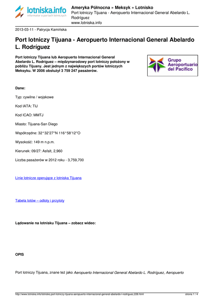 Ameryka Północna » Meksyk » Lotnisko Port lotniczy Tijuana - Aeropuerto Internacional General Abelardo L. Rodríguez www.lotniska.info 2013-03-11 - Patrycja Kamińska Port lotniczy Tijuana - Aeropuerto Internacional General Abelardo L. Rodríguez Port lotniczy Tijuana lub Aeropuerto Internacional General Abelardo L. Rodríguez – międzynarodowy port lotniczy położony w pobliżu Tijuany. Jest jednym z największych portów lotniczych Meksyku. W 2006 obsłużył 3 759 247 pasażerów. Dane: Typ: cywilne / wojskowe Kod IATA: TIJ Kod ICAO: MMTJ Miasto: Tijuana-San Diego Współrzędne: 32°32′27″N 116°58′12″O Wysokość: 149 m n.p.m. Kierunek: 09/27: Asfalt, 2,960 Liczba pasażerów w 2012 roku - 3,759,700 Linie lotnicze operujące z lotniska Tijuana Tabela lotów – odloty i przyloty Lądowanie na lotnisku Tijuana – zobacz wideo: OPIS Port lotniczy Tijuana, znane też jako Aeropuerto Internacional General Abelardo L. Rodríguez, Aeropuerto http://www.lotniska.info/lotnisko,port-lotniczy-tijuana-aeropuerto-internacional-general-abelardo-l-rodriguez,228.html strona 1 / 4 Ameryka Północna » Meksyk » Lotnisko Port lotniczy Tijuana - Aeropuerto Internacional General Abelardo L. Rodríguez www.lotniska.info Internacional de Tijuana lub Aeropuerto Binacional de Tijuana-San Diego – międzynarodowy port lotniczy położony w pobliżu Tijuany w Meksyku, niedaleko granicy ze Stanami Zjednoczonymi. Jest jednym z największych portów lotniczych tego kraju. W 2010 obsłużył 3,6 miliona pasażerów, zaś w 2011 roku 3,5 miliona. Jedno też drugie najbardziej wysunięte na północ lotnisko, tuż za lotniskiem Mexicali. Port lotniczy Tijuana jest piątym co do wielkości lotniskiem Meksyku i jest w stanie obsłużyć 10 milionów pasażerów rocznie oraz 360 lotów dziennie. Port ten należy do Grupo Aeroportuario del Pacífico, grupy, która zarządza dwunastoma innymi meksykańskimi lotniskami. DOJAZD Taxi Przykładowe kursy i ceny w dolarach za przejazd taksówką (według podziału na strefy): Strefa I Centro Línea Otay Z. Rio $ 180 Strefa II $ 200 5 y 10 B. Vista Centro Col. Río Strefa III $ 200 20 Nov. Cubillas Paraíso Postal Strefa IV $240 Altamira Hipódromo Brisas http://www.lotniska.info/lotnisko,port-lotniczy-tijuana-aeropuerto-internacional-general-abelardo-l-rodriguez,228.html strona 2 / 4 Ameryka Północna » Meksyk » Lotnisko Port lotniczy Tijuana - Aeropuerto Internacional General Abelardo L. Rodríguez www.lotniska.info La Mesa Las Palmas Murúa Strefa V $260 Fundadores Canadá Verde Chapultepec El Lago Los Pinos Obrera Playas Presidentes Soler Strefa VI $330 Florido Grupo Mex. La Presa T. Rubí V. del Real V. Fontana Mariano P. Pacífico P. Ind. Florido Wynajem samochodu Dollar - Tel.683-85-37 Hertz - Tel.683-20-80 Alamo - Tel.683-80-84 Sixt - Tel.(664)683-29-05 Avis - Tel.683-23-10 Thrifty - Tel.683-81-30 National - Tel.683-81-15 Europcar - Tel.683-85-67 Strona internetowa portu lotniczego Tijuana http://aeropuertosgap.com.mx/aeropuertos/tijuana.html http://www.lotniska.info/lotnisko,port-lotniczy-tijuana-aeropuerto-internacional-general-abelardo-l-rodriguez,228.html strona 3 / 4 Ameryka Północna » Meksyk » Lotnisko Port lotniczy Tijuana - Aeropuerto Internacional General Abelardo L. Rodríguez www.lotniska.info http://www.lotniska.info/lotnisko,port-lotniczy-tijuana-aeropuerto-internacional-general-abelardo-l-rodriguez,228.htm l http://www.lotniska.info/lotnisko,port-lotniczy-tijuana-aeropuerto-internacional-general-abelardo-l-rodriguez,228.html Powered by TCPDF (www.tcpdf.org) strona 4 / 4