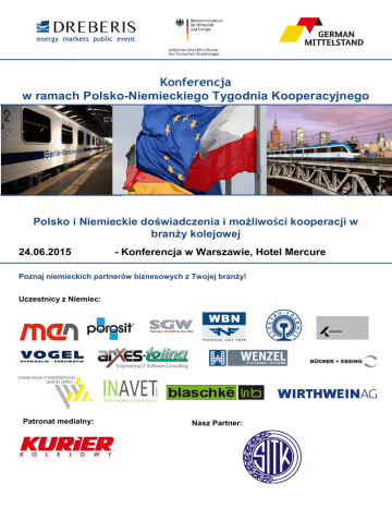 Konferencja w ramach Polsko-Niemieckiego Tygodnia Kooperacyjnego Polsko i Niemieckie doświadczenia i możliwości kooperacji w branży kolejowej 24.06.2015 - Konferencja w Warszawie, Hotel Mercure Poznaj niemieckich partnerów biznesowych z Twojej branży! Uczestnicy z Niemiec: Patronat medialny: Nasz Partner: Tło konferencji Serdecznie zapraszamy Państwa do nawiazania kontaktu z przedsiębiorcami niemieckimi z branży kolejowej, którzy będą gościli w Warzawie w dn. 22-26.06.2015 r. Wizyta organizowana jest na zlecenie Niemieckiego Ministerstwa Gospodarki w celu ożywienia kontaktów biznesowych między polską i niemiecką branżą kolejową. W ramach pobytu w Polsce, oprócz spotkań bilateralnych, organizujemy także polsko- niemiecką konferencję kooperacyjną 24.06.2015, podczas której będą Państwo mieli okazję poznać wszystkich niemieckich, jak również polskich uczestników. MOŻLIWOŚĆ SPOTKANIA Z FIRMĄ NIEMIECKĄ W wizycie w Polsce bierze udział 14 niemieckich firm. Poza konferencją mają Państwo także możliwość spotkania z każdym niemieckim przedsiębiorcą, którego profil kooperacyjny odpowiada profilowi Państwa firmy i dla obu stron istnieje szansa nawiązania współpracy. Nawiązanie kontaktu oraz umówienie spotkań Organizatorzy działamy na zlecenie z przyjemnością koordynujemy dla Państwa bezpłatnie. Niemieckiego Ministerstwa Jako Gospodarki. Po zgłoszeniu przez Państwa zainteresowania spotkaniem (formularz zgłoszeniowy na ostatniej stronie niniejszego zaproszenia) skontaktujemy się z Państwem w celu omówienia szczegółów i przekazania profil firm niemieckich. Zapraszamy i pozdrawiamy! Zespół DREBERIS w Polsce i w Niemczech na zlecenie Niemieckiego Ministerstwa Gospodarki ORGANIZATORZY i KONTAKT Z NAMI DREBERIS Sp. z o.o. oraz DREBERIS GmbH to międzynarodowa firma doradcza z siedzibami od 15 lat m.in. w Dreźnie i we Wrocławiu. Pracowaliśmy już jako doradcy strategiczni dla setek firm prywatnych, koncernów oraz MŚP, ministerstw i innych instytucji publicznych. Wprowadzamy firmy na rynki zagraniczne (internacjonalizacja) lub optymalizujemy ich obecność na nich. Oprócz specjalizacji w polsko-niemieckich projektach pracujemy także w Ameryce Północnej i Południowej, w Azji, Afryce i większości krajów europejskich. W razie wszelkich pytań zapraszamy do kontaktu: Justyna Błotna DREBERIS GmbH [email protected] DREBERIS GmbH Heinrich-Zille-Str. 2 01219 Dresden Tel./Fax +49 351 862643-14 www.dreberis.com PROGRAM KONFERENCJI 24.06.2015 Konferencja: „Polskie i niemieckie doświadczenia i możliwości kooperacji w branży kolejowej“ Miejsce konferencji: Języki konferencji: Moderacja: 09:00 09:30 HOTEL Mercure, Warszawa polski/niemiecki (tłumaczenie symultaniczne) dr Markus Reichel, Prezes Zarządu DREBERIS GmbH Rejestracja uczestników Otwarcie konferencji / Powitanie uczestników dr Markus Reichel, DREBERIS Rudolf Nikel, Ambasador Niemiec Część 1: Podstawy dla polsko-niemieckiej współpracy w sektorze kolejowym 09:45 Rola Prezesa UTK w organizacji transportu kolejowego w Polsce Krzysztof Dyl, Prezes Urzędu Transportu Kolejowego 10:15 Przemysł kolejowy w Niemczech – zarys dr Markus Reichel, DREBERIS Część 2: Rozwiązania dla skutecznego sterowania ruchem 10:30 Wprowadzenie: prof. dr Janusz Dyduch, Prezes Stowarzyszenia Inżynierów i Techników Komunikacji 10:45 Gunter Thiele, INAVET: Systemy wspomagania maszynisty lub motorniczego zwiększające oszczędności energetyczne i optymalizujące zarządzanie w komunikacji kolejowej i miejskim transporcie pasażerskim 10:55 Axel Winkler, VAB Berlin: Technologie efektywnego zarządzania zajezdniami i siecią linii komunikacji zbiorowej 11:05 Stefan Nissen, WENZEL Elektronik: Innowacyjne i dostępne rozwiązania dla telekomunikacji, systemów informacji i ostrzeżeń podróżnych w kolejnictwie Część 3: Rozwiązania dla budowy oraz utrzymywania torów i infrastrukury 11:30 Wprowadzenie: dr hab. Paweł Wajda, White&Case 11:45 Mikhail Permyakov, Kranunion: Możliwości zwiększenia wydajności, bezpieczeństwa i ekologii dzięki nowoczesnym dźwigom kolejowym 11:55 Robert Plötz, Elektrothermit: Bezstykowe tory dzięki technologii spawania aluminotermicznego 12:05 Andree Horn, Porosit: Trwała i przyjazna dla środowiska infiltracja za pomocą betonowych elementów filtracyjnych 12:15 Norbert Gloos, Wirthwein: Możliwości zastosowania elementów z tworzywa sztucznego w nawierzchniach kolejowych 12:25 Dyskusja/ pytania 12:4513:00 Przerwa na kawę i rozmowy indywidualne przy osobnych stolikach 13:00 13:15 Część 4: Rozwiązania dla produkcji i utrzymania pojazdów Wprowadzenie: Jan Bach, DREBERIS dr Peter Heilmann, Arxes Tolina: Zautomatyzowane ultradźwiękowe systemy diagnostyczne dla przemysłu kolejowego oraz zarządzanie zestawami kołowymi wspomagane oprogramowaniem komputerowym dla przemysłu kolejowego 13:25 Ludger Wähning, Bücker-Essing: Naprawa i odbudowa w silników spalinowych z certyfikatem IRIS 13:35 Mathias Vogel, Industrie-Hydraulik Vogel & Partner: Projektowanie, dostawa, montaż oraz konserwacja i utrzymanie systemów hydraulicznych, a także pneumatycznych oraz systemów smarowania 13:45 Heiko Rees, Blaschke Umwelttechnik: Szczególne wymagania wobec urządzeń systemu odprowadzania spalin oraz urządzeń odsysających w konserwacji spalinowych pojazdów kolejowych 13:55 Case Study Kerstin Pollmer, BTS: Przemysł kolejowy w Saksonii – przykłady owocnej pracy w klastrach 14:10 Christian Zeiher, MEN: Innowacyjne i zoptymalizowane rozwiązania komputerowe do zastosowań związanych z niezawodnością i bezpieczeństwem 14:20 Andreas Gruetzmann, SGW: Wytrącanie się osadu w wentylacji urządzeń kolejowych, transportowych i dźwigowych 14:30 Roland Metzig, Waggonbau Neisse: Możliwości zastosowania nowoczesnych wagonów towarowych 14:40 Dyskusja/ pytania 14:50 Zakończenie dr Markus Reichel, Prezes Zarządu, DREBERIS Spotkania nieformalne i