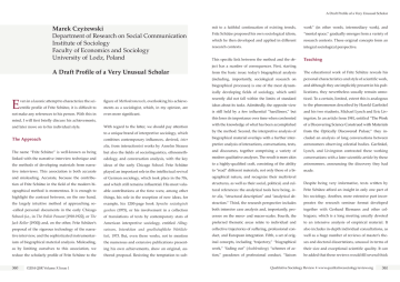 A Draft Profile of a Very Unusual Scholar Marek Czyżewski Department of Research on Social Communication Institute of Sociology Faculty of Economics and Sociology University of Lodz, Poland A Draft Profile of a Very Unusual Scholar E ven in a laconic attempt to characterize the sci- figure of Methodenmensch, overlooking his achieve- entific profile of Fritz Schütze, it is difficult to ments as a sociologist, which, in my opinion, are not make any references to his person. With this in even more significant. mind, I will first briefly discuss his achievements, and later move on to his individual style. With regard to the latter, we should pay attention to a unique brand of interpretive sociology, which The Approach combines contemporary influences, derived, inter alia, from interactionist works by Anselm Strauss mit to a faithful continuation of existing trends, work” (in other words, intermediary work), and Fritz Schütze proposed his own sociological idiom, “mental space,” gradually emerges from a variety of which he then developed and applied in different research contexts. These original concepts form an research contexts. integral sociological perspective. This specific link between the method and the ob- Teaching ject has a number of consequences. First, starting from the basic issue: today’s biographical analysis The educational work of Fritz Schütze reveals his (including, importantly, sociological research on personal characteristics and style of scientific work, biographical processes) is one of the most dynam- and although they are implicitly present in his pub- ically developing fields of sociology, which until lications, they nevertheless usually remain unno- recently did not fall within the limits of standard ticed. To a certain, limited, extent this is analogous ideas about its tasks. Admittedly, the opposite view to the phenomenon described by Harold Garfinkel is still held by a few influential “hardliners,” but and his two students, Michael Lynch and Eric Liv- this loses its importance over time when confronted ingston. In an article from 1981, entitled “The Work with the knowledge of what has been accomplished of a Discovering Science Construed with Materials by the method. Second, the interpretive analysis of from the Optically Discovered Pulsar,” they in- biographical material overlaps with a further inter- cluded an analysis of long conversations between pretive analysis of interactions, conversations, texts, astronomers observing celestial bodies. Garfinkel, and discourses, together comprising a variety of Lynch, and Livingston contrasted these working The name “Fritz Schütze” is well-known as being but also the fields of sociolinguistics, ethnometh- linked with the narrative interview technique and odology, and conversation analysis, with the key modern qualitative analyses. The result is more akin conversations with a later scientific article by these the methods of developing materials from narra- ideas of the early Chicago School. Fritz Schütze to a highly-qualified craft, consisting of the ability astronomers, announcing the discovery they had tive interviews. This association is both accurate played an important role in the intellectual revival to “read” different materials, not only those of a bi- made. and misleading. Accurate, because the contribu- of German sociology, which took place in the 70s, ographical nature, and recognize their multi-level tion of Fritz Schütze in the field of the modern bi- and which still remains influential. His most valu- structures, as well as their social, political, and cul- Despite being very informative, texts written by ographical method is momentous. It is enough to able contributions at the time were, among other tural references: the analytical tools here being, in- Fritz Schütze afford an insight in only one part of highlight the contrast between, on the one hand, things, his role in the reception of new ideas, for ter alia, “structural description” and “analytical ab- his sociology. Another, more extensive part incor- the largely intuitive method of approaching so- example, his 1200-page book Sprache soziologisch straction.” Third, the research perspective includes porates the research seminar format developed -called personal documents in the early Chicago gesehen (1975), or his involvement in a collection both intensive case analysis and, importantly, pro- together with Gerhard Riemann and other col- School (i.e., in The Polish Peasant [1918-1922], or The of translations of texts by contemporary stars of cesses on the meso- and macro-scales. Fourth, the leagues, which is a long meeting usually devoted Jack Roller [1930]) and, on the other, Fritz Schütze’s American interpretive sociology, entitled Alltag- preferred thematic areas relate to individual and to an intensive analysis of empirical material. It proposal of the rigorous technology of the narra- swissen, Interaktion und gesellschaftliche Wirklich- collective trajectories of suffering, professional con- also includes in-depth individual consultations, as tive interview, and the sophisticated instrumentar- keit, 1973. But, even these works, not to mention duct, and European integration. Fifth, a set of orig- well as a huge number of reviews of master’s the- ium of biographical material analysis. Misleading, the numerous and extensive publications present- inal concepts, including “trajectory,” “biographical ses and doctoral dissertations, unusual in terms of as by limiting ourselves to this association, we ing his own achievements, show an original, au- work,” “fading out” (Ausblendung), “schemes of ac- their size and exceptional scientific quality. It can reduce the scholarly profile of Fritz Schütze to the thored proposal. Resisting the temptation to sub- tion,” paradoxes of professional conduct, “liaison be added that these reviews would fill several thick 360 ©2014 QSR Volume X Issue 1 Qualitati