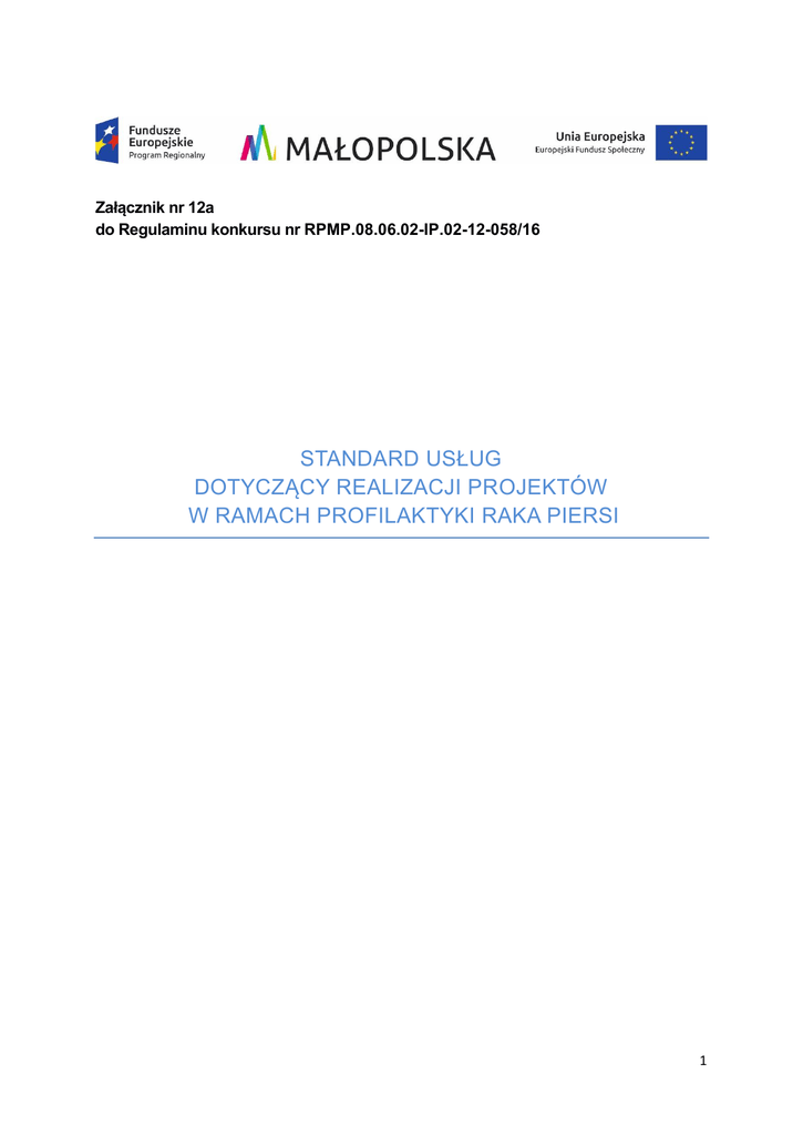 Załącznik nr 12a do Regulaminu konkursu nr RPMP.08.06.02-IP.02-12-058/16 STANDARD USŁUG DOTYCZĄCY REALIZACJI PROJEKTÓW W RAMACH PROFILAKTYKI RAKA PIERSI 1 Cel Programu Celem Programu profilaktyki raka piersi jest zmniejszenie umieralności z powodu raka piersi. Projekty wybrane w konkursie mają wspomagać realizację Programu przy pomocy działań ukierunkowanych na zapewnienie większej zgłaszalności na badania profilaktyczne. W ramach Programu MOW NFZ1 finansuje wszystkie wykonane badania. Badania te nie są limitowane i przebiegają w dwóch etapach realizowanych w trybie ambulatoryjnym. Etapy Programu profilaktyki raka piersi etap podstawowy etap pogłębionej diagnostyki Etap podstawowy obejmuje mammografię skryningową obu piersi. Jeżeli wynik mammografii jest nieprawidłowy lekarz podejmuje decyzję o skierowaniu pacjentki do etapu pogłębionej diagnostyki. W trakcie porady na etapie pogłębionej diagnostyki lekarz, w zależności od wskazań medycznych, postanawia, które z dostępnych procedur programu wykona w celu ostatecznego rozpoznania. Po zakończeniu wszystkich niezbędnych procedur diagnostycznych pacjentka, u której rozpoznano raka piersi lub inne schorzenia wymagające leczenia specjalistycznego jest kierowana (poza Programem) na dalsze badania lub leczenie w ramach NFZ. 1 Małopolski Oddział Wojewódzki Narodowego Funduszu Zdrowia 2 Przebieg etapów Programu – czynności świadczeniodawcy etap podstawowy etap pogłębionej diagnostyki • sprawdzenie kwalifikacji pacjentki do Programu i rejestracja w SIMP*, • przeprowadzenie wywiadu i wypełnienie ankiety w SIMP, • wykonanie badania mammograficznego (2x2 zdjęcia) i sporządzenie karty badania w SIMP, • podjęcie decyzji o dalszym postępowaniu w zależności od wyniku badania, • w przypadku nieprawidłowego wyniku skierowanie pacjentki do etapu pogłębionej diagnostyki: • udzielenie informacji o jednostkach realizujacych etap pogłębionej diagnostyki, • wydanie pacjentce opisu wyniku badania i zdjęć. •udzielenie porady lekarskiej = skierowanie na niezbędne badania, ocena ich wyników, postawienie rozpoznania, wpisanie wyników do SIMP, •przeprowadzenie badań (opcjonalnie): •mammografia uzupełniająca, •USG piersi, •biopsja cienkoigłowa lub gruboigłowa (w zależności od rodzaju zmian) pod kontrolą technik obrazowych, •wystawienie skierowania na dalszą diagnostykę lub leczenie (realizowane już poza Programem), •prowadzenie bazy danych badanych kobiet, •zgłoszenie wykrytego nowotworu piersi do regionalnego rejestru nowotworów w karcie zgłoszenia nowotworu złośliwego Mz/N-1a. * SIMP = System Informatyczny Monitorowania Profilaktyki. 3 W zależności od wyniku badania na etapie podstawowym świadczeniodawca przekazuje pacjentce informację w następujący sposób: prawidłowy wynik nieprawidłowy wynik 1. przy braku czynników ryzyka - wysyła pocztą na adres pacjentki z zaleceniem ponownego zgłoszenia się na badanie po 24 miesiącach 2. przy współistniejących czynnikach ryzyka wysyła pocztą na adres pacjentki z zaleceniem ponownego zgłoszenia się na badanie po 12 miesiącach 1. w sytuacji, gdy kontakt jest możliwy: - informuje pacjentkę o konieczności dalszej diagnostyki - przekazuje jej całą dokumentację (wraz ze skierowaniem na dalszą diagnostykę) lub w porozumieniu z nią przekazuje dokumentację do jednostki realizującej etap pogłębionej diagnostyki i odnotowuje ten fakt w dokumentacji 2. w sytuacji, gdy kontakt jest niemożliwy: - przesyła kopię dokumentacji do wybranego przez pacjentkę lekarza POZ* z prośbą o dołączenie do karty choroby *Informację o przynależności pacjentki do lekarza POZ można uzyskać z SIMP lub MOW NFZ. Wymagania względem świadczeniodawców w Programie Projekty będą realizowane przez partnerstwa, w których jednym z podmiotów jest placówka POZ2. Z kolei placówki, do których uczestniczki projektu będą kierowane na badania, muszą mieć zawarty kontrakt z NFZ na świadczenie badań 2 POZ = Podstawowa Opieka Zdrowotna. Zgodnie z Regulaminem konkursu realizacja projektu musi odbywać się w partnerstwie z co najmniej jedną placówką POZ. 4 mammograficznych w ramach Programu. Świadczeniodawca w Programie musi spełniać wymagania określone w odrębnych przepisach3. Oprócz tego musi: 1) posiadać dostęp do Internetu, 2) prowadzić elektroniczną dokumentację realizacji projektu; 3) wydać wynik badania pacjentki w ciągu 15 dni roboczych od wykonania badania4; 4) zarejestrować pacjentkę w SIMP nie później niż w dniu badania. Pozostałe wymogi, jakie musi spełnić świadczeniodawca, dotyczą: kwalifikacji zatrudnionego personelu medycznego, parametrów sprzętu, jakości prowadzonych badań oraz potencjału. Wymogi te różnią się w zależności od etapu Programu profilaktyki raka piersi. W szczególności w rozporządzeniu Ministra Zdrowia z dnia 18 lutego 2011 r. w sprawie warunków bezpiecznego stosowania promieniowania jonizującego dla wszystkich rodzajów ekspozycji medycznej oraz rozporządzeniu Ministra Zdrowia z dnia 21 sierpnia 2006 r. w sprawie szczegółowych warunków bezpiecznej pracy z urządzeniami radiologicznymi. 4 Kwalifikowane w ramach projektu będą wyłącznie badania skutecznie dostarczone do pacjentki (np. na podstawie pokwitowania odbioru wyniku badań). 3 5 Tabela 1. Wymagania wobec świadczeniodawcy w Programie profilaktyki raka piersi Etap podstawowy Etap pogłębionej diagnostyki Co najmniej 2 lekarzy i technik elektroradiologii. Mammografia uzupełniająca: jak w etapie podstawowym USG piersi: Lekarz Kwalifikacje personelu: lekarz specjalista radiologii lub rentgenodiagnostyki, lub radiodiagnostyki, lub radiologii i diagnostyki obrazowej lub lekarz ze specjalizacją I stopnia w zakresie radiologii lub rentgenodiagnostyki z udokumentowanym doświadczeniem (tj. udokumentowanie dokonywania przez lekarza oceny co najmniej 5000 mammografii skryningowych rocz