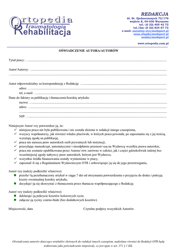REDAKCJA Al. St. Zjednoczonych 72/176 wejście E, 04-036 Warszawa tel.: (0 22) 405 42 72 tel./fax: (0 22) 834 67 72 e-mail: [email protected] [email protected] [email protected] www.ortopedia.com.pl OŚWIADCZENIE AUTORA/AUTORÓW Tytuł pracy: …......................................................................................................................................................................... Autor/Autorzy: ….................................................................................................................................................................... ….............................................................................................................................................................................................. Autor odpowiedzialny za korespondencję z Redakcją: …...................................................................................................... adres: …...................................................................................................................................................................... tel, e-mail: ….............................................................................................................................................................. Dane do faktury za publikację i tłumaczenie/korektę artykułu: nazwa: …..................................................................................................................................................................... adres: …...................................................................................................................................................................... …................................................................................................................................................................................. NIP: …........................................................................................................................................................................ Niniejszym Autor/-rzy potwierdza/-ją, że: niniejsza praca nie była publikowana i nie została złożona w redakcji innego czasopisma, wszyscy współautorzy, jak również władze placówek, w których praca powstała, po zapoznaniu się z jej treścią, wyrażają zgodę na publikację, praca nie narusza praw autorskich osób prywatnych lub instytucji, przesyłając manuskrypt, automatycznie i nieodpłatnie przenosi/-szą na Wydawcę wszelkie prawa autorskie, praca nie zostanie opublikowana przez Autora/-rów zarówno w całości, jak i części gdziekolwiek indziej bez wcześniejszej zgody nabywcy praw autorskich, którym jest Wydawca, wszystkie źródła finansowania zostały wymienione w pracy, zapoznał/-li się z Regulaminem Wydawniczym OTR i zobowiązuje/-ją się do jego przestrzegania, Autor/-rzy (należy podkreślić właściwe): prześle/-lą przetłumaczony artykuł w ciągu 7 dni od otrzymania potwierdzenia o przyjęciu do druku i pokryją koszty ewentualnej korekty artykułu, decyduje/-ją się skorzystać z tłumaczenia przez tłumacza współpracującego z Redakcją Autor/-rzy (należy podkreślić właściwe): deklaruje/-ją pokrycie kosztów kolorowych rycin. załącza/-ją ryciny czarno-białe (bez dodatkowych kosztów). Miejscowość, data Czytelne podpisy wszystkich Autorów Oświadczenia autorów dotyczące artykułów złożonych do redakcji innych czasopism, nadesłane również do Redakcji OTR będą traktowane jako poświadczenie nieprawdy, co jest ujęte w art. 271 § 1 KK.