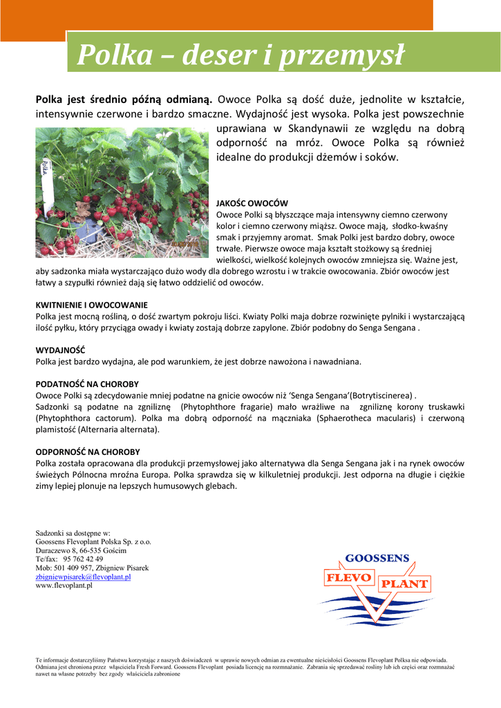Polka deser przemys Polka jest rednio pó odmian . Owoce Polka s do du e, jednolite w kszta cie, intensywnie czerwone i bardzo smaczne. Wydajno jest wysoka. Polka jest powszechnie uprawiana w Skandynawii ze wzgl du na dobr odporno na mróz. Owoce Polka s równie idealne do produkcji d emów i soków. JAKO C OWOCÓW Owoce Polki s b yszcz ce maja intensywny ciemno czerwony kolor i ciemno czerwony mi sz. Owoce maj , s odko-kwa ny smak i przyjemny aromat. Smak Polki jest bardzo dobry, owoce trwa e. Pierwsze owoce maja kszta t sto kowy s redniej wielko ci, wielko kolejnych owoców zmniejsza si . Wa ne jest, aby sadzonka mia a wystarczaj co du o wody dla dobrego wzrostu i w trakcie owocowania. Zbiór owoców jest atwy a szypu ki równie daj si atwo oddzieli od owoców. KWITNIENIE I OWOCOWANIE Polka jest mocn ro lin , o do zwartym pokroju li ci. Kwiaty Polki maja dobrze rozwini te pylniki i wystarczaj ilo py ku, który przyci ga owady i kwiaty zostaj dobrze zapylone. Zbiór podobny do Senga Sengana . WYDAJNO Polka jest bardzo wydajna, ale pod warunkiem, e jest dobrze nawo ona i nawadniana. PODATNO NA CHOROBY Owoce Polki s zdecydowanie mniej podatne na gnicie owoców ni ‘Senga Sengana’(Botrytiscinerea) . Sadzonki s podatne na zgnilizn (Phytophthore fragarie) ma o wra liwe na zgnilizn korony truskawki (Phytophthora cactorum). Polka ma dobr odporno na m czniaka (Sphaerotheca macularis) i czerwon plamisto (Alternaria alternata). ODPORNO NA CHOROBY Polka zosta a opracowana dla produkcji przemys owej jako alternatywa dla Senga Sengana jak i na rynek owoców wie ych Pólnocna mro na Europa. Polka sprawdza si w kilkuletniej produkcji. Jest odporna na d ugie i ci kie zimy lepiej plonuje na lepszych humusowych glebach. Sadzonki sa dost pne w: Goossens Flevoplant Polska Sp. z o.o. Duraczewo 8, 66-535 Go cim Te/fax: 95 762 42 49 Mob: 501 409 957, Zbigniew Pisarek [email protected] www.flevoplant.pl Te informacje dostarczyli my Pa stwu korzystaj c z naszych do wiadcze w uprawie nowych odmian za ewentualne nie cis ci Goossens Flevoplant Polksa nie odpowiada. Odmiana jest chroniona przez w sciciela Fresh Forward. Goossens Flevoplant posiada licencj na rozmna anie. Zabrania si sprzedawa rosliny lub ich cz ci oraz rozmna nawet na w asne potrzeby bez zgody w ciciela zabronione