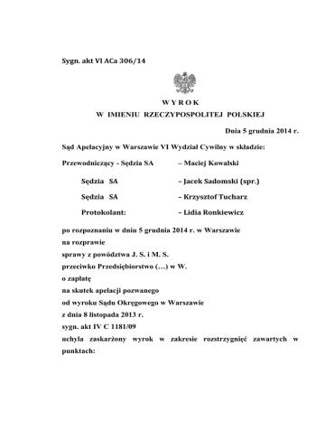 Sygn. akt VI ACa 306/14 WYROK W IMIENIU RZECZYPOSPOLITEJ POLSKIEJ Dnia 5 grudnia 2014 r. Sąd Apelacyjny w Warszawie VI Wydział Cywilny w składzie: Przewodniczący - Sędzia SA – Maciej Kowalski Sędzia SA – Jacek Sadomski (spr.) Sędzia SA – Krzysztof Tucharz Protokolant: – Lidia Ronkiewicz po rozpoznaniu w dniu 5 grudnia 2014 r. w Warszawie na rozprawie sprawy z powództwa J. S. i M. S. przeciwko Przedsiębiorstwo (…) w W. o zapłatę na skutek apelacji pozwanego od wyroku Sądu Okręgowego w Warszawie z dnia 8 listopada 2013 r. sygn. akt IV C 1181/09 uchyla zaskarżony wyrok w zakresie rozstrzygnięć zawartych w punktach: 2 pierwszym i czwartym, i w tym zakresie sprawę przekazuje Sądowi Okręgowemu w Warszawie do ponownego rozpoznania, pozostawiając temu sądowi rozstrzygnięcie o kosztach instancji odwoławczej. Sygn. akt VI ACa 306/14 Uzasadnienie Powodowie J. S. i M. S. wnieśli o zasądzenie od pozwanego Przedsiębiorstwa (…) kwoty 200 000,00 zł tytułem pokrycia kosztów rewitalizacji akustycznej budynku stanowiącego własność powodów, znajdującego się w obszarze ograniczonego użytkowania dla (…) im. (…) w W. na mocy rozporządzenia Wojewody (…) nr (…) z dnia 7 sierpnia 2007 roku w sprawie utworzenia obszaru ograniczonego użytkowania dla (…) im. (…) w W.. Pozwany nie uznał powództwa i wnosił o jego oddalenie. Wyrokiem z dnia 8 listopada 2013 r. Sąd Okręgowy w Warszawie zasądził od pozwanego solidarnie na rzecz powodów kwotę 75 504,23 zł wraz z ustawowymi odsetkami od dnia 28 stycznia 2010 r. do dnia zapłaty, a w pozostałym zakresie powództwo oddalił. Podstawą wydanego rozstrzygnięcia były następujące ustalenia i rozważania prawne sądu pierwszej instancji. Powodowie są właścicielami nieruchomości, położonej w W. przy ul. (…) o powierzchni 9 a 88 m2, oznaczona jako działka nr (…) obręb (…) dla której Sąd Rejonowy dla W. (…) prowadzi księgę wieczystą nr (…) . Nieruchomość ta zabudowana jest wolnostojącym, parterowym domem mieszkalnym z wysokim poddaszem użytkowym oraz częściowym podpiwniczeniem o powierzchni użytkowej 285,5m2. 3 Rozporządzeniem Wojewody (…) z dnia 7 sierpnia 2007 r. utworzono obszar ograniczonego użytkowania dla (…) im. (…) . Rozporządzenie to wydane zostało w oparciu o treść art. 135 ust. 2 ustawy z dnia 27 kwietnia 2001 r. Prawo ochrony środowiska. W wyniku zmiany treści art.. 135 ust. 2 ustawy, obecnie obszar ograniczonego użytkowania tworzy sejmik województwa, w drodze uchwały (przedtem obszar ten tworzony był przez wojewodę w drodze rozporządzenia). Sejmik Województwa (…) w dniu 20 czerwca 2011 r. podjął Uchwałę nr (…) w sprawie utworzenia obszaru ograniczonego użytkowania dla (…) im. (…) w W.. Nieruchomość powodów znajduje się w całości w strefie (…) hałasu. W związku z występowaniem w tej strefie poziomu hałasu powyżej przyjętych norm dopuszczalnych, budynki mieszkalne powinny posiadać zabezpieczenia akustyczne zgodnie z obowiązującą normą PN-B02151-3, która określa wymaganą izolacyjność akustyczną przegród wewnętrznych i zewnętrznych. Dla poziomu hałasu dźwięku z powietrza najistotniejsza jest wymagana izolacyjność ścian zewnętrznych z oknami i stropu/dachu. Budynek stanowiący własność powodów nie posiada zabezpieczeń zapewniających właściwy klimat akustyczny. Jak wskazał sąd okręgowy, w celu uzyskania właściwego klimatu akustycznego w tym budynku należy: 1. Dostosować strop/dach do normatywnej izolacji akustycznej dla strefy (…) poprzez zastosowanie wełny mineralnej grubości 150mm w systemie dwuwarstwowym wentylowanym 100 + 50 mm; 2. Wymienić okna na okna dźwiękochłonne o powierzchni powyżej 2 m 2; 3. Zainstalować klimatyzację budynku na parterze i na poddaszu mieszkalnym. Łączna wartość prac jakie należy wykonać (robocizna plus materiał) wyniesie 75.504,23 zł. Tak więc w niniejszej sprawie, jak wskazał sąd okręgowy, w celu uzyskania właściwego klimatu akustycznego w budynku stanowiącym własność powodów należy dokonać prac remontowych o wartości 75 504,23 zł. Mając to na uwadze, sąd okręgowy kwotę tę zasądził na rzecz powodów. Apelację od wydanego w tej sprawie wyroku wniosła strona pozwana, zaskarżając wyrok sądu okręgowego w części uwzględniającej żądanie pozwu 4 (pkt I) oraz w zakresie postanowienia o kosztach procesu (pkt IV). Skarżący wniósł o zmianę zaskarżonego wyroku i oddalenie powództwa co do kwoty 75 504, 23 zł z ustawowymi odsetkami od dnia 28 stycznia 2010 roku do dnia zapłaty, ewentualnie o uchylenie wyroku w zaskarżonej części i przekazanie sprawy do ponownego rozpoznania ze względu na nierozpoznanie przez sąd I instancji istoty sprawy oraz konieczność przeprowadzenia postępowania dowodowego w całości. W apelacji pozwanego zawarte zostały następujące zarzuty: 1) w zakresie naruszenia przepisów prawa materialnego: a) naruszenie art. 129 ust. 2 i art. 136 ust. 3 ustawy z dnia 27 kwietnia 2001 r. Prawo ochrony środowiska w związku z § 6 pkt. 2 uchwały nr (…) Sejmiku Województwa (…) z dnia 20 czerwca 2011 r. w sprawie utworzenia obszaru ograniczonego użytkowania dla (…) im. (…) W. poprzez zasądzenie odszkodowania z tytułu nakładów koniecznych na poczet zapewnienia klimatu akustycznego w pomieszczeniach budynku powodów, bez uprzedniego wykazania przez powodów braku klimatu akustycznego w pomieszczeniach ww. budynku, b) art. 481 k.c. w związku z art. 363 § 1 i 2 k.c. poprzez zasądzenie odsetek od dnia 28 stycznia 2010 r. do dnia zapłaty, a nie od dnia wyrokowania, co prowadzi do bezpodstawnego przysporzenia po stronie powodów, sprzecznego z zasadą, zgodnie z którą naprawienie szkody ma nastąpić przez zapłatę odpowiedniej sumy pieniężnej ustalonej według cen z daty ustalenia odszkodowania, c) art. 481 k.c. w związku z art. 129 ust. 2 i art. 136 ust. 3 ustawy z dnia 2