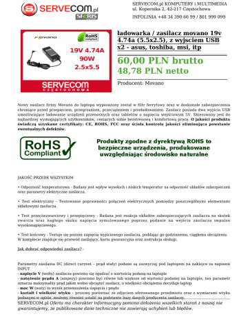 SERVECOM.pl KOMPUTERY i MULTIMEDIA ul. Kopernika 2, 42-217 Częstochowa INFOLINIA +48 34 390 66 99 / 801 999 099 ładowarka / zasilacz movano 19v 4.74a (5.5x2.5), z wyjsciem USB x2 - asus, toshiba, msi, itp 60,00 PLN brutto 48,78 PLN netto Producent: Movano Nowy zasilacz firmy Movano do laptopa wyposażony został w filtr ferrytowy oraz w doskonałe zabezpieczenia chroniące przed przepięciem, przegrzaniem, przeciążeniem i przeładowaniem. Zasilacz posiada dwa wyjścia USB umożliwiające ładowanie urządzeń przenośnych oraz tabletów o napięciu wejściowym 5V. Skierowany jest do najbardziej wymagających użytkowników, ceniących sobie bezstresową i komfortową pracę. O jakości produktu świadczą uzyskane certyfikaty: CE, ROHS, FCC oraz ścisła kontrola jakości eliminująca powstanie ewentualnych defektów. JAKOŚĆ PRZEDE WSZYSTKIM • Odporność temperaturowa - Badany jest wpływ wysokich i niskich temperatur na odporność układów zabezpieczeń oraz parametry elektryczne zasilacza. • Test elektryczny - Testowanie poprawności połączeń elektrycznych pomiędzy poszczególnymi elementami składowymi zasilacza. • Test przeciwzwarciowy i przepięciowy - Badana jest reakcja układów zabezpieczających zasilacza na skutek zwarcia oraz nagłego skoku napięcia symulowanego poprzez podanie na wejściu zasilacza impulsu wysokonapięciowego. • Test końcowy - Testuje się poziom napięcia wyjściowego zasilacza, poddając go godzinnemu, ciągłemu obciążeniu. W komplecie znajduje się przewód zasilający, karta gwarancyjna oraz instrukcja obsługi. Jak dobrać odpowiedni zasilacz? : Parametry zasilania DC (direct current – prąd stały) podane są zazwyczaj pod laptopem na naklejce za napisem INPUT - napięcie V (wolty) zasilacza powinno się zgadzać z wartością podaną na laptopie - natężenie prądu A (ampery) powinno być równe lub większe od wartości podanej na laptopie, ten parametr oznacza maksymalny prąd jakim wolno obciążyć zasilacz, o wielkości obciążenia decyduje laptop - moc W (waty) to wynik przemnożenia napięcia i prądu - kształt i wielkość wtyku – prosimy porównać ze zdjęciem oferowanego przedmiotu oraz z wymiarami wtyku podanymi w opisie; możemy również ustalić na podstawie bazy danych producenta zasilaczy. SERVECOM.pl Oferta ma charakter informacyjny pomimo dołożenia wszelkich starań z naszej nie gwarantujemy, że publikowane dane techniczne nie zawierają uchybień lub błędów. Model: ZZ/LIT19474USB Kompatybilne z: Acer seria Aspire 1300, 1350, 1450, E5-573G, E5-573G-31Q2, E5-573G-59CS, V3-371, seria Aspire V15 nitro VN7-571, seria Ferrari 1000, 3000, 3200, 3400, 4000, 5000, Actina VIPER, WEBBOOK, Adax 2300GT, Advent 1015 NORDIC, 2027, 3082 NORDIC, 7001, 7004, 7099, 8215, PARAMETRY TECHNICZNE Stan fabrycznie nowy Wejście AC 100-240V Wyjście 19V 4.74A, 2xUSB Moc 90W Wtyk Średnica zewnętrzna 5.5 mm, średnica wewnętrzna 2.5 mm, długość 12 mm Wymiary 133 x 59 x 32 mm Gwarancja 24 miesiące SERVECOM.pl Oferta ma charakter informacyjny pomimo dołożenia wszelkich starań z naszej nie gwarantujemy, że publikowane dane techniczne nie zawierają uchybień lub błędów.