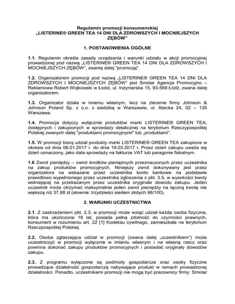 Regulamin promocji konsumenckiej „LISTERINE® GREEN TEA 14 DNI DLA ZDROWSZYCH I MOCNIEJSZYCH ZĘBÓW” 1. POSTANOWIENIA OGÓLNE 1.1. Regulamin określa zasady urządzania i warunki udziału w akcji promocyjnej prowadzonej pod nazwą „LISTERINE® GREEN TEA 14 DNI DLA ZDROWSZYCH I MOCNIEJSZYCH ZĘBÓW”, zwanej dalej "promocją". 1.2. Organizatorem promocji pod nazwą „LISTERINE® GREEN TEA 14 DNI DLA ZDROWSZYCH I MOCNIEJSZYCH ZĘBÓW” jest Smolar Agencja Promocyjno – Reklamowa Robert Wojkowski w Łodzi, ul. Inżynierska 15, 93-569 Łódź, zwana dalej organizatorem. 1.3. Organizator działa w imieniu własnym, lecz na zlecenie firmy Johnson & Johnson Poland Sp. z o.o. z siedzibą w Warszawie, ul. Iłżecka 24, 02 – 135 Warszawa. 1.4. Promocja dotyczy wyłącznie produktów marki LISTERINE® GREEN TEA, dostępnych i zakupionych w sprzedaży detalicznej na terytorium Rzeczypospolitej Polskiej zwanych dalej "produktami promocyjnymi" lub „produktami”. 1.5. W promocji biorą udział produkty marki LISTERINE® GREEN TEA zakupione w okresie od dnia 06.01.2017 r. do dnia 19.03.2017 r. Przez dzień zakupu uważa się dzień oznaczony, jako data sprzedaży na fakturze VAT lub paragonie fiskalnym. 1.6 Zwrot pieniędzy – zwrot środków pieniężnych przeznaczonych przez uczestnika na zakup produktów promocyjnych. Niniejszy zwrot dokonywany jest przez organizatora na wskazane przez uczestnika konto bankowe na podstawie prawidłowo wypełnionego przez uczestnika zgłoszenia z pkt. 3.5, w wysokości kwoty widniejącej na przekazanym przez uczestnika oryginale dowodu zakupu. Jeden uczestnik może otrzymać maksymalnie jeden zwrot pieniędzy na łączną kwotę nie większą niż 37,98 zł (słownie: trzydzieści siedem złotych 98/100). 2. WARUNKI UCZESTNICTWA 2.1. Z zastrzeżeniem pkt. 2.3, w promocji może wziąć udział każda osoba fizyczna, która ma ukończone 18 lat, posiada pełną zdolność do czynności prawnych, konsument w rozumieniu art. 22 [1] Kodeksu cywilnego, zamieszkała na terytorium Rzeczpospolitej Polskiej. 2.2. Osoba zgłaszająca udział w promocji (zwana dalej „uczestnikiem”) może uczestniczyć w promocji wyłącznie w imieniu własnym i na własną rzecz oraz powinna dokonać zakupu produktów promocyjnych i posiadać oryginały dowodów zakupu. 2.3. Z programu wyłączone są podmioty gospodarcze oraz osoby fizyczne prowadzące działalność gospodarczą nabywające produkt w ramach prowadzonej działalności. Ponadto, uczestnikami promocji nie mogą być pracownicy firmy: Smolar Agencja Promocyjno – Reklamowa Robert Wojkowski w Łodzi oraz Johnson & Johnson Poland Sp. z o.o. z siedzibą w Warszawie. Zakaz dotyczy także członków ich rodzin; przez „członków rodzin” rozumie się: małżonka, zstępnych, wstępnych, osoby pozostające w stosunku przysposobienia, pasierba, pasierbicę, zięcia, synową, rodzeństwo, ojczyma, macochę i teściów. 2.4. Biorący udział w promocji „LISTERINE® GREEN TEA 14 DNI DLA ZDROWSZYCH I MOCNIEJSZYCH ZĘBÓW” uczestnik potwierdza, że wyraża zgodę na zasady promocji „LISTERINE® GREEN TEA 14 DNI DLA ZDROWSZYCH I MOCNIEJSZYCH ZĘBÓW” opisane w niniejszym regulaminie. 3. SZCZEGÓŁOWE ZASADY PROMOCJI 3.1. W celu wzięcia udziału w promocji uczestnik powinien: - nabyć w czasie trwania promocji minimum dwa produkty LISTERINE® GREEN TEA o pojemności 500ml zgodnie z pkt. 1.4 regulaminu, - dokonać zapłaty za produkty promocyjne i koniecznie zachować dowód zakupu, - wypróbować minimum 560ml produktu promocyjnego przez okres co najmniej 14 dni, termin 14 dni liczony jest od daty nabycia produktów, - dokonać prawidłowego zgłoszenia do promocji, zgodnie z warunkami wskazanymi w pkt. 3.5 regulaminu. 3.2. W promocji biorą udział wyłącznie produkty promocyjne nabyte przez uczestnika w punkcie sprzedaży detalicznej na terytorium Rzeczypospolitej Polskiej w czasie trwania promocji zgodnie z pkt. 1.5 regulaminu. W promocji nie będą brały udziału produkty, których wprowadzenie do obrotu narusza prawo, w szczególności produkty podrobione. 3.3. Jeden uczestnik może dokonać tylko jednego zgłoszenia produktów promocyjnych z pkt. 1.4 regulaminu i uzyskać prawo do tylko jednego zwrotu pieniędzy na zasadach określonych w regulaminie. Uczestnikowi nie będą przysługiwały w związku z tym jakiekolwiek roszczenia, poza zwrotem pieniędzy, o ile uczestnik spełnił wszystkie kryteria uzyskania takiego zwrotu określone w regulaminie. 3.4. Celem promocji jest weryfikacja satysfakcji konsumentów z użycia produktu promocyjnego. W związku z powyższym uczestnikowi, który pomimo prawidłowego stosowania produktu nie uzyskał satysfakcji z jego zastosowania, przysługuje prawo złożenia pisemnego formularza zgłoszenia w tym zakresie zgodnie z pkt 3.5 regulaminu, dalej zwanego "zgłoszeniem". 3.5. Zgłoszenie, pod rygorem odmowy zwrotu pieniędzy, powinno zawierać łącznie następujące elementy i informacje: a. oryginał dowodu zakupu produktów promocyjnych dokonanego w czasie trwania promocji (paragon, rachunek lub faktura VAT – wystawiona na osobę fizyczną nieprowadzącą działalności gospodarczej) zawierający: datę zakupu, cenę, nazwę sklepu oraz nazwę produktów promocyjnych (należy dołączyć oryginały dowodów zakupu w odniesieniu do wszystkich produktów promocyjnych); b. pisemną informację zawierającą: - imię i nazwisko, - nr telefonu kontaktowego uczestnika, - dokładny adres zameldowania, - nr konta bankowego uczestnika, na który ma zostać przesłany zwrot pieniędzy; - krótkie wyjaśnienie, dlaczego uczestnik nie jest zadowolony z produktów promocyjnych; c. zgodę na przetwarzanie danych osobowych, wyrażoną poprzez złożenie własnoręcznego podpisu pod sporządzonym oświadczeniem o następującej treści: „Wyrażam zgodę na przetwarzanie moich danych osobowych zgodnie z Ustawą z dnia 29 sierpnia 1997 r. o ochronie danych osobowych (Dz.U. 2015
