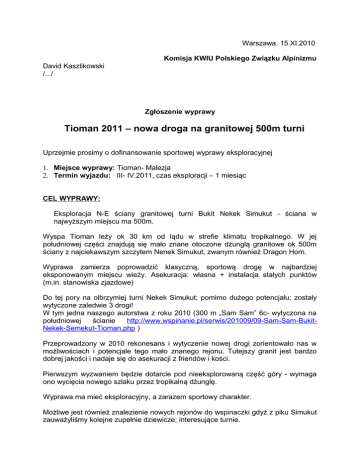 Warszawa. 15.XI.2010 Komisja KWIU Polskiego Związku Alpinizmu David Kaszlikowski /.../ Zgłoszenie wyprawy Tioman 2011 – nowa droga na granitowej 500m turni Uprzejmie prosimy o dofinansowanie sportowej wyprawy eksploracyjnej 1. Miejsce wyprawy: Tioman- Malezja 2. Termin wyjazdu: III- IV.2011, czas eksploracji – 1 miesiąc CEL WYPRAWY: Eksploracja N-E ściany granitowej turni Bukit Nekek Simukut - ściana w najwyższym miejscu ma 500m. Wyspa Tioman leży ok 30 km od lądu w strefie klimatu tropikalnego. W jej południowej części znajdują się mało znane otoczone dżunglą granitowe ok 500m ściany z najciekawszym szczytem Nenek Simukut, zwanym również Dragon Horn. Wyprawa zamierza poprowadzić klasyczną, sportową drogę w najbardziej eksponowanym miejscu wieży. Asekuracja: własna + instalacja stałych punktów (m.in. stanowiska zjazdowe) Do tej pory na olbrzymiej turni Nekek Simukut; pomimo dużego potencjału; zostały wytyczone zaledwie 3 drogi! W tym jedna naszego autorstwa z roku 2010 (300 m „Sam Sam” 6c- wytyczona na południowej ścianie http://www.wspinanie.pl/serwis/201009/09-Sam-Sam-BukitNekek-Semekut-Tioman.php ) Przeprowadzony w 2010 rekonesans i wytyczenie nowej drogi zorientowało nas w możliwościach i potencjale tego mało znanego rejonu. Tutejszy granit jest bardzo dobrej jakości i nadaje się do asekuracji z friendów i kości. Pierwszym wyzwaniem będzie dotarcie pod nieeksplorowaną część góry - wymaga ono wycięcia nowego szlaku przez tropikalną dżunglę. Wyprawa ma mieć eksploracyjny, a zarazem sportowy charakter. Możliwe jest również znalezienie nowych rejonów do wspinaczki gdyż z piku Simukut zauważyliśmy kolejne zupełnie dziewicze; interesujące turnie. Zdjęcie od lewej: Nanek Simukut ściana ok. 500m, wieża płd.: linie naszkicowane tylko przybliżeniu 1-3 drogi istniejące: 1. "Beckwith-Traver" (5.10 A3, 14 wyciągów, 400m) 2. Waking Dream (V 5.9 A2, 10 wyciągów, klasycznie ok. 7c+) 3.Sam Sam (300,6c+) – linia niewidoczna po tej stronie ściany, przybliżony przebieg po północnej ścianie) 4, 5 – linie potencjalne, którymi jesteśmy zainteresowani. Zdjęcie prawe: droga nr 3 z 2010 – „Sam, Sam” prowadzi lewą skrajną linią płd wieży, potencjalna linia nr4 prowadzi lewym skrajem lewej wieży. Ściana z tyłu to wieża płn., większa i niezdobyta, ale mało interesująca wspinaczkowo. O rejonie cytat z http://www.wspinanie.pl/serwis/200911/30egzotyczne-bigwalle.php , z notki Wilana : „….Pomimo zainteresowania wielu wspinaczy, wyrastająca prosto z dżungli turnia przez wiele lat oferowała tylko jedną drogę na szczyt (Waking Dream 5.9 A2, Nelson-Tomlin, 1999) na południowej ścianie południowej wieży. W 2002 roku malezyjski zespól wytyczył prawie klasyczny wariant, co przyciągnęło uwagę zachodnich wspinaczy, którzy w 2004 roku ostatecznie uklasycznili ten wariant, wyceniając go na 5.13a. Odwiedzający w 2006 roku wyspę Traver dostrzegł wspinaczkowy potencjał tych ścian i powrócił na wyspę ostatniego lata, by wraz z Beckwithem zaatakować dziewiczą zachodnią ścianę południowej turni. Wybrana przez nich linia oferowała wyzwanie w postaci 12 metrowego dachu ochrzczonego przez wspinaczy "The Great Roof". Dotarcie pod ścianę i transport worów przez dżunglę zajęło im 16 dni. Wgląd z Wielkiego Okapu w zachodnią ścianę Dragon's Horns (fot. Steve Beckwith) W ciągu pięciu dni wspięli się w stylu kapsułowym zachodnią ścianą, osiągając wierzchołek południowej wieży, jako drugi zespól w ogóle. Ich droga Beckwith-Traver (5.10 A3, 400 m) oferuje czternaście wyciągów wymagających zastosowania szerokiego spektrum technik asekuracyjnych. W kilku miejscach, gdzie nie dało się założyć nic własnego, Walijczycy wbili kilka spitów. Obaj też w swojej relacji zwracają uwagę na duży potencjał okolicznych ścian na czele z północną wieżą, która pomimo kilku logicznych potencjalnie linii, nie doczekała się do tej pory wejścia…. „ CEL rezerwowy WYPRAWY: Zespół pracuje nad organizacją kolejnej afrykańskiej wyprawy na mało eksplorowane turnie w Mozambiku (Mlema, Chief) . Granit w szeroko pojętym rejonie szczytów Mlema i Rebawe, Marapie, Sitting Chief w prowincji Nampula to płytowe wspinanie przypominające sławną ścianę Tsaranoro na Madagaskarze. W/w ściany w Mozambiku są także podobnej wielkości jak Tsaranoro i mają ok. 700m wysokości. W całym masywie wytyczono zaledwie ok.10 wielowyciągowych dróg. Istnieje, więc możliwość praktycznie nieograniczonej eksploracji. Ta wyprawa jest jednak szczególnie kosztowna, i planujemy wyprawę tylko w razie znalezienia odpowiedniego wsparcia sponsorskiego. (Pytanie do Komisji o możliwość zmiany celu – z Tioman na Mozambik w razie znalezienia odpowiedniego dofinansowania na droższą wyprawę) Zdjęcie z archiwum Alarda Huffnera : Powyżej masywy zupełnie nie eksplorowane. 3. Członkowie wyprawy: David Kaszlikowski - kierownik wyprawy /.../ - przynależność klubowa:, UKA, KW Warszawa - Instruktor Wspinaczki Sportowej AWF Warszawa nr. Licencji:1094 - liczba sezonów czynnego uprawiania wspinaczki: 19 - poziom sportowy: 8b/b+ RP; 7c+ OS Eliza Kubarska: /.../ - Instruktor Wspinaczki Sportowej AWF Warszawa nr. Licencji: 1095 - Liczba sezonów czynnego uprawiania wspinaczki: 15 - poziom sportowy: 8a RP; 7c OS Udział wezmą także wspinacze z Francji. 4. Koszty Wyprawa Tioman: Koszty ekipy to suma 26 000 zł (13 000 zł/os) w tym: przeloty + ew.cargo sprzętu,noclegi, żywność, sprzęt 5. Sposób finansowania. Dofinansowanie PZA + sponsorzy zewnętrzni + środki własne. 6. Najważniejsze drogi i wyprawy zespołu oraz wcześniejsze dofinansowania • 2010 – Tioman, Malezja nowa droga na turni Nenek Semukut , pierwsza oryginalnie klasyczna linia na ścianie (300m, 6c+), od dołu, na własnej), (bez dof.) Sportowe przejścia RP do 8b David, 8a Eliza. • 2009 - Grenlandia: 2 nowe drogi - 