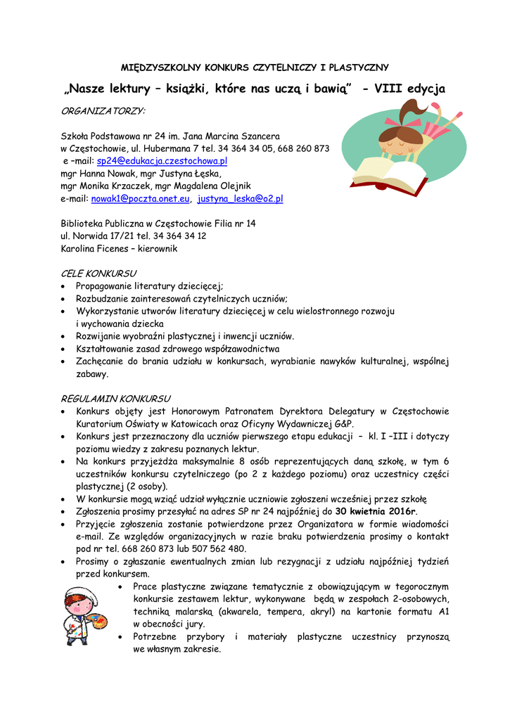 MIĘDZYSZKOLNY KONKURS CZYTELNICZY I PLASTYCZNY „Nasze lektury – książki, które nas uczą i bawią” - VIII edycja ORGANIZATORZY: Szkoła Podstawowa nr 24 im. Jana Marcina Szancera w Częstochowie, ul. Hubermana 7 tel. 34 364 34 05, 668 260 873 e –mail: [email protected] mgr Hanna Nowak, mgr Justyna Łęska, mgr Monika Krzaczek, mgr Magdalena Olejnik e-mail: [email protected], [email protected] Biblioteka Publiczna w Częstochowie Filia nr 14 ul. Norwida 17/21 tel. 34 364 34 12 Karolina Ficenes – kierownik CELE KONKURSU Propagowanie literatury dziecięcej; Rozbudzanie zainteresowań czytelniczych uczniów; Wykorzystanie utworów literatury dziecięcej w celu wielostronnego rozwoju i wychowania dziecka Rozwijanie wyobraźni plastycznej i inwencji uczniów. Kształtowanie zasad zdrowego współzawodnictwa Zachęcanie do brania udziału w konkursach, wyrabianie nawyków kulturalnej, wspólnej zabawy. REGULAMIN KONKURSU Konkurs objęty jest Honorowym Patronatem Dyrektora Delegatury w Częstochowie Kuratorium Oświaty w Katowicach oraz Oficyny Wydawniczej G&P. Konkurs jest przeznaczony dla uczniów pierwszego etapu edukacji – kl. I –III i dotyczy poziomu wiedzy z zakresu poznanych lektur. Na konkurs przyjeżdża maksymalnie 8 osób reprezentujących daną szkołę, w tym 6 uczestników konkursu czytelniczego (po 2 z każdego poziomu) oraz uczestnicy części plastycznej (2 osoby). W konkursie mogą wziąć udział wyłącznie uczniowie zgłoszeni wcześniej przez szkołę Zgłoszenia prosimy przesyłać na adres SP nr 24 najpóźniej do 30 kwietnia 2016r. Przyjęcie zgłoszenia zostanie potwierdzone przez Organizatora w formie wiadomości e-mail. Ze względów organizacyjnych w razie braku potwierdzenia prosimy o kontakt pod nr tel. 668 260 873 lub 507 562 480. Prosimy o zgłaszanie ewentualnych zmian lub rezygnacji z udziału najpóźniej tydzień przed konkursem. Prace plastyczne związane tematycznie z obowiązującym w tegorocznym konkursie zestawem lektur, wykonywane będą w zespołach 2-osobowych, techniką malarską (akwarela, tempera, akryl) na kartonie formatu A1 w obecności jury. Potrzebne przybory i materiały plastyczne uczestnicy przynoszą we własnym zakresie. Laureaci otrzymają nagrody i dyplomy; Prace zostaną zaprezentowane na wystawie w Szkole Podstawowej nr 24 w Częstochowie, a następnie w ramach wystawy pokonkursowej w Bibliotece Publicznej Filia nr 14 przy ul. Norwida 17/21 w Częstochowie; Laureatów wyłoni komisja powołana przez organizatorów konkursu; do której będą zaproszone osoby zawodowo związane ze sztuką; Regulamin oraz protokół z konkursu dostępne będą na stronie internetowej szkoły: http://www.sp24czestochowa.edupage.org/ oraz biblioteki http://www.biblioteka.czest.pl/filia14 . Udział w konkursie jest równoznaczny z wyrażeniem zgody na przetwarzanie danych osobowych uczestników i ich opiekunów oraz wykorzystanie ich wizerunku w postaci zdjęć i filmów w zakresie niezbędnym do realizacji konkursu. TERMIN I MIEJSCE KONKURSU Etap międzyszkolny konkursu czytelniczego oraz plastycznego odbędzie się 18 maja 2016r. o godz. 9.00 w Szkole Podstawowej nr 24 im. Jana Marcina Szancera w Częstochowie O ewentualnych zmianach zainteresowane szkoły zostaną powiadomione drogą elektroniczną lub telefoniczną. Uczestników obowiązuje znajomość następujących lektur: Klasa I G. Kasdepke „Detektyw Pozytywka” J. Tuwim „Słoń Trąbalski” J. Brzechwa „Na wyspach Bergamutach” Klasa II H.Ch „Calineczka” J. Brzechwa „Kaczka Dziwaczka” A. A. Milne „Kubuś Puchatek” Klasa III R.Goscinny, J.Sempé „Mikołajek” A. Lindgren „Dzieci z Bullerbyn” H. Ch. Andersen „Królowa Śniegu” SERDECZNIE ZAPRASZAMY ! KARTA ZGŁOSZENIA MIĘDZYSZKOLNY KONKURS CZYTELNICZY I PLASTYCZNY „NASZE LEKTURY – KSIĄŻKI, KTÓRE NAS UCZĄ I BAWIĄ” - VIII EDYCJA Nazwa szkoły Adres szkoły e-mail Telefon kontaktowy Klasa I Imię i nazwisko ucznia Imię i nazwisko nauczyciela Klasa II Imię i nazwisko ucznia Imię i nazwisko nauczyciela Klasa III Imię i nazwisko ucznia Imię i nazwisko nauczyciela Konkurs plastyczny Imię i nazwisko ucznia Imię i nazwisko nauczyciela Udział w konkursie jest równoznaczny z wyrażeniem zgody na przetwarzanie danych osobowych uczestników i ich opiekunów oraz wykorzystanie ich wizerunku w postaci zdjęć i filmów w zakresie niezbędnym do realizacji konkursu.