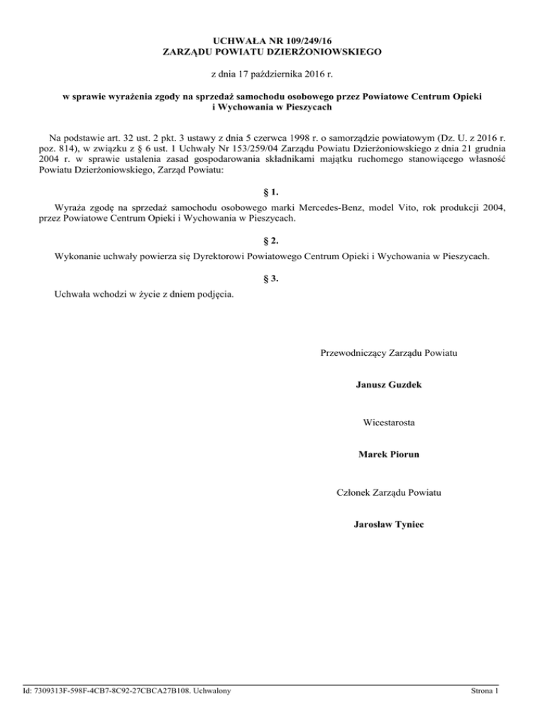 UCHWAŁA NR 109/249/16 ZARZĄDU POWIATU DZIERŻONIOWSKIEGO z dnia 17 października 2016 r. w sprawie wyrażenia zgody na sprzedaż samochodu osobowego przez Powiatowe Centrum Opieki i Wychowania w Pieszycach Na podstawie art. 32 ust. 2 pkt. 3 ustawy z dnia 5 czerwca 1998 r. o samorządzie powiatowym (Dz. U. z 2016 r. poz. 814), w związku z § 6 ust. 1 Uchwały Nr 153/259/04 Zarządu Powiatu Dzierżoniowskiego z dnia 21 grudnia 2004 r. w sprawie ustalenia zasad gospodarowania składnikami majątku ruchomego stanowiącego własność Powiatu Dzierżoniowskiego, Zarząd Powiatu: § 1. Wyraża zgodę na sprzedaż samochodu osobowego marki Mercedes-Benz, model Vito, rok produkcji 2004, przez Powiatowe Centrum Opieki i Wychowania w Pieszycach. § 2. Wykonanie uchwały powierza się Dyrektorowi Powiatowego Centrum Opieki i Wychowania w Pieszycach. § 3. Uchwała wchodzi w życie z dniem podjęcia. Przewodniczący Zarządu Powiatu Janusz Guzdek Wicestarosta Marek Piorun Członek Zarządu Powiatu Jarosław Tyniec Id: 7309313F-598F-4CB7-8C92-27CBCA27B108. Uchwalony Strona 1 UZASADNIENIE W dniu 21 października 2016 r. Dyrektor Powiatowego Centrum Opieki i Wychowania w Pieszycach złożył wniosek o wyrażenie zgody na sprzedaż będącego w użytkowaniu placówki samochodu osobowego o nr rejestracyjnym DDZ 03GF, marki Mercedes-Benz, model Vito, liczba miejsc 9, rok produkcji 2004, przebieg 426.000 km, o szacunkowej wartości ok. 10.000 zł. Jednostki organizacyjne powiatu nie wykazały zainteresowania nieodpłatnym przejęciem pojazdu. Zgodnie z § 6 ust. 1 Uchwały nr 153/259/04 Zarządu Powiatu Dzierżoniowskiego z dnia 21 grudnia 2004 r. w sprawie ustalenia zasad gospodarowania składnikami majątku ruchomego stanowiącego własność Powiatu Dzierżoniowskiego przed dokonaniem sprzedaży, nieodpłatnego przekazania innej jednostce, darowizny i likwidacji zbędnych lub zużytych składników majątku ruchomego kierownik jednostki zobowiązany jest uzyskać zgodę Zarządu Powiatu Dzierżoniowskiego. Mając powyższe na uwadze, zasadne jest podjęcie niniejszej uchwały. Id: 7309313F-598F-4CB7-8C92-27CBCA27B108. Uchwalony Strona 1