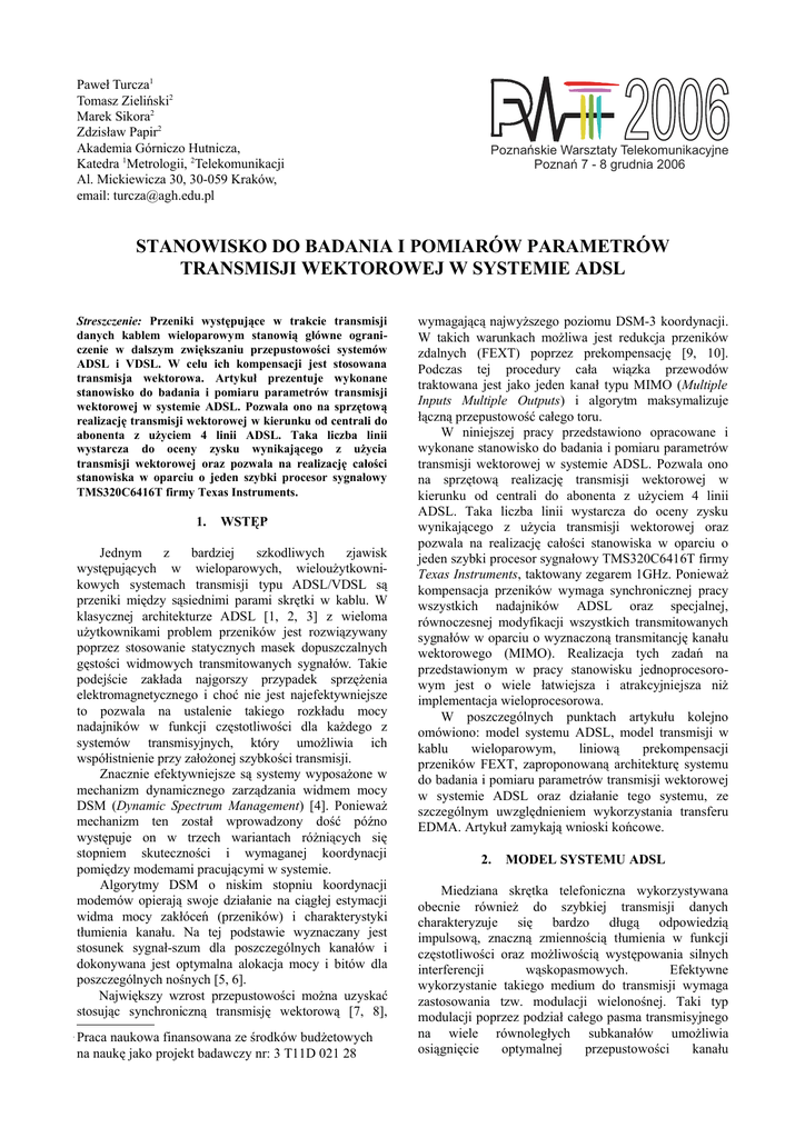 Paweł Turcza1 Tomasz Zieliński2 Marek Sikora2 Zdzisław Papir2 Akademia Górniczo Hutnicza, Katedra 1Metrologii, 2Telekomunikacji Al. Mickiewicza 30, 30-059 Kraków, email: [email protected] 2006 Poznańskie Warsztaty Telekomunikacyjne Poznań 7 - 8 grudnia 2006 STANOWISKO DO BADANIA I POMIARÓW PARAMETRÓW TRANSMISJI WEKTOROWEJ W SYSTEMIE ADSL Streszczenie: Przeniki występujące w trakcie transmisji danych kablem wieloparowym stanowią główne ograniczenie w dalszym zwiększaniu przepustowości systemów ADSL i VDSL. W celu ich kompensacji jest stosowana transmisja wektorowa. Artykuł prezentuje wykonane stanowisko do badania i pomiaru parametrów transmisji wektorowej w systemie ADSL. Pozwala ono na sprzętową realizację transmisji wektorowej w kierunku od centrali do abonenta z użyciem 4 linii ADSL. Taka liczba linii wystarcza do oceny zysku wynikającego z użycia transmisji wektorowej oraz pozwala na realizację całości stanowiska w oparciu o jeden szybki procesor sygnałowy TMS320C6416T firmy Texas Instruments. 1. WSTĘP Jednym z bardziej szkodliwych zjawisk występujących w wieloparowych, wieloużytkownikowych systemach transmisji typu ADSL/VDSL są przeniki między sąsiednimi parami skrętki w kablu. W klasycznej architekturze ADSL [1, 2, 3] z wieloma użytkownikami problem przeników jest rozwiązywany poprzez stosowanie statycznych masek dopuszczalnych gęstości widmowych transmitowanych sygnałów. Takie podejście zakłada najgorszy przypadek sprzężenia elektromagnetycznego i choć nie jest najefektywniejsze to pozwala na ustalenie takiego rozkładu mocy nadajników w funkcji częstotliwości dla każdego z systemów transmisyjnych, który umożliwia ich współistnienie przy założonej szybkości transmisji. Znacznie efektywniejsze są systemy wyposażone w mechanizm dynamicznego zarządzania widmem mocy DSM (Dynamic Spectrum Management) [4]. Ponieważ mechanizm ten został wprowadzony dość późno występuje on w trzech wariantach różniących się stopniem skuteczności i wymaganej koordynacji pomiędzy modemami pracującymi w systemie. Algorytmy DSM o niskim stopniu koordynacji modemów opierają swoje działanie na ciągłej estymacji widma mocy zakłóceń (przeników) i charakterystyki tłumienia kanału. Na tej podstawie wyznaczany jest stosunek sygnał-szum dla poszczególnych kanałów i dokonywana jest optymalna alokacja mocy i bitów dla poszczególnych nośnych [5, 6]. Największy wzrost przepustowości można uzyskać stosując synchroniczną transmisję wektorową [7, 8], Praca naukowa finansowana ze środków budżetowych na naukę jako projekt badawczy nr: 3 T11D 021 28 wymagającą najwyższego poziomu DSM-3 koordynacji. W takich warunkach możliwa jest redukcja przeników zdalnych (FEXT) poprzez prekompensację [9, 10]. Podczas tej procedury cała wiązka przewodów traktowana jest jako jeden kanał typu MIMO (Multiple Inputs Multiple Outputs) i algorytm maksymalizuje łączną przepustowość całego toru. W niniejszej pracy przedstawiono opracowane i wykonane stanowisko do badania i pomiaru parametrów transmisji wektorowej w systemie ADSL. Pozwala ono na sprzętową realizację transmisji wektorowej w kierunku od centrali do abonenta z użyciem 4 linii ADSL. Taka liczba linii wystarcza do oceny zysku wynikającego z użycia transmisji wektorowej oraz pozwala na realizację całości stanowiska w oparciu o jeden szybki procesor sygnałowy TMS320C6416T firmy Texas Instruments, taktowany zegarem 1GHz. Ponieważ kompensacja przeników wymaga synchronicznej pracy wszystkich nadajników ADSL oraz specjalnej, równoczesnej modyfikacji wszystkich transmitowanych sygnałów w oparciu o wyznaczoną transmitancję kanału wektorowego (MIMO). Realizacja tych zadań na przedstawionym w pracy stanowisku jednoprocesorowym jest o wiele łatwiejsza i atrakcyjniejsza niż implementacja wieloprocesorowa. W poszczególnych punktach artykułu kolejno omówiono: model systemu ADSL, model transmisji w kablu wieloparowym, liniową prekompensacji przeników FEXT, zaproponowaną architekturę systemu do badania i pomiaru parametrów transmisji wektorowej w systemie ADSL oraz działanie tego systemu, ze szczególnym uwzględnieniem wykorzystania transferu EDMA. Artykuł zamykają wnioski końcowe. 2. MODEL SYSTEMU ADSL Miedziana skrętka telefoniczna wykorzystywana obecnie również do szybkiej transmisji danych charakteryzuje się bardzo długą odpowiedzią impulsową, znaczną zmiennością tłumienia w funkcji częstotliwości oraz możliwością występowania silnych interferencji wąskopasmowych. Efektywne wykorzystanie takiego medium do transmisji wymaga zastosowania tzw. modulacji wielonośnej. Taki typ modulacji poprzez podział całego pasma transmisyjnego na wiele równoległych subkanałów umożliwia osiągnięcie optymalnej przepustowości kanału −1 −1 −1 X = W P h∗P W X n (1) gdzie (x∗y) oznacza splot x z y, tzn wektor, którego ity element jest równy ∑jx(j)y(i-j), W jest macierzą dyskretnej transformacji Fouriera, a [ P= 0 P× N−P I P IN ] FEQ W + TEQ FFT -1 c S/P CP xN-1,k P/S+CP XN-1,k ν W Λ X0,k X1,k XN-1,k h(n) -1 P P -1 Rys 1. Schemat blokowy modemu ADSL. użytkownika (z uwzględnieniem przeników FEXT od pozostałych K-1 użytkowników) może być zapisane w formie K k k −1 −1 k ,m −1 m k X n = W P ∑ h ∗P W X n n (2) m=1 gdzie hk,m= [hk,m(0), …, hk,m(Lh)]T jest odpowiedzią impulsową kanału łączącego m–ty nadajnik z k–tym odbiornikiem (rys. 2). Jeśli dodatkowo długości odpowiedzi impulsowych hk,m nie przekraczają długości cyklicznego prefiksu, to przeniki od różnych częstotliwości nośnych są do siebie ortogonalne – podobnie jak same nośne. Pozwala to na analizę równania (2) niezależnie dla poszczególnych nośnych. Z tego powodu wartości symboli odebranych przez użytkowników na i-tej nośnej są równe −1 i P =[ 0N ×P I N ] −1 są macierzami odpowiedzialnymi za wprowadzenie i 