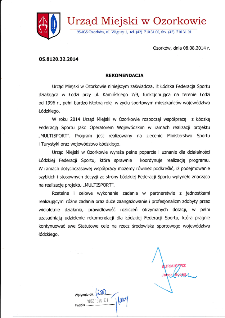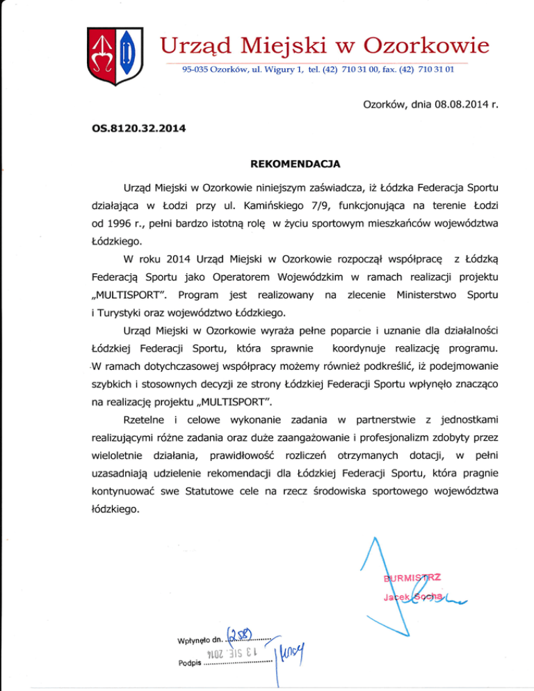 Urząd Miejski w Ozorkowie 95-035 Ozclrków, ul. Wigury 1, tel. @2) 7l0 3100, fax, (42) 710 31 01 Ozorków, dnia 0B.OB.2014 r. os.8120.32.2014 REKOMENDACJA Urząd Miejski w Ozorkowie niniejszym zaświadcza, iż Łódzka Federacja Sportu działająca w Łodzi przy ul. Kamińskiego 7l9, funkcjonująca na terenie Łodzi od 1996 r., pełni bardzo istotną rolę w zyciu spoftowym mieszkańców województwa Łódzkiego. W roku 2014 Urząd Miejski w Ozorkowie rozpoczął współpracę z Łódzką Federacją Sportu jako Operatorem Wojewódzkim w ramach realizacji projektu ,,MULTISPORT". Prograrn i jest realizowany na zlecenie Ministerstwo Spoftu TurysĘki oraz województwo Łódzkiego. |,Jrząd Miejski w Ozorkowie wyraza pełne poparcie i uznanie dla działalności Łódzkiej Federacji Spoftu, Kóra sprawnie koordynuje realizację programu. .W ramach doĘchczasowej współpracy mozemy równiez podkreślić,iz podejmowanie szybkich i stosownych decyzji ze strony Łódzkiej Federacji Spoftu wpłynęłoznacząco na realizację projektu,,MULTISPORT", Rzetelne i celowe wykonanie zadania w paftnerstwie z realizującymi rózne zadania oraz duże zaangażowanie i profesjonalizm jednostkami zdobfi wieloletnie działania, prawidłowośćrozliczeń otrzymanych dotacji, w przez pełni uzasadniają udzielenie rekomendacji dla Łódzkiej Federacji Spoftu, która pragnie kontynuować swe Statutowe cele na rzecz środowiskasportowego łódzkiego. $S ""[l ' \V!Ą Tnz,jls 1!: wplynęłoo. jl |91 Podpis,,.,.......,......"""""""'I' \* l województwa