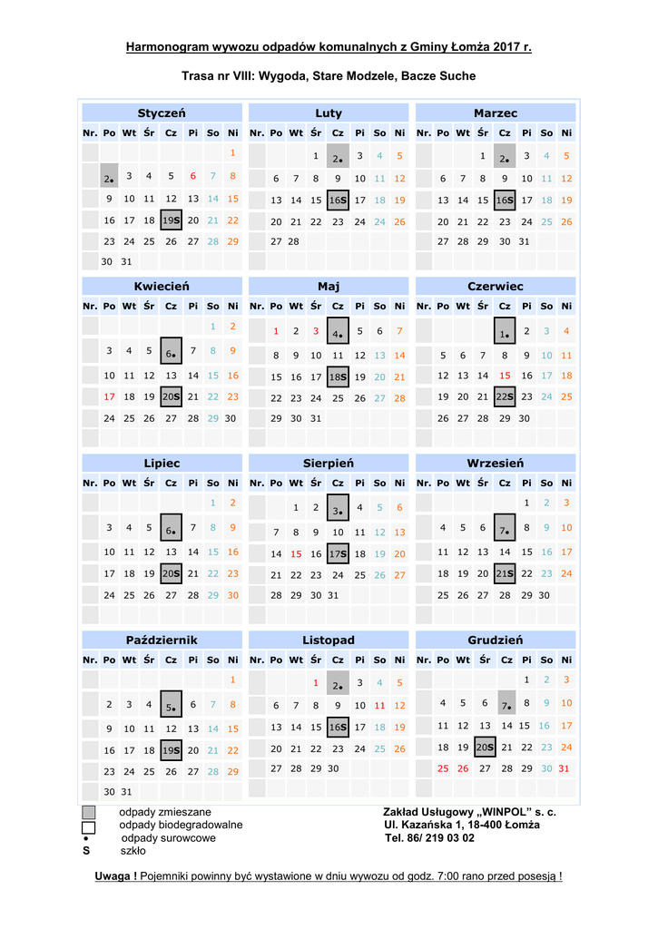 Harmonogram wywozu odpadów komunalnych z Gminy Łomża 2017 r. Trasa nr VIII: Wygoda, Stare Modzele, Bacze Suche Styczeń Nr. Po Wt Śr 2 . 9 3 4 10 11 Cz Luty Pi 5 12 6 So Ni Nr. Po Wt Śr 1 1 2 8 9 7 8 13 14 15 6 7 Marzec Cz Pi . 3 So Ni 4 Nr. Po Wt Śr 5 10 11 12 6 7 Cz Pi . 3 1 2 8 9 So Ni 4 5 10 11 12 13 14 15 16S 17 18 19 13 14 15 16S 17 18 19 16 17 18 19S 20 21 22 20 21 22 20 21 22 23 23 24 25 27 28 27 28 29 30 31 26 27 28 29 23 24 24 26 24 25 26 30 31 Kwiecień Nr. Po Wt Śr 3 4 5 10 11 12 Cz 6 . 13 Maj Pi 7 So Ni 1 2 8 9 Cz Pi . 5 1 2 3 4 8 9 10 11 So Ni 6 Nr. Po Wt Śr 7 12 13 14 Cz Pi . 2 8 9 1 5 6 7 3 4 10 11 12 13 14 17 18 19 20S 21 22 23 22 23 24 19 20 21 22S 23 24 25 24 25 26 29 30 31 28 29 30 Lipiec Nr. Po Wt Śr 3 4 5 10 11 12 Cz 6 . 13 25 26 27 28 26 27 28 Sierpień Pi 7 So Ni 1 2 8 9 7 Pi . 4 2 3 8 9 10 29 30 Wrzesień Cz 1 16 17 18 So Ni 5 Nr. Po Wt Śr Cz Pi 6 11 12 13 4 5 6 7 . 1 2 3 8 9 10 11 12 13 17 18 19 20S 21 22 23 21 22 23 18 19 20 21S 22 23 24 24 25 26 28 29 30 31 28 29 30 Październik Nr. Po Wt Śr 2 3 4 Cz 5 . Pi 6 24 25 26 27 25 26 27 Listopad So Ni Nr. Po Wt Śr 1 1 2 8 9 7 8 6 7 14 So Ni 14 15 16 17S 18 19 20 27 14 15 16 Nr. Po Wt Śr 15 So Ni 15 16 17 18S 19 20 21 27 14 15 16 Nr. Po Wt Śr Czerwiec 28 15 16 17 29 30 Grudzień Cz Pi . 3 So Ni 4 Nr. Po Wt Śr Cz 4 5 6 2 3 8 9 10 14 15 16 17 7 . 13 14 15 16S 17 18 19 11 12 16 17 18 19S 20 21 22 20 21 22 18 19 20S 21 22 23 24 23 24 25 27 28 29 30 9 10 11 12 26 13 14 15 27 28 29 23 24 25 26 25 26 13 So Ni 1 5 10 11 12 Pi 27 28 29 30 31 30 31 S odpady zmieszane odpady biodegradowalne odpady surowcowe szkło Zakład Usługowy „WINPOL” s. c. Ul. Kazańska 1, 18-400 Łomża Tel. 86/ 219 03 02 Uwaga ! Pojemniki powinny być wystawione w dniu wywozu od godz. 7:00 rano przed posesją !