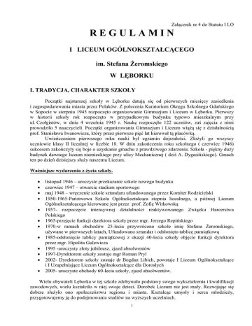 Załącznik nr 4 do Statutu I LO REGULAMIN I LICEUM OGÓLNOKSZTAŁCĄCEGO im. Stefana Żeromskiego W LĘBORKU I. TRADYCJA, CHARAKTER SZKOŁY Początki najstarszej szkoły w Lęborku datują się od pierwszych miesięcy zasiedlenia i zagospodarowania miasta przez Polaków. Z polecenia Kuratorium Okręgu Szkolnego Gdańskiego w Sopocie w sierpniu 1945 rozpoczęto organizowanie Gimnazjum i Liceum w Lęborku. Pierwszy w historii szkoły rok rozpoczęto w przypadkowym budynku typowo mieszkalnym przy ul. Czołgistów, w dniu 4 września 1945 r. Naukę rozpoczęło 122 uczniów, zaś zajęcia z nimi prowadziło 5 nauczycieli. Początki organizowania Gimnazjum i Liceum wiążą się z działalnością prof. Stanisława Iwanowicza, który przez pierwsze pięć lat kierował tą placówką. Uwieńczeniem pierwszego roku nauki był egzamin dojrzałości. Złożyli go wszyscy uczniowie klasy II licealnej w liczbie 18. W dniu zakończenia roku szkolnego ( czerwiec 1946) sukcesem zakończyły się boje o uzyskanie gmachu z prawdziwego zdarzenia. Szkoła - piękny duży budynek dawnego liceum niemieckiego przy ulicy Mechanicznej ( dziś A. Dygasińskiego). Gmach ten po dzień dzisiejszy służy naszemu Liceum. Ważniejsze wydarzenia z życia szkoły. listopad 1946 – uroczyste przekazanie szkole nowego budynku czerwiec 1947 – otwarcie stadium sportowego maj 1948 – wręczenie szkole sztandaru ufundowanego przez Komitet Rodzicielski 1950-1965-Państwowa Szkoła Ogólnokształcąca stopnia licealnego, a później Liceum Ogólnokształcącego kierowane jest przez prof. Zofię Witkowską 1957- rozpoczęcie intensywnej działalności reaktywowanego Związku Harcerstwa Polskiego 1965-przejęcie funkcji dyrektora szkoły przez mgr. Jerzego Repińskiego 1970-w ramach obchodów 25-lecia przywrócono szkole imię Stefana Żeromskiego, używane w pierwszych latach, Ufundowano sztandar i odsłonięto tablicę pamiątkową 1985-odsłonięcie tablicy pamiątkowej z okazji 40-lecia szkoły objęcie funkcji dyrektora przez mgr. Hipolita Gulewicza 1995 -uroczysty złoty jubileusz, zjazd absolwentów 1997-Dyrektorem szkoły zostaje mgr Roman Pryl 2002- Dyrektorem szkoły zostaje dr Bogdan Libich, powstaje I Liceum Ogólnokształcące i I Uzupełniające Liceum Ogólnokształcące dla Dorosłych 2005- uroczyste obchody 60-lecia szkoły, zjazd absolwentów. Wielu obywateli Lęborka w tej szkole zdobywało podstawy swego wykształcenia i kwalifikacji zawodowych, wielu kształciło w niej swoje dzieci. Dorobek Liceum nie jest mały. Rozwijając się dobrze służyło ono społeczeństwu regionu i miasta. Kształcąc umysły i serca młodzieży, przygotowujemy ją do podejmowania studiów na wyższych uczelniach. 1 II. PODSTAWOWE ZADANIA UCZNIA Głównym zadaniem ucznia uczęszczającego do I Liceum jest przygotowanie się do życia, do roli świadomego i twórczego obywatela Rzeczypospolitej Polskiej. Do podstawowych zadań należą: 1. Opanowanie zasobu wiedzy i umiejętności określonych programem nauczania oraz przygotowanie się do studiów wyższych. 2. Doskonalenie właściwości charakteru, wyrabianie nawyków i dobrych przyzwyczajeń oraz sposobów postępowania cechujących kulturalnego i wykształconego człowieka, umiejącego dobrze pracować i aktywnie uczestniczącego w życiu społecznym. 3. Wszechstronne rozwijanie uzdolnień i umiejętności, by twórczo wykorzystać dorobek kulturowy ludzkości. 4. Rozwijanie kultury fizycznej, nabywanie nawyków higienicznych zapewniających odporność na choroby, dobry stan zdrowia i sprawność fizyczną. III. PRZEPISY DOTYCZĄCE ORGANIZACJI ŻYCIA W SZKOLE 1. Sprawy porządkowe i organizacyjne a) zajęcia w szkole odbywają się zgodnie z planem godzin zatwierdzanym przez Radę Pedagogiczną, zajęcia rozpoczynają się o godzinie 8.00 i trwają do 15.15 W wyjątkowych przypadkach godziny te mogą się zmieniać, decyzję w tej sprawie podejmuje Rada Pedagogiczna. Rada zatwierdza także plan zajęć pozalekcyjnych (jeżeli takowe się odbywają), b) każdego ucznia obowiązuje punktualne przybywanie na zajęcia, wzorowa frekwencja i usprawiedliwianie każdej nieobecności zgodnie z ustaleniami RP, wychowawcy i z obowiązującymi przepisami. 2. W szkole nie obowiązuje jednolity strój szkolny, codzienny ubiór szkolny ucznia powinien być schludny, stosowny i niewyzywający. Niedozwolone jest noszenie odzieży oraz akcesoriów z wulgarnymi hasłami, emblematami propagującymi środki odurzające, przemoc, nietolerancję lub potępione ideologie. 3. Każdego ucznia obowiązuje noszenie na terenie szkoły identyfikatora. Identyfikator powinien być umieszczony w widocznym miejscu na wysokości klatki piersiowej. 4. Obowiązkowym szkolnym strojem odświętnym dla uczniów noszonym podczas uroczystości szkolnych jest: a) dla dziewcząt - biała bluzka i granatowa (ewentualnie czarna) spódnica lub spodnie b) dla chłopców - biała koszula, krawat i ciemne ubranie lub ciemne spodnie i marynarka 5. Uczniowie zobowiązani są do zakładania odświętnego stroju szkolnego w następujących dniach (ew. w dniach, w których święta te są obchodzone na terenie szkoły): uroczyste rozpoczęcie roku szkolnego, Dzień Edukacji Narodowej, Święto Szkoły, Święto Niepodległości Polski, Święto 3 Maja, pożegnanie klas trzecich, matura próbna i egzamin maturalny - obowiązuje maturzystów, uroczyste zakończenie roku szkolnego, inne wcześniej zapowiedziane w zarządzeniu Dyrektora Szkoły wydarzenia mające miejsce na terenie szkoły, których charakter wymaga stroju odświętnego. 6. Na lekcjach wychowania fizycznego obowiązuje strój ustalony przez nauczyciela prowadzącego zajęcia. 7. Zasady organizacji i działalności Samorządu Uczniowskiego. Samorząd Uczniowski reprezentuje interesy młodzieży i jest łącznikiem pomiędzy Radą Pedagogiczną a młodzieżą. Tryb powoływania, struktura organizacyjna oraz zakres działalności określają przepisy regulaminu