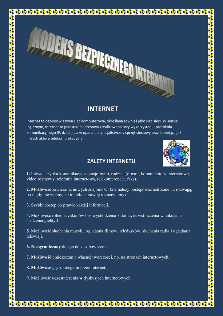 INTERNET Internet to ogólnoświatowa sieć komputerowa, określana również jako sieć sieci. W sensie logicznym, Internet to przestrzeń adresowa zrealizowana przy wykorzystaniu protokołu komunikacyjnego IP, działająca w oparciu o specjalistyczny sprzęt sieciowy oraz istniejącą już infrastrukturę telekomunikacyjną ZALETY INTERNETU 1. Łatwa i szybka komunikacja ze znajomymi, rodziną (e-mail, komunikatory internetowe, video rozmowy, telefonia internetowa, telekonferencje, faks). 2. Możliwość zawierania nowych znajomości (ale należy postępować ostrożnie i z rozwagą, bo nigdy nie wiemy, z kim tak naprawdę rozmawiamy). 3. Szybki dostęp do prawie każdej informacji. 4. Możliwość robienia zakupów bez wychodzenia z domu, uczestniczenia w aukcjach, śledzenia giełdy.1 5. Możliwość słuchania muzyki, oglądania filmów, teledysków, słuchania radia i oglądania telewizji. 6. Nieograniczony dostęp do zasobów sieci. 7. Możliwość umieszczania własnej twórczości, np. na stronach internetowych. 8. Możliwość gry z kolegami przez Internet. 9. Możliwość uczestniczenia w dyskusjach internetowych. ZAGROŻENIA INTERNETU Nie da się ukryć, że korzystanie z Internetu jest w dzisiejszych czasach koniecznością. Internet jest największym medium informacyjnym. Przez Internet można się uczyć, podróżować, poznawać nowych ludzi. Niestety, wielu użytkowników Internetu nie zdaje sobie sprawy z tego, jak bardzo trzeba być ostrożnym w korzystaniu z tego dobrodziejstwa techniki. W Internecie czyhają na nas nie tylko takie niebezpieczeństwa jak wirusy i hakerzy, ale przede wszystkim zagrożenia głębsze, socjologiczne i psychologiczne. Oczywiście, nie jest powiedziane, że każdy kto korzysta z Internetu musi wpaść w jakąś pułapkę. Świadomość zagrożenia i odpowiedzialne zachowanie często minimalizuje ryzyko. Jednak trzeba pamiętać o wielu aspektach i być przygotowanym na stawienie czoła wielu zagrożeniom. JAK BEZPIECZNIE KORZYSTAC Z INTERNETU 1. Pamiętajcie, aby oprogramowanie, które instalujecie chroniło was w trakcie serfowania w sieci oraz podczas pobierania plików. 2. Pilnujcie tego aby oprogramowanie, które ma chronić wasz komputer było na bieżąco aktualizowane i zawsze włączone 3. Program zabezpieczający komputer powinien chronić również pocztę elektroniczną oraz wszystkie aplikacje dla użytkowników indywidualnych, ponadto musi informować w czasie rzeczywistym o zagrożeniach związanych z ruchem przychodzącym i wychodzącym. 4. Trzeba pamiętać, aby korzystać z najnowszych wersji przeglądarek internetowych. 5. Należy korzystać z przeglądarki posiadającej wtyczkę blokującą skrypty. 6. Jeżeli wasz system operacyjny to Microsoft Windows, istotne jest abyście włączyli funkcję automatycznych aktualizacji oraz instalowali wszystkie aktualizacje zaraz po ich udostępnieniu przez firmę Microsoft. 7. Pomocna jest również instalacja różnego rodzaju zapór i programów wykrywających włamania oraz chroniących przed programami szpiegującymi. Należy pamiętać o regularnym aktualizowaniu takich programów.