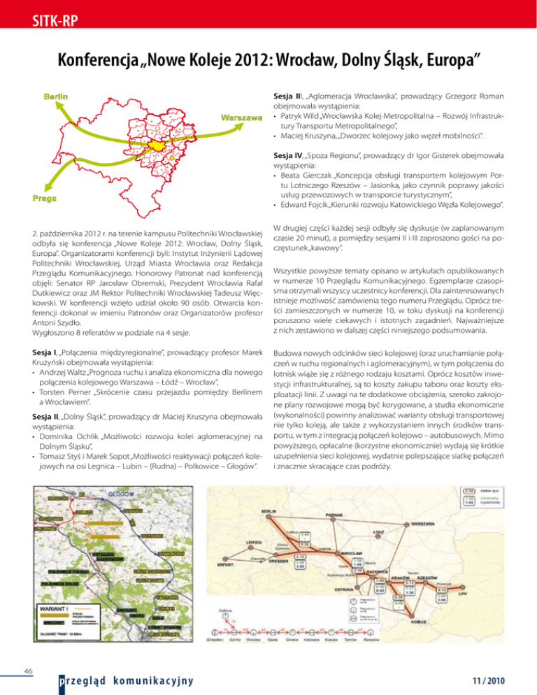 SITK-RP Konferencja „Nowe Koleje 2012: Wrocław, Dolny Śląsk, Europa” Sesja III, „Aglomeracja Wrocławska”, prowadzący Grzegorz Roman obejmowała wystąpienia: • Patryk Wild „Wrocławska Kolej Metropolitalna – Rozwój Infrastruktury Transportu Metropolitalnego”, • Maciej Kruszyna, „Dworzec kolejowy jako węzeł mobilności”. Sesja IV, „Spoza Regionu”, prowadzący dr Igor Gisterek obejmowała wystąpienia: • Beata Gierczak „Koncepcja obsługi transportem kolejowym Portu Lotniczego Rzeszów – Jasionka, jako czynnik poprawy jakości usług przewozowych w transporcie turystycznym”, • Edward Fojcik „Kierunki rozwoju Katowickiego Węzła Kolejowego”. 2. października 2012 r. na terenie kampusu Politechniki Wrocławskiej odbyła się konferencja „Nowe Koleje 2012: Wrocław, Dolny Śląsk, Europa”. Organizatorami konferencji byli: Instytut Inżynierii Lądowej Politechniki Wrocławskiej, Urząd Miasta Wrocławia oraz Redakcja Przeglądu Komunikacyjnego. Honorowy Patronat nad konferencją objęli: Senator RP Jarosław Obremski, Prezydent Wrocławia Rafał Dutkiewicz oraz JM Rektor Politechniki Wrocławskiej Tadeusz Więckowski. W konferencji wzięło udział około 90 osób. Otwarcia konferencji dokonał w imieniu Patronów oraz Organizatorów profesor Antoni Szydło. Wygłoszono 8 referatów w podziale na 4 sesje. Sesja I, „Połączenia międzyregionalne”, prowadzący profesor Marek Krużyński obejmowała wystąpienia: • Andrzej Waltz „Prognoza ruchu i analiza ekonomiczna dla nowego połączenia kolejowego Warszawa – Łódź – Wrocław”, • Torsten Perner „Skrócenie czasu przejazdu pomiędzy Berlinem a Wrocławiem”. Sesja II, „Dolny Śląsk”, prowadzący dr Maciej Kruszyna obejmowała wystąpienia: • Dominika Ochlik „Możliwości rozwoju kolei aglomeracyjnej na Dolnym Śląsku”, • Tomasz Styś i Marek Sopot „Możliwości reaktywacji połączeń kolejowych na osi Legnica – Lubin – (Rudna) – Polkowice – Głogów”. 46 p r ze g l ą d komunik ac yjny W drugiej części każdej sesji odbyły się dyskusje (w zaplanowanym czasie 20 minut), a pomiędzy sesjami II i III zaproszono gości na poczęstunek „kawowy”. Wszystkie powyższe tematy opisano w artykułach opublikowanych w numerze 10 Przeglądu Komunikacyjnego. Egzemplarze czasopisma otrzymali wszyscy uczestnicy konferencji. Dla zainteresowanych istnieje możliwość zamówienia tego numeru Przeglądu. Oprócz treści zamieszczonych w numerze 10, w toku dyskusji na konferencji poruszono wiele ciekawych i istotnych zagadnień. Najważniejsze z nich zestawiono w dalszej części niniejszego podsumowania. Budowa nowych odcinków sieci kolejowej (oraz uruchamianie połączeń w ruchu regionalnych i aglomeracyjnym), w tym połączenia do lotnisk wiąże się z różnego rodzaju kosztami. Oprócz kosztów inwestycji infrastrukturalnej, są to koszty zakupu taboru oraz koszty eksploatacji linii. Z uwagi na te dodatkowe obciążenia, szeroko zakrojone plany rozwojowe mogą być korygowane, a studia ekonomiczne (wykonalności) powinny analizować warianty obsługi transportowej nie tylko koleją, ale także z wykorzystaniem innych środków transportu, w tym z integracją połączeń kolejowo – autobusowych. Mimo powyższego, opłacalne (korzystne ekonomicznie) wydają się krótkie uzupełnienia sieci kolejowej, wydatnie polepszające siatkę połączeń i znacznie skracające czas podróży. 11 / 2010 SITK-RP nowania rozwoju infrastruktury szynowej wychodzi od planowania „rozkładu jazdy” i określeniu na jego podstawie „wąskich gardeł” i koniecznych modernizacji lub inwestycji. Znamienne są przykłady Szwajcarii, gdzie takie „nowoczesne” podejście stosowane jest od lat (obecnie układa się rozkład jazdy na rok 2040). Drogą tą idą Czesi i Niemcy. Podejmowane są próby „importu” tych idei na teren Polski. Przyrost liczby pojazdów (także w odniesieniu do liczby mieszkańców, jako wskaźnik motoryzacji) notowany w Polsce oznacza przybliżanie się tych wskaźników do wartości notowanych w starych krajach UE. Wysokie wartości wskaźnika motoryzacji są jednak cechą obszarów wiejskich. Duże, europejskie miasta o sprawnym systemie transportu zbiorowego wykazują wartości wskaźnika motoryzacji znacznie niższe od średniej europejskiej, a także niższe niż w polskich miastach. Zauważyć można korelację: im sprawniejszy transport zbiorowy, tym niższy wskaźnik motoryzacji. I odwrotnie. Znamienne jest, że Wrocław posiada wyższy wskaźnik motoryzacji od Warszawy, Kopenhagi, Berlina... Odniesienia do wskaźnika motoryzacji, a także uznawanie go za miernik jakości systemu transportu powinno być zatem zrewidowane. „Tradycyjne” przystępuje się do planowania i organizacji przewozów (tu w zasadzie: pasażerskich) uwzględniając istniejącą lub przekształcaną sieć transportową. Na etapie inwestycji w infrastrukturę kolejową lub tramwajową rzadko analizuje się przyszłą siatkę połączeń (częstotliwości, rozkłady jazdy). Tymczasem konieczność „taktowania” połączeń (uruchamiania ich w regularnych odstępach) oraz koordynacja w węzłach bardzo silnie powiązane są z lokalizacją i przepustowością poszczególnych odcinków oraz węzłów. Sieć o określonych parametrach często uniemożliwia prowadzenie pożądanych linii w optymalnych odstępach czasu. „Nowoczesne” podejście do pla- 11 / 2010 Konsekwencją powyższego podejścia jest na przykład konieczność lokalizacji stacji i przystanków w miejscach wynikających z logiki połączeń, budowa dodatkowych torów, mijanek i rozjazdów. Zwrócono także uwagę na znaczenie „symetrii” w sieci połączeń. Widać to na przykładzie Wrocławskiego Węzła Kolejowego, historycznie ukształtowanego z przewagą tras docierających do stacji Wrocław Główny od strony zachodniej. System kolei aglomeracyjnej kształtowany według logiki „