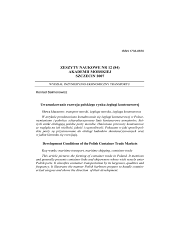 ISSN 1733-8670 ZESZYTY NAUKOWE NR 12 (84) AKADEMII MORSKIEJ SZCZECIN 2007 WYDZIAŁ INŻYNIERYJNO-EKONOMICZNY TRANSPORTU Konrad Salmonowicz Uwarunkowanie rozwoju polskiego rynku żeglugi kontenerowej Słowa kluczowe: transport morski, żegluga morska, żegluga kontenerowa W artykule przedstawiono kształtowanie się żeglugi kontenerowej w Polsce, wymieniono i pokrótce scharakteryzowano linie kontenerowe armatorów, których statki obsługują polskie porty morskie. Omówiono przewozy kontenerowe ze względu na ich wielkość, jakość i częstotliwość. Pokazano w jaki sposób polskie porty są przystosowane do obsługi ładunków skonteneryzowanych oraz w jakim kierunku się rozwijają. Development Conditions of the Polish Container Trade Markets Key words: maritime transport, maritime shipping, container trade This article pictures the forming of container trade in Poland. It mentions and generally presents container links and shipowners whose wich vessels enter Polish ports. It classifies container transportation by its largeness, qualities and frequency. It illustrates the manner Polish harbours prepare to handle containerized cargoes and shows the direction of their development. Konrad Salmonowicz Wprowadzenie Żegluga liniowa jako forma eksploatacji transportu morskiego wyłoniła się z żeglugi trampowej w początkach XIX wieku. Jej istotą jest obsługa stałych połączeń żeglugowych między ustalonymi portami morskimi, regularnie według określonej częstotliwości przewozów. Początkowo największe znaczenie miały przewozy pasażerskie, potem pojawiła się wysokowartościowa drobnica przemysłowa i rozwój napędu parowego, ułatwiający terminowe dostawy ładunków. Żegluga ta stała się dominująca na przełomie XIX i XX, ale straciła na znaczeniu w drugiej połowie XX wieku. Już w tym okresie, na skutek zmian form transportu ładunków drobnicowych, przeobrażeniom uległy także technika, technologia oraz formy organizacyjne przewozów liniowych. W rezultacie obok konwencjonalnej żeglugi liniowej, obsługującej głównie ładunki drobnicowe konwencjonalne w relacji portto-port, mamy współcześnie różne formy specyficznej żeglugi regularnej, w tym żeglugę kontenerową. Żegluga kontenerowa, obsługując przewozy wielkich jednostek ładunkowych (kontenery, barki, ładunki toczne) staje się częścią lądowo-morskiego łańcucha transportowego, dzięki temu pozwala tworzyć jednolity, międzygałęziowy lub wielogałęziowy (multimodalny) system transportowy. W ramach tej żeglugi występują trzy jej podstawowe gałęzie: żegluga kontenerowa właściwa, żegluga promowa i barkowa. Uzupełnia ją żegluga uprawiana za pomocą całej gamy typów statków kombinowanych, łączących różne metody przewozu, np. statków con-ro, con-bulk, barge-container itp. 1. Linie kontenerowe do/z polskich portów morskich Statki obcych armatorów kontenerowych rzadko zawijają do portów morskich w Polsce. Znacznie zmniejsza to atrakcyjność tej technologii w obsłudze ładunków polskiego handlu zagranicznego i ładunków tranzytowych. Obecnie największymi zaoceanicznymi rynkami morskimi Polski są USA i Kanada. Przewozy pomiędzy tymi krajami rozpoczęły się już w 1987 roku. Firmą, która je między innymi obsługuje jest intermodalny operator kontenerowy – ICE Transport Co. Inc, z siedzibą w Edison w USA. Firma ma główne biuro w Gdyni i oddział w Warszawie. Jest to jeden z największych operatorów intermodalnych obsługujących relację Polska – Ameryka Północna. Firma ta nie posiada statków, ale jest organizatorem całego łańcucha transportowego pomiędzy załadowcą i odbiorcą. Wystawia ona konosament i jest odpowiedzialna za cały przewóz w transporcie intermodalnym. ICE Transport odniosła sukces, ponieważ jako jedna z pierwszych na polskim rynku zdobyła dostateczne infor174 Uwarunkowanie rozwoju polskiego rynku żeglugi kontenerowej macje na temat wymagań rynków w USA i Kanadzie, wprowadziła formułę jednego dokumentu dla wszystkich etapów transportu, cały pakiet usług dodatkowych, dodatkowe usługi celne i ubezpieczeniowe. Wszystkie te elementy okazały się nieocenione w pierwszych latach po transformacji ustrojowej w Polsce i po demonopolizacji polskiego handlu zagranicznego. Firmy tego typu osiągają swój sukces i pozycję poprzez znalezienie rynkowej niszy i jej właściwe zagospodarowanie. ICE Transport obsługuje właśnie taką niszę, uwzględniając szczególnie jakość usług – przy rozsądnych cenach. Jakość to przede wszystkim dostosowanie się do potrzeb każdego klienta takiej usługi. Poza tym ICE Transport oferuje pełną obsługę celną w Stanach Zjednoczonych, łącznie z wykładaniem cła oraz przewozami kontenerów ciężkich, wymagających specjalnych zezwoleń. Port morski w Gdyni największą częstotliwość połączeń kontenerowych z rynkami zamorskimi oferuje w relacjach skandynawskich (głównie do Szwecji). Port morski w Gdańsku oferuje serwisy kontenerowe do portów rejonu Morza Bałtyckiego i Północnego, a w szczególności: – Orient Overseas Container Lines (OOCL) – połączenia z portami – Hamina, Helsinki, Sankt Petersburg, Kłajpeda, Tallin, Antwerpia, Rotterdam, Hamburg; – Linia publiczna Inter Marine Container Lines – obsługuje kontenery innych armatorów oceanicznych; ich trasa przebiega przez porty w: Gdańsku – Hamburgu oraz Bremenhaven; – Linie kontenerowe Containerships Oy – połączenia z Gdańska na trasie Sankt Petersburg – Helsinki; – Linia kontenerowa Kursiu Linija – funkcjonuje od kwietnia 2004 r.; linię obsługują statki litewskiego armatora, które kursują między Gdańskiem a Wielką Brytanią; statki zawijają do portów: Gdańsk, Kłajpeda, Ipswitch, Rotterdam, Tesport; litewski armator oferuje szybki tranzyt z Gdańska do Wielkiej Brytanii i z powrotem; – Linia kontenerowa Delphis N.V. – działa od maja 2004 r.; jest to linia belgijs