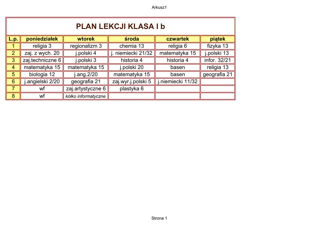 Arkusz1 PLAN LEKCJI KLASA I b L.p. poniedziałek wtorek 1 religia 3 regionalizm 3 2 zaj. z wych. 20 j.polski 4 3 zaj.techniczne 6 j.polski 3 4 matematyka 15 matematyka 15 5 biologia 12 j.ang.2/20 6 j.angielski 2/20 geografia 21 7 wf zaj.artystyczne 6 8 wf kółko informatyczne środa chemia 13 j. niemiecki 21/32 historia 4 j.polski 20 matematyka 15 zaj.wyr.j.polski 5 plastyka 6 czwartek religia 6 matematyka 15 historia 4 basen basen j.niemiecki 11/32 Strona 1 piątek fizyka 13 j.polski 13 infor. 32/21 religia 13 geografia 21