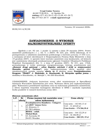 Urząd Gminy Turawa 46-045 TURAWA, ul. Opolska 39c telefony: 077/ 421-20-12, 421-21-09, 421-20-72 fax: 077/421-20-73 e-mail: [email protected] Turawa, 04 wrzesień 2008r. BUIII/341-6/W/08 ZAWIADOMIENIE O WYBORZE NAJKORZYSTNIEJSZEJ OFERTY Zgodnie z art. 92 ust. 1 punkt 1) ustawy z dnia 29 stycznia 2004r. Prawo zamówień publicznych ( t. j. Dz. U. z 2007r. Nr 223, poz. 1655) informuję, że w postępowaniu o udzielenie zamówienia publicznego o wartości powyżej 14 000 euro, a mniejszej od kwot określonych w Rozporządzeniu Prezesa Rady Ministrów z dnia 19 grudnia 2007r. w sprawie kwot wartości zamówień oraz konkursów, od których jest uzależniony obowiązek przekazywania ogłoszeń Urzędowi Oficjalnych Publikacji Wspólnot Europejskich (Dz. U. z dnia 27 grudnia 2007r. Nr 241, poz. 1762), prowadzonego w trybie przetargu nieograniczonego, którego przedmiotem jest „Remont drogi gminnej – ulica Kępska odcinek I (A-B) w miejscowości Zawada, gmina Turawa”, jako najkorzystniejszą ofertę spośród ofert nieodrzuconych została uznana oferta nr 3 złożona przez Przedsiębiorstwo Drogowe "TRAKT" J. Żłobiński, A. Stachurski, K. Biczysko spółka jawna z siedzibą w Kluczborku, ul. Matejki 1, 46-200 Kluczbork. UZASADNIENIE: Jedynym kryterium oceny ofert wymienionym w Specyfikacji Istotnych Warunków Zamówienia jest cena. Wybrana oferta jest najkorzystniejsza, gdyż Wykonawca przedstawił najniższa cenę na wykonanie przedmiotu zamówienia, a oferta wypełnia wszystkie wymagania określone w SIWZ i uzyskała najwyższą liczbę punktów w ramach kryterium oceny ofert. Zbiorcze zestawienie ofert L.P. 1. 2. Nr Firma (nazwa) lub nazwisko oraz oferty adres wykonawcy Przedsiębiorstwo Handlowo - Usługowe „LARIX” Janusz Sowa 1. Ul. Klonowa 11 42-700 Lubliniec BISEK – asfalt. Michał Bisek 2. Ul. Żywiecka 30 54-031 Wrocław Cena oferty Cena netto – 142 841,13 zł VAT – 31 425,05 zł Cena brutto – 174 266,18 zł Cena netto – 164 122,29 zł VAT – 36 106,90 zł Cena brutto – 200 229, 19 zł Remont drogi gminnej – ulica Kępska odcinek I (A-B) w miejscowości Zawada, gmina Turawa Strona 1 z 4 Zawiadomienie o najkorzystniejszej ofercie BUIII/341-6/W/08 3. 3. 4. 4. 5. 5. 6. 6. 7. 7. Przedsiębiorstwo Drogowe „TRAKT” J. Żłobiński, A. Stachurski, K. Biczysko Spółka jawna Ul. Matejki 1 46-200 Kluczbork Strzeleckie Przedsiębiorstwo Robót Drogowych Sp. z o.o. Ul. 1- go Maja 57 47-100 Strzelce Opolskie Przedsiębiorstwo Robót Drogowo Mostowych Sp. z o.o. w Opolu Opole, ul. Krzanowicka 2 46-020 Czarnowąsy Opolskie Przedsiębiorstwo Usług Drogowych Sp. z o.o. Aleja Przyjaźni 9 45-573 Opole Przedsiębiorstwo Wielobranżowe BUDIM 2 Ul. Siedmiu Źródeł 6 46-300 Olesno Cena netto – 137 891,50 zł VAT 30 336,13 zł Cena brutto – 168 227,63 zł Cenna netto – 164 393,17 zł VAT – 36 166, 50 zł Cenna brutto – 200 559, 67 zł Cenna netto – 166 020,63 zł VAT – 36 524,54 zł Cenna brutto – 202 545,17 zł Cenna netto – 154 430, 26 zł VAT – 33 974, 66 zł Cenna brutto – 188 404, 92 zł Cenna netto – 185 348,42 zł VAT – 40 776,65 zł Cenna brutto – 226 125,07 zł Streszczenie oceny i porównania złożonych ofert Nr Firma (nazwa) lub nazwisko oraz adres Liczba punktów Łączna oferty wykonawcy w kryterium - punktacja Wzór: cena Cn /Cbx100 =ilość punktów 1. 2. 3. 4. 5. Przedsiębiorstwo Handlowo - Usługowe „LARIX” Janusz Sowa Ul. Klonowa 11 42-700 Lubliniec BISEK – asfalt. Michał Bisek Ul. Żywiecka 30 54-031 Wrocław Przedsiębiorstwo Drogowe „TRAKT” J. Żłobiński, A. Stachurski, K. Biczysko Spółka jawna Ul. Matejki 1 46-200 Kluczbork Strzeleckie Przedsiębiorstwo Robót Drogowych Sp. z o.o. Ul. 1- go Maja 57 47-100 Strzelce Opolskie Przedsiębiorstwo Robót Drogowo -Mostowych Sp. z o.o. w Opolu Opole, ul. Krzanowicka 2 46-020 Czarnowąsy 96,53 96,53 84,02 84,02 100,00 100,00 83,88 83,88 89,29 89,29 Remont drogi gminnej – ulica Kępska odcinek I (A-B) w miejscowości Zawada, gmina Turawa Strona 2 z 4 Zawiadomienie o najkorzystniejszej ofercie BUIII/341-6/W/08 6. Opolskie Przedsiębiorstwo Usług Drogowych Sp. z o.o. Aleja Przyjaźni 9 45-573 Opole 74,40 74,40 Oferty wypełniają wszystkie wymagania określone w SIWZ. Zgodnie z punktem XV Specyfikacji Istotnych Warunków Zamówienia wykonawca wyłoniony w niniejszym przetargu zobowiązany jest przed podpisaniem umowy wnieść zabezpieczenie należytego Wykonania umowy w wysokości 10 % ceny ofertowej brutto. Planowany termin podpisania umowy z Wykonawcą niniejszym przetargu ustala się na dzień 15 września 2008r. wyłonionym w Ponadto zgodnie z art. 92 ust. 1 punkt 2) ustawy Prawo zamówień publicznych zawiadamiam, że na podstawie art. 89 ust. 1 punkt 2 wyżej wymienionej ustawy Zamawiający odrzuca ofertę nr 7 złożoną przez Przedsiębiorstwo Wielobranżowe BUDIM 2 z siedzibą w Oleśnie, ul. Siedmiu Źródeł 6, 46-300 Olesno. Przedmiotowa oferta została odrzucona z postępowania w związku z faktem, że Wykonawca nie dołączył do oferty, wymaganego w Specyfikacji Istotnych Warunków Zamówienia punkt VI.1.4), oświadczenia złożonego przez kierownika budowy, że będzie pełnił obowiązki kierownika budowy. W związku z powyższym zgodnie z art. 89 ust. 1. punkt 2) ustawy Prawo zamówień publicznych treść oferty nie odpowiada treści Specyfikacji Istotnych Warunków Zamówienia i podlega odrzuceniu. Uzasadnienie odrzucenia oferty W punkcie VI. podpunkt 1. Specyfikacji Istotnych Warunków Zamówienia, Zamawiający dokładnie określił dokumenty wymagane, które Wykonawcy mieli dołączyć do oferty. W punkcie 4. dokumentów wymaganych Zamawiający zażądał złożenia z ofertą oświadczenia kierownika budowy, że będzie pełnił funkcję kierownika budowy. Mając powyższe na uwadze Zamawiający informuję, że treść złożonej oferty nr 7 nie odpowiada treści Specyfikacji Istotnych Warunków Zamówienia i zgodnie z art. 89 ust. 1. punkt 2) po