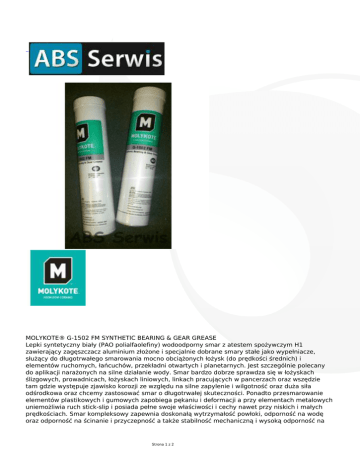MOLYKOTE® G-1502 FM SYNTHETIC BEARING & GEAR GREASE Lepki syntetyczny biały (PAO polialfaolefiny) wodoodporny smar z atestem spożywczym H1 zawierający zagęszczacz aluminium złożone i specjalnie dobrane smary stałe jako wypełniacze, służący do długotrwałego smarowania mocno obciążonych łożysk (do prędkości średnich) i elementów ruchomych, łańcuchów, przekładni otwartych i planetarnych. Jest szczególnie polecany do aplikacji narażonych na silne działanie wody. Smar bardzo dobrze sprawdza się w łożyskach ślizgowych, prowadnicach, łożyskach liniowych, linkach pracujących w pancerzach oraz wszędzie tam gdzie występuje zjawisko korozji ze względu na silne zapylenie i wilgotność oraz duża siła odśrodkowa oraz chcemy zastosować smar o długotrwałej skuteczności. Ponadto przesmarowanie elementów plastikowych i gumowych zapobiega pękaniu i deformacji a przy elementach metalowych uniemożliwia ruch stick-slip i posiada pełne swoje właściwości i cechy nawet przy niskich i małych prędkościach. Smar kompleksowy zapewnia doskonałą wytrzymałość powłoki, odporność na wodę oraz odporność na ścinanie i przyczepność a także stabilność mechaniczną i wysoką odporność na Strona 1 z 2 utlenianie. Ze względu na swoje właściwości smar DC G-1502 zwany jest również jako smar na deszcz. Jego autorzy zaplanowali go do pracy na mokro i zarówno do łożysk pracujących w samochodach, przyczepach oraz aplikacjach narażonych na wodę, błoto śnieg lub lód (quady, skutery śnieżne). Molykote G1502 wywodzi swą znakomitą wydajność i efektywność przy pracy w mokrych warunkach z niespotykanej spoistości i przyczepności do powierzchni. Ponadto należy dodać ,że nakładać go można na już mokre powierzchnie i jego skład zapewnia ochronę podczas długotrwałej pracy w wodnym środowisku nawet przy występowaniu zjawiska działania wody pod ciśnieniem. Pomimo, że istnieje na rynku krótko zdobył sobie wiele uznania u producentów napojów i żywności i to zarówno do smarowania łożysk jak i również łańcuchów, krzywek, przekładni otwartych, zębatek gdzie dostaje się woda lub mgła wodna i istnieje niebezpieczeństwo wypłukania smaru przez wodę. Pełny opis produktu Molykote G-1502 FM w formacie .PDF Więcej informacji na naszej stronie produktu Strona 2 z 2