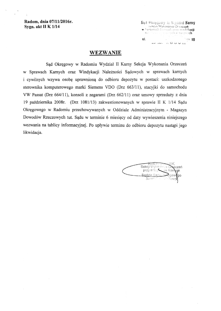 Radom, dnia 07/1 l/2016r. g ąrt in^^y a fc^wl Harny Sygn. akt II K 1/14 --c -* 10 ul. i-.WVŁi- . V Cl >^ W ij.4 WEZWANIE Sąd Okręgowy w Radomiu Wydział II Karny Sekcja Wykonania Orzeczeń w Sprawach Karnych oraz Windykacji Należności Sądowych w sprawach karnych i cywilnych wzywa osobę uprawnioną do odbioru depozytu w postaci: uszkodzonego sterownika komputerowego marki Siemens VDO (Drz 663/11), stacyjki do samochodu VW Passat (Drz 664/11), konsoli z zegarami (Drz 662/11) oraz umowy sprzedaży z dnia 19 października 2008r. (Drz 1081/13) zakwestionowanych w sprawie II K 1/14 Sądu Okręgowego w Radomiu przechowywanych w Oddziale Administracyjnym - Magazyn Dowodów Rzeczowych tut. Sądu w terminie 6 miesięcy od daty wywieszenia niniejszego wezwania na tablicy informacyjnej. Po upływie terminu do odbioru depozytu nastąpi jego likwidacja.
