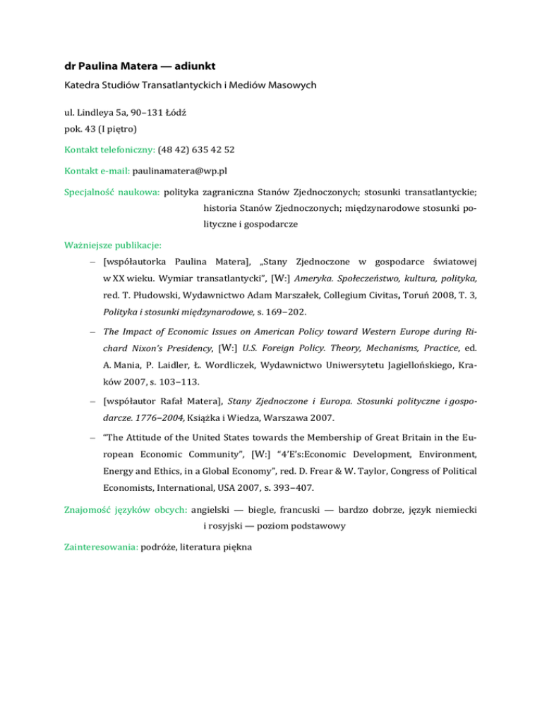 dr Paulina Matera — adiunkt Katedra Studiów Transatlantyckich i Mediów Masowych ul. Lindleya 5a, 90–131 Łódź pok. 43 (I piętro) Kontakt telefoniczny: (48 42) 635 42 52 Kontakt e-mail: [email protected] Specjalność naukowa: polityka zagraniczna Stanów Zjednoczonych; stosunki transatlantyckie; historia Stanów Zjednoczonych; międzynarodowe stosunki po- Ważniejsze publikacje: lityczne i gospodarcze – [współautorka Paulina Matera], „Stany Zjednoczone w gospodarce światowej w XX wieku. Wymiar transatlantycki”, [W:] Ameryka. Społeczeństwo, kultura, polityka, red. T. Płudowski, Wydawnictwo Adam Marszałek, Collegium Civitas, Toruń 2008, T. 3, Polityka i stosunki międzynarodowe, s. 169–202. – The Impact of Economic Issues on American Policy toward Western Europe during Richard Nixon’s Presidency, [W:] U.S. Foreign Policy. Theory, Mechanisms, Practice, ed. A. Mania, P. Laidler, Ł. Wordliczek, Wydawnictwo Uniwersytetu Jagiellońskiego, Kra- ków 2007, s. 103–113. – [współautor Rafał Matera], Stany Zjednoczone i Europa. Stosunki polityczne i gospodarcze. 1776–2004, Książka i Wiedza, Warszawa 2007. – “The Attitude of the United States towards the Membership of Great Britain in the Eu- ropean Economic Community”, [W:] “4’E’s:Economic Development, Environment, Energy and Ethics, in a Global Economy”, red. D. Frear & W. Taylor, Congress of Political Economists, International, USA 2007, s. 393–407. Znajomość języków obcych: angielski — biegle, francuski — bardzo dobrze, język niemiecki i rosyjski — poziom podstawowy Zainteresowania: podróże, literatura piękna