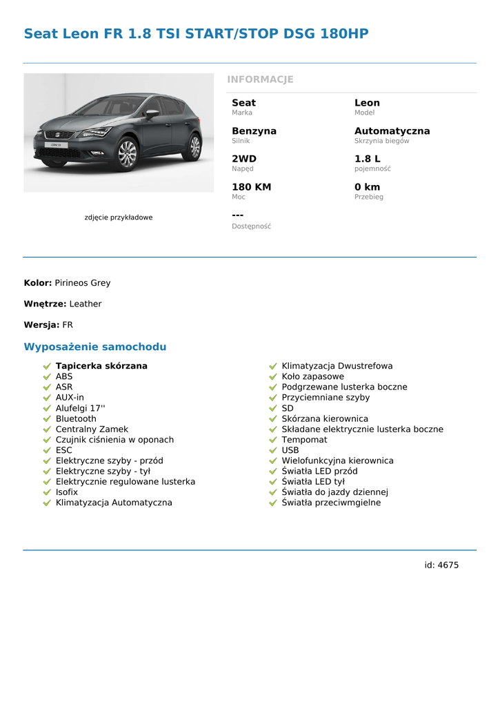 Seat Leon FR 1.8 TSI START/STOP DSG 180HP INFORMACJE zdjęcie przykładowe Seat Leon Marka Model Benzyna Automatyczna Silnik Skrzynia biegów 2WD 1.8 L Napęd pojemność 180 KM 0 km Moc Przebieg --Dostępność Kolor: Pirineos Grey Wnętrze: Leather Wersja: FR Wyposażenie samochodu Tapicerka skórzana ABS ASR AUX-in Alufelgi 17'' Bluetooth Centralny Zamek Czujnik ciśnienia w oponach ESC Elektryczne szyby - przód Elektryczne szyby - tył Elektrycznie regulowane lusterka Isofix Klimatyzacja Automatyczna Klimatyzacja Dwustrefowa Koło zapasowe Podgrzewane lusterka boczne Przyciemniane szyby SD Skórzana kierownica Składane elektrycznie lusterka boczne Tempomat USB Wielofunkcyjna kierownica Światła LED przód Światła LED tył Światła do jazdy dziennej Światła przeciwmgielne id: 4675 Powered by TCPDF (www.tcpdf.org)