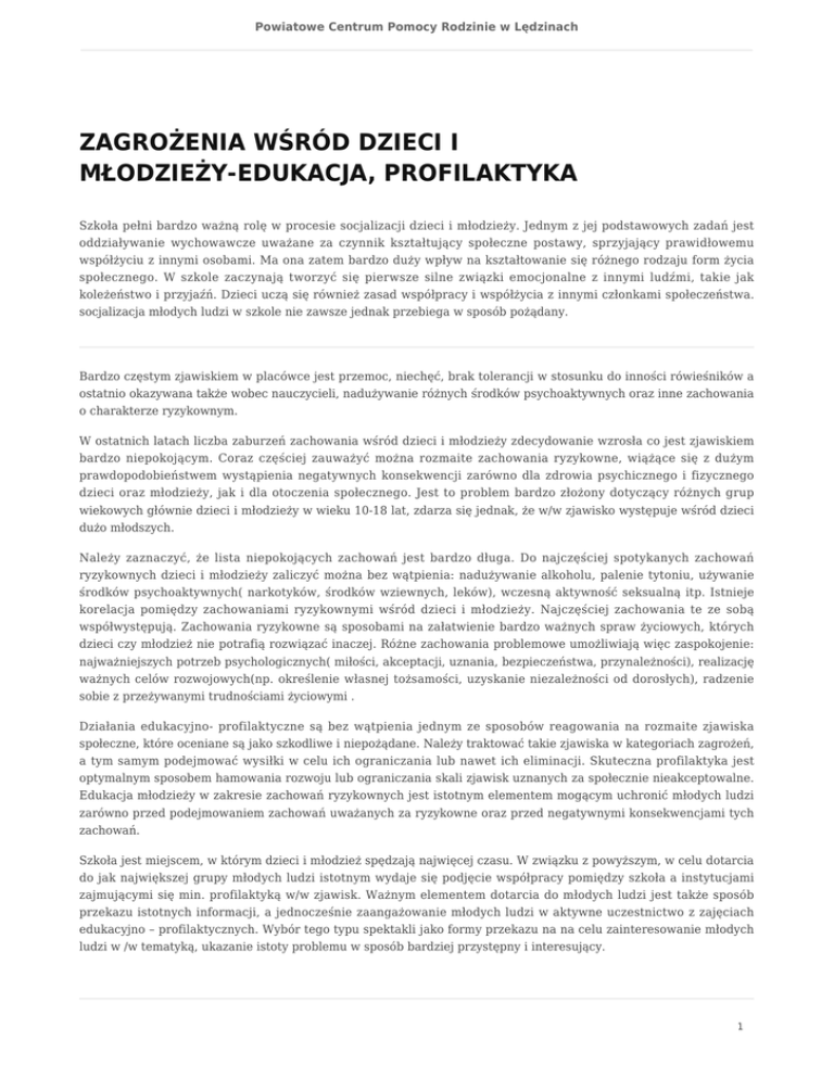 Powiatowe Centrum Pomocy Rodzinie w Lędzinach ZAGROŻENIA WŚRÓD DZIECI I MŁODZIEŻY-EDUKACJA, PROFILAKTYKA Szkoła pełni bardzo ważną rolę w procesie socjalizacji dzieci i młodzieży. Jednym z jej podstawowych zadań jest oddziaływanie wychowawcze uważane za czynnik kształtujący społeczne postawy, sprzyjający prawidłowemu współżyciu z innymi osobami. Ma ona zatem bardzo duży wpływ na kształtowanie się różnego rodzaju form życia społecznego. W szkole zaczynają tworzyć się pierwsze silne związki emocjonalne z innymi ludźmi, takie jak koleżeństwo i przyjaźń. Dzieci uczą się również zasad współpracy i współżycia z innymi członkami społeczeństwa. socjalizacja młodych ludzi w szkole nie zawsze jednak przebiega w sposób pożądany. Bardzo częstym zjawiskiem w placówce jest przemoc, niechęć, brak tolerancji w stosunku do inności rówieśników a ostatnio okazywana także wobec nauczycieli, nadużywanie różnych środków psychoaktywnych oraz inne zachowania o charakterze ryzykownym. W ostatnich latach liczba zaburzeń zachowania wśród dzieci i młodzieży zdecydowanie wzrosła co jest zjawiskiem bardzo niepokojącym. Coraz częściej zauważyć można rozmaite zachowania ryzykowne, wiążące się z dużym prawdopodobieństwem wystąpienia negatywnych konsekwencji zarówno dla zdrowia psychicznego i fizycznego dzieci oraz młodzieży, jak i dla otoczenia społecznego. Jest to problem bardzo złożony dotyczący różnych grup wiekowych głównie dzieci i młodzieży w wieku 10-18 lat, zdarza się jednak, że w/w zjawisko występuje wśród dzieci dużo młodszych. Należy zaznaczyć, że lista niepokojących zachowań jest bardzo długa. Do najczęściej spotykanych zachowań ryzykownych dzieci i młodzieży zaliczyć można bez wątpienia: nadużywanie alkoholu, palenie tytoniu, używanie środków psychoaktywnych( narkotyków, środków wziewnych, leków), wczesną aktywność seksualną itp. Istnieje korelacja pomiędzy zachowaniami ryzykownymi wśród dzieci i młodzieży. Najczęściej zachowania te ze sobą współwystępują. Zachowania ryzykowne są sposobami na załatwienie bardzo ważnych spraw życiowych, których dzieci czy młodzież nie potrafią rozwiązać inaczej. Różne zachowania problemowe umożliwiają więc zaspokojenie: najważniejszych potrzeb psychologicznych( miłości, akceptacji, uznania, bezpieczeństwa, przynależności), realizację ważnych celów rozwojowych(np. określenie własnej tożsamości, uzyskanie niezależności od dorosłych), radzenie sobie z przeżywanymi trudnościami życiowymi . Działania edukacyjno- profilaktyczne są bez wątpienia jednym ze sposobów reagowania na rozmaite zjawiska społeczne, które oceniane są jako szkodliwe i niepożądane. Należy traktować takie zjawiska w kategoriach zagrożeń, a tym samym podejmować wysiłki w celu ich ograniczania lub nawet ich eliminacji. Skuteczna profilaktyka jest optymalnym sposobem hamowania rozwoju lub ograniczania skali zjawisk uznanych za społecznie nieakceptowalne. Edukacja młodzieży w zakresie zachowań ryzykownych jest istotnym elementem mogącym uchronić młodych ludzi zarówno przed podejmowaniem zachowań uważanych za ryzykowne oraz przed negatywnymi konsekwencjami tych zachowań. Szkoła jest miejscem, w którym dzieci i młodzież spędzają najwięcej czasu. W związku z powyższym, w celu dotarcia do jak największej grupy młodych ludzi istotnym wydaje się podjęcie współpracy pomiędzy szkoła a instytucjami zajmującymi się min. profilaktyką w/w zjawisk. Ważnym elementem dotarcia do młodych ludzi jest także sposób przekazu istotnych informacji, a jednocześnie zaangażowanie młodych ludzi w aktywne uczestnictwo z zajęciach edukacyjno – profilaktycznych. Wybór tego typu spektakli jako formy przekazu na na celu zainteresowanie młodych ludzi w /w tematyką, ukazanie istoty problemu w sposób bardziej przystępny i interesujący. 1 Powiatowe Centrum Pomocy Rodzinie w Lędzinach Mając na uwadze powyższe Powiatowe Centrum Pomocy Rodzinie w Lędzinach opracowało Program Osłonowy "MÓJ WYBÓR MOJE ŻYCIE. Edukacja i profilaktyka jako istotne czynniki zmniejszające poziom zagrożenia wykluczeniem społecznym, 2016-2018 r.”, którego celem jest przeprowadzenie cyklu przedstawień. . W listopadzie odbyła się pierwsza edycja, która objęła szkoły gimnazjalne i ponadgimnazjalne. W ramach programu zorganizowano wspólnie z Teatrem Profilaktycznym Kurtyna z Krakowa w szkołach warsztaty, przedstawienia o charakterze profilaktycznym pt. „Twoje nowe jutro”, „Spacer po linie”,”Upadły Anioł”, „Bilet do raju”. Głównym celem programu jest zwiększenie wśród dzieci i młodzieży umiejętności zaspokajania potrzeb psychicznych i emocjonalnych w sposób akceptowany społecznie i przez to zmniejszenie poziomu zagrożenia wykluczeniem społecznym. Kolejny cykl przedstawień odbędzie się w 2017 roku. Zakładane rezultaty programu to: przeciwdziałanie agresji, kontrolowanie stresu, zarządzanie emocjami, zapobieganie zagrożeniom związanym ze środkami psychoaktywnymi itp. 2