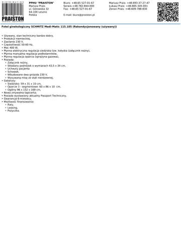 PPHU "PRAISTON" Mariusz Prais ul. Górowska 32 64-100 Leszno Polska Biuro: +48.65 527-01-67 Serwis:+48.782-844-000 Fax: +48.65 527-01-67 Mariusz Prais: +48.693-37-27-47 Łukasz Prais: +48.665-345-001 Zenon Prais: +48.609-788-830 E-mail: [email protected] Fotel ginekologiczny SCHMITZ Medi-Matic 115.105 (Rekondycjonowany (używany)) • Używany, stan techniczny bardzo dobry, • Produkcji niemieckiej, • Zasilanie 230 V, • Częstotliwość 50-60 Hz, • Moc 400 W, • Płynna elektryczna regulacja siedziska tzw. kołyska (załącznik nożny), • Płynna manualna regulacja podkolanników, • Płynna regulacja oparcia (sprężyna gazowa), • Posiada: ⚬ Załącznik nożny, ⚬ Składany podnóżek o wymiarach 43,5 x 34 cm, ⚬ Uchwyty pacjenta ⚬ Schowek, ⚬ Wbudowane dwa gniazda 230 V, ⚬ Wysuwaną misę ze stali nierdzewnej, • Gabaryty: ⚬ Siedzisko: 59 x 31 x 10 cm, ⚬ Oparcie 3 - segmentowe: 60 x 86 x 10 cm, ⚬ Ogólny 96 x 152 x 169 cm, • Nowa zmywalna tapicerka. • Posiada wystawiony aktualny Paszport Techniczny, • Gwarancja 6-miesiecy, • Możliwość finansowania: ⚬ Raty, ⚬ Leasing, ⚬ Pożyczka. www.praiston.pl 06-09-2013, 9:47:13