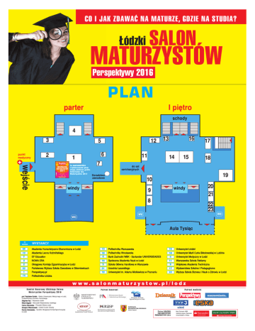 CO I JAK ZDAWAĆ NA MATURZE, GDZIE NA STUDIA? SALON Łódzki MATURZYSTÓW Perspektywy 2016 PLAN parter I piętro schody 4 3 2 punkt medyczny wejście + 12 5 6 1 Tu MATURZYŚCI i opiekunowie grup mogą odebrać gratis Informator dla Maturzystów 2017 11 7 16 13 14 15 17 18 do sal seminaryjnych Doradztwo zawodowe 19 10 windy windy 9 8 22 23 wc wc 20 21 wc Aula Tysiąc nr stoiska WYSTAWCY 20 Akademia Humanistyczno-Ekonomiczna w Łodzi 13 Politechnika Warszawska 15 Uniwersytet Łódzki 12 Akademia Leona Koźmińskiego Politechnika Wrocławska 16 Uniwersytet Marii Curie-Skłodowskiej w Lublinie 7 EF Education 18 6 Bank Zachodni WBK - Santander UNIVERSIDADES 4 Uniwersytet Medyczny w Łodzi 3 NOWA ERA 19 Społeczna Akademia Nauk w Łodzi 11 Warszawska Szkoła Reklamy 2 Okręgowa Komisja Egzaminacyjna w Łodzi 5 Szkoła Główna Handlowa w Warszawie 9 Wojskowa Akademia Techniczna 22 Państwowa Wyższa Szkoła Zawodowa w Skierniewicach 21 Uczelnia Łazarskiego 17 Wydawnictwa Szkolne i Pedagogiczne 1 14 Perspektywy.pl 10 Uniwersytet im. Adama Mickiewicza w Poznaniu 23 Wyższa Szkoła Biznesu i Nauk o Zdrowiu w Łodzi Politechnika Łódzka w w w. s a l o n m a t u r z y s t o w. p l / l o d z Komitet Honorowy ŁÓdzkiego Salonu Maturzystów Perspektywy 2016 prof. Radzisław Kordek – Rektor Uniwersytetu Medycznego w Łodzi, Przewodniczący Komitetu Honorowego Zbigniew Rau – Wojewoda Łódzki Witold Stępień – Marszałek Województwa Łódzkiego Hanna Zdanowska – Prezydent Miasta Łodzi Grzegorz Wierzchowski – Łódzki Kurator Oświaty Danuta Zakrzewska – Dyrektor Okręgowej Komisji Egzaminacyjnej w Łodzi Patroni honorowi Patroni medialni Okręgowa Komisja Egzaminacyjna w Łodzi Konferencja Rektorów Akademickich Szkół Polskich Partner SALONU MATURZYSTÓW PERSPEKTYWY 2016 Bank Zachodni WBK realizuje program Santander Universidades w Polsce