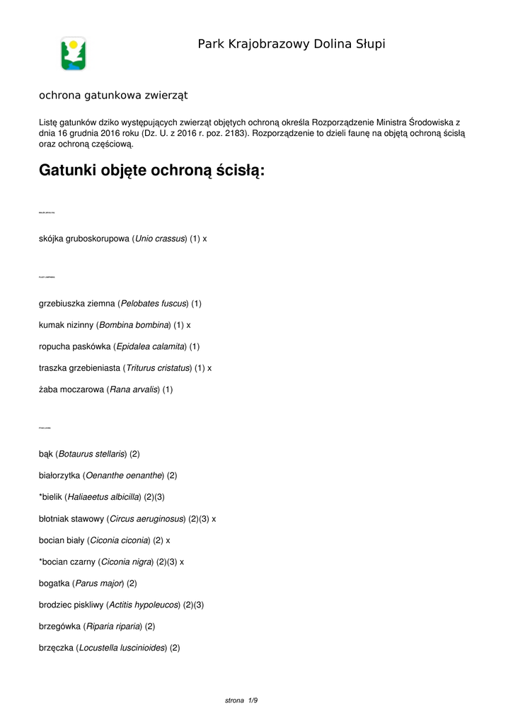 Park Krajobrazowy Dolina Słupi ochrona gatunkowa zwierząt Listę gatunków dziko występujących zwierząt objętych ochroną określa Rozporządzenie Ministra Środowiska z dnia 16 grudnia 2016 roku (Dz. U. z 2016 r. poz. 2183). Rozporządzenie to dzieli faunę na objętą ochroną ścisłą oraz ochroną częściową. Gatunki objęte ochroną ścisłą: MAŁŻE (BIVALVIA) skójka gruboskorupowa (Unio crassus) (1) x PŁAZY (AMPHIBIA) grzebiuszka ziemna (Pelobates fuscus) (1) kumak nizinny (Bombina bombina) (1) x ropucha paskówka (Epidalea calamita) (1) traszka grzebieniasta (Triturus cristatus) (1) x żaba moczarowa (Rana arvalis) (1) PTAKI (AVES) bąk (Botaurus stellaris) (2) białorzytka (Oenanthe oenanthe) (2) *bielik (Haliaeetus albicilla) (2)(3) błotniak stawowy (Circus aeruginosus) (2)(3) x bocian biały (Ciconia ciconia) (2) x *bocian czarny (Ciconia nigra) (2)(3) x bogatka (Parus major) (2) brodziec piskliwy (Actitis hypoleucos) (2)(3) brzegówka (Riparia riparia) (2) brzęczka (Locustella luscinioides) (2) strona 1/9 cierniówka (Sylvia communis) (2) cyranka (Anas querquedula) (2) x czajka (Vanellus vanellus) (2) x czarnogłówka (Poecile montanus) (2) czubatka (Lophophanes cristatus) (2) czyż (Spinus spinus) (2) derkacz (Crex crex) (2) x droździk (Turdus iliacus) (2) dudek (Upupa epops) (2) x dymówka (Hirundo rustica) (2) dzięcioł czarny (Dryocopus martius) (2) x dzięcioł duży (Dendrocopos major) (2) dzięcioł średni (Dendrocopos medius) (2) x dzięcioł zielony (Picus viridis) (2) x dzięciołek (Dendrocopos minor) (2) dziwonia (Erythrina erythrina) (2) dzwoniec (Chloris chloris) (2) gągoł (Bucephala clangula) (2) x gajówka (Sylvia borin) (2) gawron (Corvus frugilegus) (2) - osobniki poza obszarem administracyjnym miast gąsiorek (Lanius collurio) (2) gil (Pyrrhula pyrrhula) (2) grubodziób (Coccothraustes coccothraustes) (2) jarzębatka (Sylvia nisoria) (2) jastrząb (Accipiter gentilis) (2)(3) jemiołuszka (Bombycilla garrulus) (2) jer (Fringilla montifringilla) (2) jerzyk (Apus apus) (2) x *kania czarna (Milvus migrans) (2)(3) x strona 2/9 *kania ruda (Milvus milvus) (2)(3) x kapturka (Sylvia atricapilla) (2) kawka (Corvus monedula) (2) kobuz (Falco subbuteo) (2)(3) x kokoszka (Gallinula chloropus) (2) kopciuszek (Phoenicurus ochruros) (2) kos (Turdus merula) (2) kowalik (Sitta europaea) (2) krętogłów (Jynx torquilla) (2) krogulec (Accipiter nisus) (2)(3) kropiatka (Porzana porzana) (2) x krwawodziób (Tringa totanus) (2)(3) x kszyk (Gallinago gallinago) (2)(3) kukułka (Cuculus canorus) (2) kulczyk (Serinus serinus) (2) kwiczoł (Turdus pilaris) (2) lelek (Caprimulgus europaeus) (2) lerka (Lullula arborea) (2) łabędź krzykliwy (Cygnus cygnus) (2) łabędź niemy (Cygnus olor) (2) łozówka (Acrocephalus palustris) (2) makolągwa (Linaria cannabina) (2) mazurek (Passer montanus) (2) modraszka (Cyanistes caeruleus) (2) muchołówka mała (Ficedula parva) (2) muchołówka szara (Muscicapa striata) (2) muchołówka żałobna (Ficedula hypoleuca) (2) mysikrólik (Regulus regulus) (2) myszołów (Buteo buteo) (2)(3) strona 3/9 nurogęś (Mergus merganser) (2) x oknówka (Delichon urbicum) (2) *orlik krzykliwy (Clanga pomarina) (2)(3) x orzechówka (Nucifraga caryocatactes) (2) paszkot (Turdus viscivorus) (2) pełzacz leśny (Certhia familiaris) (2) pełzacz ogrodowy (Certhia brachydactyla) (2) perkoz dwuczuby (Podiceps cristatus) (2) perkoz rdzawoszyi (Podiceps grisegena) (2) perkozek (Tachybaptus ruficollis) (2) piecuszek (Phylloscopus trochilus) (2) piegża (Sylvia curruca) (2) pierwiosnek (Phylloscopus collybita) (2) pleszka (Phoenicurus phoenicurus) (2) pliszka górska (Motacilla cinerea) (2) pliszka siwa (Motacilla alba) (2) pliszka żółta (Motacilla flava) (2) pluszcz (Cinclus cinclus) (2) płaskonos (Anas clypeata) (2) x płomykówka (Tyto alba) (2)(3) x pokląskwa (Saxicola rubetra) (2) pokrzywnica (Prunella modularis) (2) potrzeszcz (Emberiza calandra) (2) potrzos (Emberiza schoeniclus) (2) przepiórka (Coturnix coturnix) (2) *puchacz (Bubo bubo) (2)(3) x pustułka (Falco tinnunculus) (2) x puszczyk (Strix aluco) (2) raniuszek (Aegithalos caudatus) (2) strona 4/9 remiz (Remiz pendulinus) (2) rokitniczka (Acrocephalus schoenobaenus) (2) rudzik (Erithacus rubecula) (2) rybitwa rzeczna (Sterna hirundo) (2)(3) x *rybołów (Pandion haliaetus) (1) (3) x samotnik (Tringa ochropus) (2)(3) x sierpówka (Streptopelia decaocto) (2) sieweczka rzeczna (Charadrius dubius) (2) sikora uboga (Poecile palustris) (2) siniak (Columba oenas) (2) skowronek (Alauda arvensis) (2) słowik szary (Luscinia luscinia) (2) sosnówka (Periparus ater) (2) sójka (Garrulus glandarius) (2) *sóweczka (Glaucidium passerinum) (2)(3) x srokosz (Lanius excubitor) (2) strumieniówka (Locustella fluviatilis) (2) strzyżyk (Troglodytes troglodytes) (2) szczygieł (Carduelis carduelis) (2) *szlachar (Mergus serrator) (2) x szpak (Sturnus vulgaris) (2) śmieszka (Chroicocephalus ridibundus) (2) śpiewak (Turdus philomelos) (2) świergotek drzewny (Anthus trivialis) (2) świergotek łąkowy (Anthus pratensis) (2) świergotek polny (Anthus campestris) (2) świerszczak (Locustella naevia) (2) świstunka leśna (Phylloscopus sibilatrix) (2) trzciniak (Acrocephalus arundinaceus) (2) strona 5/9 trzcinniczek (Acrocephalus scirpaceus) (2) trzmielojad (Pernis apivorus) (2)(3) trznadel (Emberiza citrinella) (2) turkawka (Streptopelia turtur) (2) uszatka (Asio otus) (2) wilga (Oriolus oriolus) (2) *włochatka (Aegolius funereus) (2)(3) x wodnik (Rallus aquaticus) (2) wróbel (Passer domesticus) (2) x zaganiacz (Hippolais icterina) (2) zięba (Fringilla coelebs) (2) zimorodek (Alcedo atthis) (2) zniczek (Regulus ignicapilla) (2) żuraw (Grus grus) (2) SSAKI (MAMMALIA) **borowiec wielki (Nyctalus noctula) (1)(3) x **gacek brunatny (Plecotus auritus) (1)(3) x **karlik drobny (Pipistrellus pygmaeus) (1)(3) x **karlik malutki (Pipistrellus pipistrellus) (1)(3) x **karlik większy (Pipistrellus nathusi