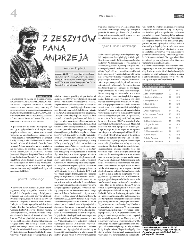 4 17 lipca 2009, nr 16 Stanisław Kaczmarczyk. Więcej goli tego dnia nie padło i ROW mógł cieszyć się z kompletu punktów. W meczu tym debiut zaliczył Joachim Siury, a zielono-czarni opuścili pozycję czerwonej latarni awansując o dwie lokaty. wali punkt. W ostatniej kolejce rundy jesiennej do Rybnika przyjechał lider II ligi – Bałtyk Gdynia. ROW w 1. połowie zagrał nieźle i zasłużenie prowadził po strzale Śmietany, który wykorzystał zamieszanie podbramkowe. Niespodziewanie tuż przed przerwą ostro zaatakowali przyjezdni i po „serii kąśliwych strzałów, z których dwa trafiły w słupek, jeden bramkarza, a ostatni znalazł drogę do siatki” gdynianie wyrównali. Strata ta zdeprymowała rybniczan, którzy po przerwie oddali inicjatywę i stracili drugą bramkę. W końcówce jednak ROW się przebudził i w 84. minucie po precyzyjnym strzale z 30 metrów Ochmańskiego uratował remis. Ostatecznie nasza drużyna udawała się na zimową przerwę na 14. pozycji w tabeli (do III ligi spadały drużyny z miejsc 13-16). Podbudowani jednak niezłym w ich wykonaniu ostatnim meczem z Bałtykiem mieli nadzieje na szybkie wydostanie się wiosną ze strefy spadkowej. ojciec Lukasa Podolskiego urodzony 22. 10. 1948 roku w Czerwionce. Rozpoczynał karierę w Górniku 23 Chwałowice, kontynuował ją w KS ROW Rybnik. Później zajął się trenerką. Od 2003 roku pracuje w KS Energetyk ROW. Z żoną Sylwią i córką Mają mieszka w Żorach. Łukasz Kozik Drugi sezon po spadku do II ligi przyniósł kolejne rozczarowanie. Piłkarze ROW Rybnik nie liczyli się w walce o awans do najwyższej klasy rozgrywkowej i zajęli 7. lokatę. W przerwie letniej w 1979 roku nastąpiła zmiana na stanowisku szkoleniowca. Pawła Kowalskiego zastąpił były piłkarz popularnej „Przykopy” w latach 60. Rainhold Pilarek. Nie zagrzał on jednak w klubie na długo miejsca. W październiku, po około 10 kolejkach jego funkcję przejął Józef Golla. Kadra rybnickiego zespołu przed tymi rozgrywkami została raczej wzmocniona, aniżeli osłabiona. Naszą drużynę opuścili jedynie Krzysztof Oczko (zakończył krótką karierę), Rudolf Golda (wrócił do Polonii Bytom) i Marian Wilim (zasilił Górnika Czerwionka). Zielono-czarne barwy przywdziali po raz pierwszy za to: Waldemar Podolski (Concordia Knurów), Ryszard Ochmański (Victoria Jaworzno), Zbigniew Skrzyński (Oława), Joachim Siury (Podlesianka Katowice) oraz Leszek Kuś i Józef Olma (obaj z drużyny juniorów, ten drugi był nawet kapitanem Reprezentacji Polski juniorów). Mimo tego, ROW w sezonie 1979/80 grał fatalnie i do ostatniej kolejki bronił się przed spadkiem do III ligi. powrót Frydeckiego W pierwszym meczu rybniczanie, mimo ambitnej postawy, ulegli na wyjeździe Górnikowi Wałbrzych 0:2. „Gospodarze mogli zdobyć jeszcze 2 bramki, lecz Janikowski, który świetnie spisywał się w polu, niestety miał źle nastawiony celownik” – czytamy w Zeszycie Pana Andrzeja. Podopieczni Pilarka wystąpili w składzie: Jerzy Fojcik – Bogdan Gunia, Jerzy Trefoń, Andrzej Gramza, Piotr Piekarczyk – Henryk Manek, Andrzej Grzywacz, Bernard Bytomski – Wojciech Rabenda, Franciszek Krótki, Marian Dutkiewicz. Tydzień później zielono-czarni przed własną publicznością podejmowali beniaminka drugiego frontu – Stal Stocznię Szczecin. Debiut pod okiem nowego trenera zaliczyli Eugeniusz Żywica (w wyjściowej jedenastce) oraz Eugeniusz Pytlik i Mieczysław Leszczyński (z ławki rezerwowych). W pierwszej połowie spotkania gra miała wyrównany przebieg, ale pod koniec tej części meczu ROW wykorzystał chwilę nieuwagi rywala i wbił mu dwie bramki (Żywica i Manek). Po przerwie nasi piłkarze wyszli na murawę zdekoncentrowani i pozwolili przyjezdnym wyrównać. Również pojedynek 3. kolejki na wyjeździe z Piastem Gliwice nie przyniósł rozstrzygnięcia. Zastępujący między słupkami Fojcika Adam Szczucki zachował czyste konto, podobnie, jak jego vis a vis – Jerzy Apostel. Pierwszy jesienny mecz zagrał wówczas Tadeusz Śmietana, a debiut w barwach ROW zaliczył Leszek Kuś. 26 sierpnia 1979 roku po wielomiesięcznej przerwie spowodowanej kontuzją do składu popularnej „Przykopy” wrócił Andrzej Frydecki. Historia zatoczyła koło, bowiem rywalem zielono-czarnych była Małapanew Ozimek, czyli ekipa, z którą ROW grał wtedy, gdy Frydecki nabawił się tego poważnego urazu. Wówczas rybniczanie ograli rywali na wyjeździe 3:0. Tym razem niestety było dużo gorzej. W całym meczu nie działo się zbyt wiele. Dopiero końcówka przyniosła nieco emocji. Najpierw zaatakowali rybniczanie, ale dobrej akcji Krótkiego nie potrafił wykończyć Grzywacz. W odpowiedzi przycisnęli przyjezdni i niespodziewanie przechylili losy spotkania na swoją korzyść wbijając jedynego gola meczu w 87. minucie. Kryzys w drużynie ROW trwał więc nadal, a jego piłkarze „sprawiali wrażenie jakby nie mogli znaleźć sobie miejsca na boisku”. Tego stanu rzeczy nie zmieniło nawet pierwsze jesienne wejście na boisko Jerzego Fabera. Identycznymi rezultatami zakończyły się dwa kolejne wyjazdowe pojedynki rybniczan, którzy przegrali 0:1 zarówno w Gorzowie z miejscowym Stilonem (w obecności 9 tysięcy widzów debiut w zielono-czarnych barwach Ryszarda Ochmańskiego), jak i w Gdańsku z miejscowym Stoczniowcem (bramka w 89. minucie). ROW po tej serii porażek utknął na dnie ligowej tabeli z dorobkiem 2 punktów i bilansem bramkowym 2:7. Dopiero mecz 7. kolejki przyniósł naszej drużynie pierwsze w sezonie 1979/80 zwycięstwo. W pojedynku z Lechią Gdańsk na własnym stadionie, rybniczanie mieli od początku przewagę. W 23. minucie dobrze ustawiony Frydecki wykorzystał podanie Dutkiewicza i wyprowadził swoją ekipę na prowadzenie. W 2. połowie do ataku ruszyli przyjezdni, ale nadziali się na kontrę, którą zakończył celnym uderzeniem z 20 metrów grający po raz pierwszy w tym sezonie TABELA II LIGI (