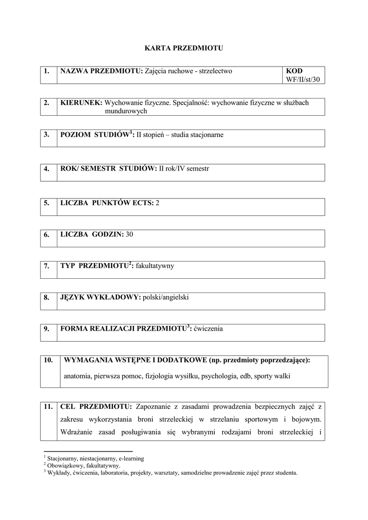 KARTA PRZEDMIOTU 1. NAZWA PRZEDMIOTU: Zajęcia ruchowe - strzelectwo 2. KIERUNEK: Wychowanie fizyczne. Specjalność: wychowanie fizyczne w służbach mundurowych 3. POZIOM STUDIÓW1: II stopień – studia stacjonarne 4. ROK/ SEMESTR STUDIÓW: II rok/IV semestr 5. LICZBA PUNKTÓW ECTS: 2 6. LICZBA GODZIN: 30 7. TYP PRZEDMIOTU2: fakultatywny 8. JĘZYK WYKŁADOWY: polski/angielski 9. FORMA REALIZACJI PRZEDMIOTU3: ćwiczenia 10. KOD WF/II/st/30 WYMAGANIA WSTĘPNE I DODATKOWE (np. przedmioty poprzedzające): anatomia, pierwsza pomoc, fizjologia wysiłku, psychologia, edb, sporty walki 11. CEL PRZEDMIOTU: Zapoznanie z zasadami prowadzenia bezpiecznych zajęć z zakresu wykorzystania broni strzeleckiej w strzelaniu sportowym i bojowym. Wdrażanie zasad posługiwania się wybranymi rodzajami broni strzeleckiej i 1 Stacjonarny, niestacjonarny, e-learning Obowiązkowy, fakultatywny. 3 Wykłady, ćwiczenia, laboratoria, projekty, warsztaty, samodzielne prowadzenie zajęć przez studenta. 2 paintballowej pod kątem poznania specyfiki ich wykorzystania w działaniach sportowych, rywalizacjach i zawodach sportowo-obronnych, działaniu praktycznym oraz zawodowym. Opanowanie podstawowych umiejętności strzeleckich przy użyciu pistoletu samopowtarzalnego oraz broni gładkolufowej. 12. PRZEDMIOTOWE EFEKTY KSZTAŁCENIA4 P_W01. Zna szczegółowo przepisy zawarte w ustawie o broni i amunicji i wzorcowego Odniesienie do kierunkowych efektów kształcenia (symbol) Odniesienie do obszarowych efektów kształcenia i standardów kształcenia nauczycieli (symbol) K_W02 K_W09 M2_W04 M2_W08 M2_W07 M2_W11 M2_W12 K_W02 K_W09 M2_W04 M2_W08 M2_W07 M2_W11 M2_W12 K_W02 K_W09 M2_W04 M2_W08 M2_W07 M2_W11 M2_W12 K_W09 M2_W07 M2_W11 M2_W12 K_U15 M2_U11 K_U06 K_U08 M2_U07 M2_U05 M2_U04 M2_U07 M2_U07 M2_U05 M2_U04 regulaminu strzelnic. P_W02. Potrafi wyjaśnić pojęcia związane z bronią ujęte w ustawie o broni i amunicji oraz zna podstawowe metody, formy i ćwiczenia ukierunkowane na doskonalenie umiejętności strzeleckich. P_W03. Zna podstawowe jednostki broni palnej i sportowej oraz umie rozłożyć i złożyć wybrane jednostki. P_W04. Zna cele i zadania ćwiczeń na „sucho” z bronią. P_U01. Posiada odpowiedni poziom sprawności strzeleckiej, tj. uzyskuje łącznie co najmniej 25 pkt. w zakresie testów strzeleckich objętych egzaminem na patent strzelecki. P_U02. Potrafi zaplanować i przeprowadzić rozgrzewkę w zależności o charakteru strzelania. P_U03. Potrafi wykonać pokaz podstawowych ćwiczeń z bronią mających na celu opanowanie 4 K_U06 K_U08 Efekty kształcenia w zakresie wiedzy (P_W), umiejętności (P_U) i kompetencji społecznych (P_K). poszczególnych jednostek broni. P_U04. Potrafi własnych działań umiejętność dokonać z krytycznej bronią określania M2_U07 palną. własnych analizy Posiada braków K_U06 K_U08 M2_U07 M2_U05 M2_U04 M2_U07 K_K08 M2_K05 M2_K07 K_K01 K_K08 M2_K05 M2_K07 i niedociągnięć oraz pracy nad ich niwelowaniem. P_K01. Rozumie i zna zasady bezpiecznego posługiwania się bronią. P_K02. Posiada umiejętność samooceny w zakresie postawy strzeleckiej. 13. METODY OCENY EFEKTÓW KSZTAŁCENIA Typ oceny6 zaliczenie pisemne formująca P_W02 zaliczenie pisemne formująca P_W03 ocenianie ciągłe oraz zaliczenie pisemne ocenianie ciągłe formująca P_U01 test strzelecki w ramach egzaminu na patent strzelecki podsumowująca P_U02 ocenianie ciągłe formująca P_U03 ocenianie ciągłe formująca P_U04 ocenianie ciągłe formująca P_K01 zaliczenie pisemne podsumowująca P_K02 zaliczenie pisemne podsumowująca P_W04 5 Metody (sposoby) oceny5 Symbol przedmiotowego efektu kształcenia P_W01 formująca Forma dokumentacji praca pisemna, kontrola obecności praca pisemna, kontrola obecności praca pisemna, kontrola obecności konspekt rozgrzewki, kontrola obecności zestawienie elektroniczne, kontrola obecności konspekt rozgrzewki, kontrola obecności konspekt zajęć, kontrola obecności konspekt zajęć, kontrola obecności praca pisemna, kontrola obecności praca pisemna, kontrola obecności Ocenianie ciągłe (bieżące przygotowanie do zajęć), śródsemestralne zaliczenie pisemne, śródsemestralne zaliczenie ustne, końcowe zaliczenia pisemne, końcowe zaliczenia ustne, egzamin pisemny, egzamin ustny, praca semestralna, ocena umiejętności ruchowych, praca dyplomowa, projekt, kontrola obecności 6 Formująca, podsumowująca. 14. TREŚCI PROGRAMOWE Forma zajęć7 (liczba godz.) Treść zajęć 1. Omówienie programu, regulaminu zajęć. bezpieczeństwa warunków zaliczenia, Organizacja podczas i strzelania. zasady Symbol przedmiotowych efektów kształcenia ćwiczenia (2) P_W01, P_W02, ćwiczenia (2) P_W02, P_W03, ćwiczenia (2) P_W01, P_W02 ćwiczenia (2) P_W04, P_U04 ćwiczenia (2) P_W01, P_W02, ćwiczenia (2) P_W03, P_W04, ćwiczenia (2) P_W01, P_W02 ćwiczenia (2) P_W01, P_W02, P_K01 Pierwsza pomoc i zabezpieczenie medyczne w miejscu ćwiczeń. Przepisy bezpieczeństwa na strzelnicach. 2. Budowa broni strzeleckiej i paintballowej. Zasady działania broni. Budowa pistoletów wojskowych, P_K01 broni paintball, zasady bezpiecznego obchodzenia się z bronią, zasady czyszczenia oraz konserwacji broni. Składanie i rozkładanie broni. 3. Podstawy balistyki, zjawisko strzału, tory lotu pocisku i pole rażenia. 4. Nauczanie przyjmowanie strzeleckich. różnych Zgrywanie postaw przyrządów celowniczych. 5. Przepisy normujące posiadanie broni i amunicji oraz działalność strzelecką w LOK. 6. Strzelanie z różnych postaw strzeleckich. Strzelanie statyczne, dynamiczne i sytuacyjne. 7. Sportowe konkurencje strzeleckie, klasy i odznaki strzeleckie. Rodzaje strzelań wojskowych P_K01 P_U04, P_K02 /policyjnych/. 8. Organizacja zajęć strzeleckich, osoby funkcyjne, budowa strzelnic, zasady bezpieczeństwa. Strzelanie statyczne i dynamiczne, strzelania P_W04, P_U02, P_U03 sytuacyjne. 9. Wpływ wysiłku na sprawność strzelecką, strzelania w ubiorze sportowym, umundurowani